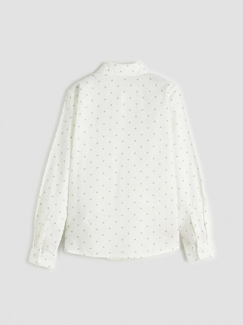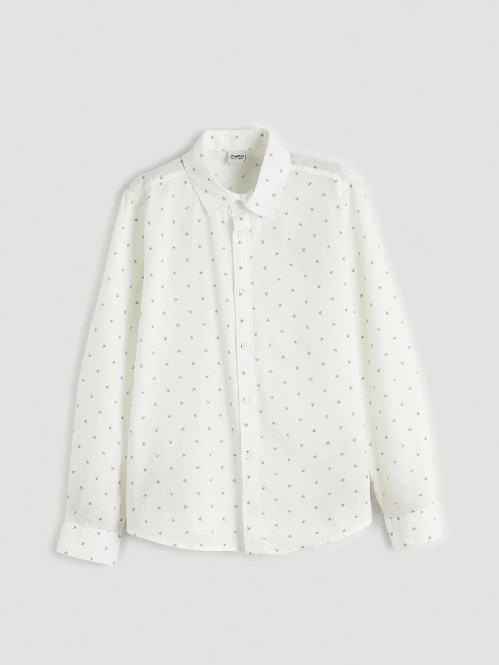 Desenli, uzun kollu erkek çocuk gömlek, %100 pamuk kumaştan üretilmiştir ve önden düğme kapamalıdır.
