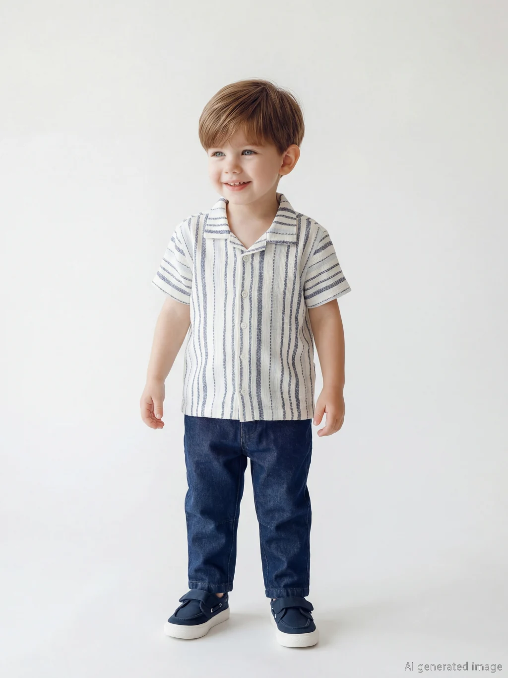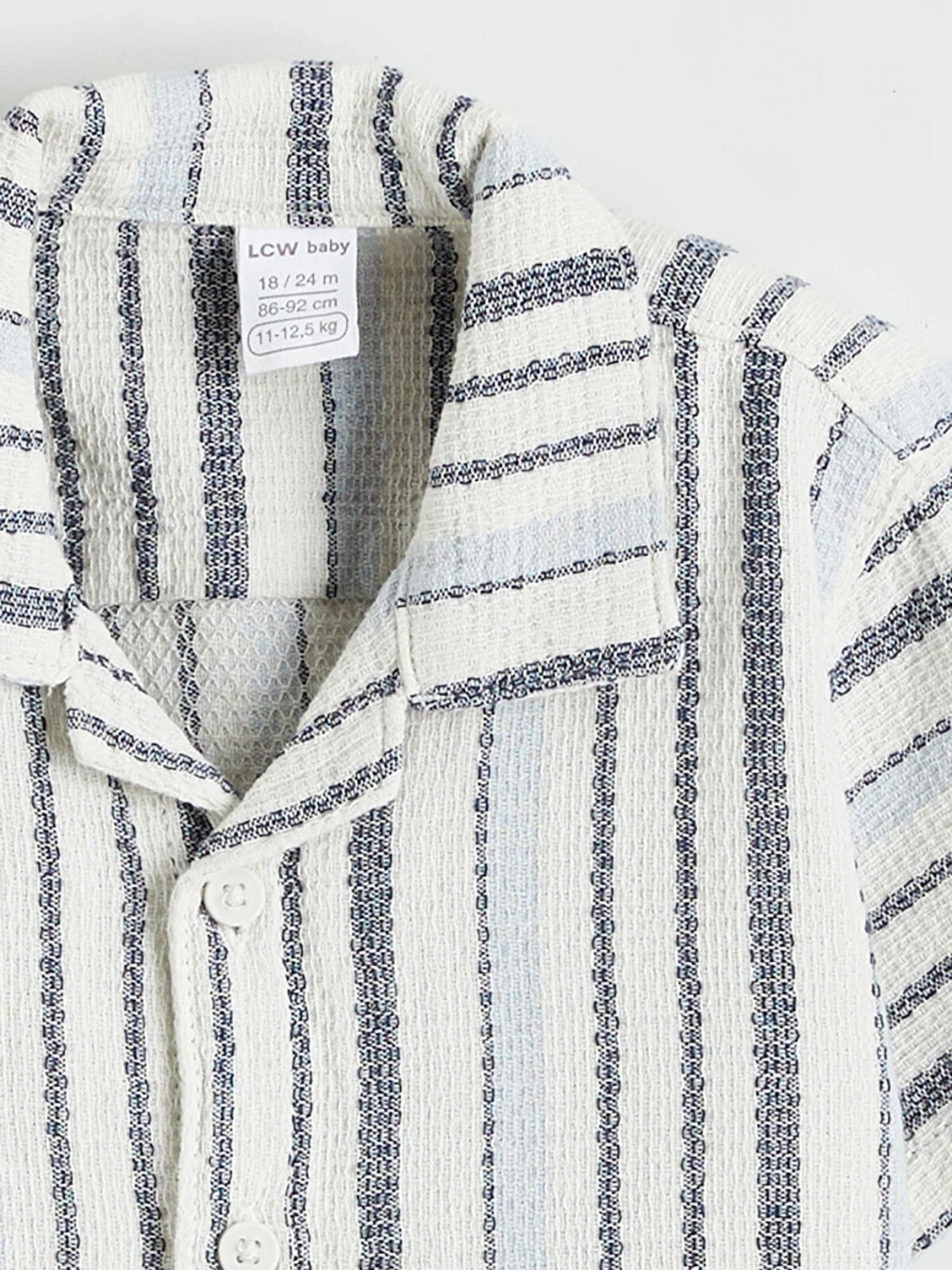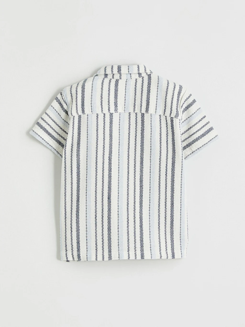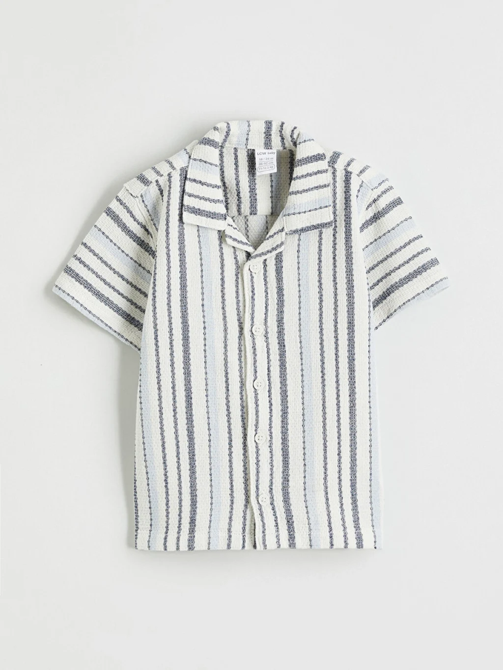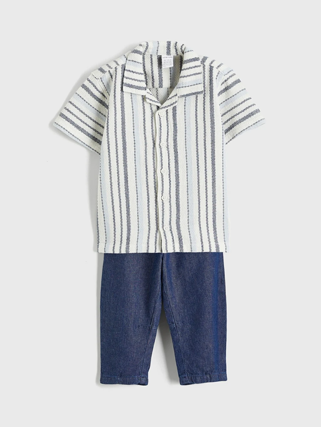 Resort yaka, kısa kollu ve düğme kapamalı çizgili gömlek ile pantolondan oluşan erkek bebek takım, %100 pamuk armürlü kumaştan üretilmiştir.