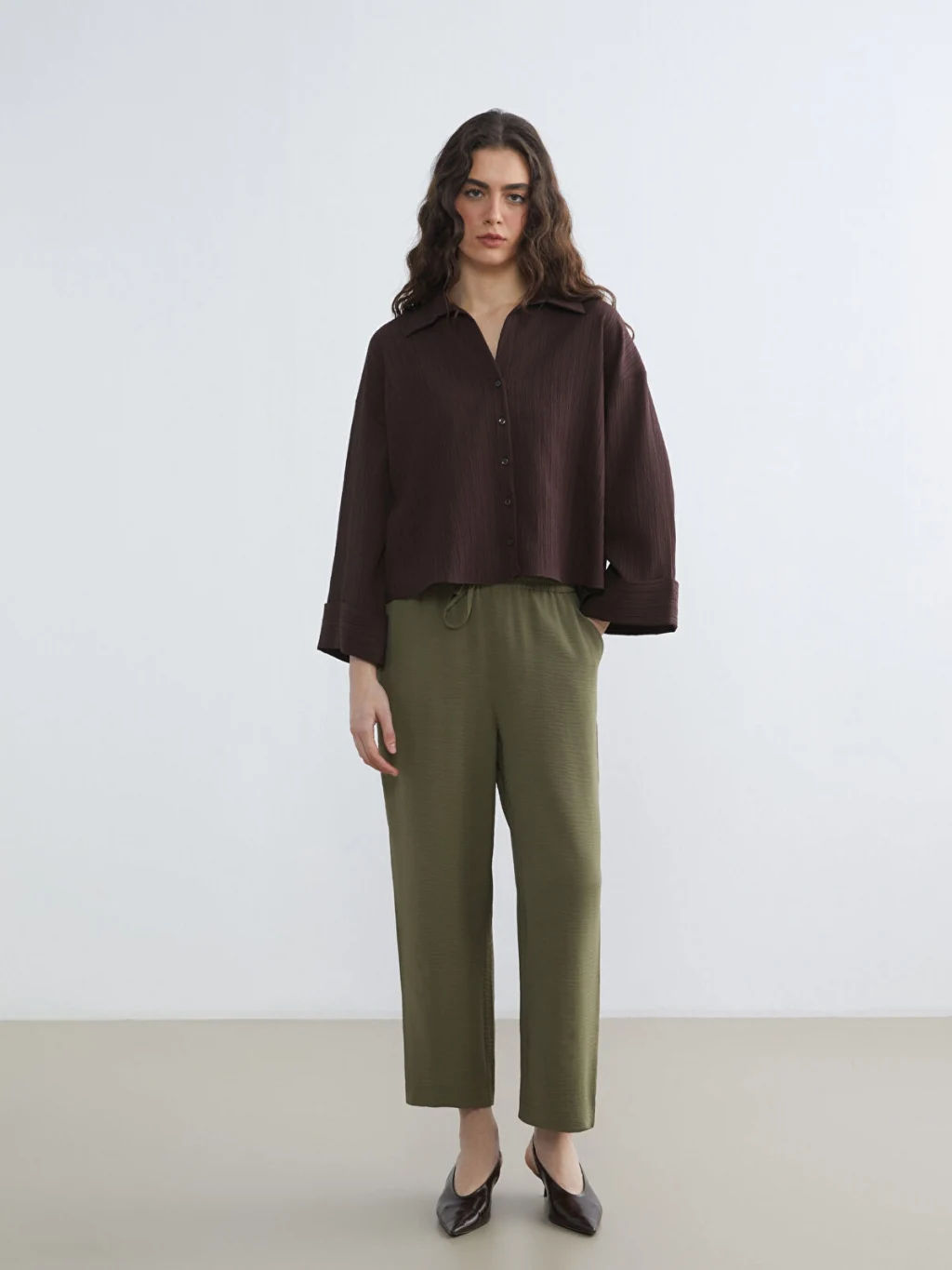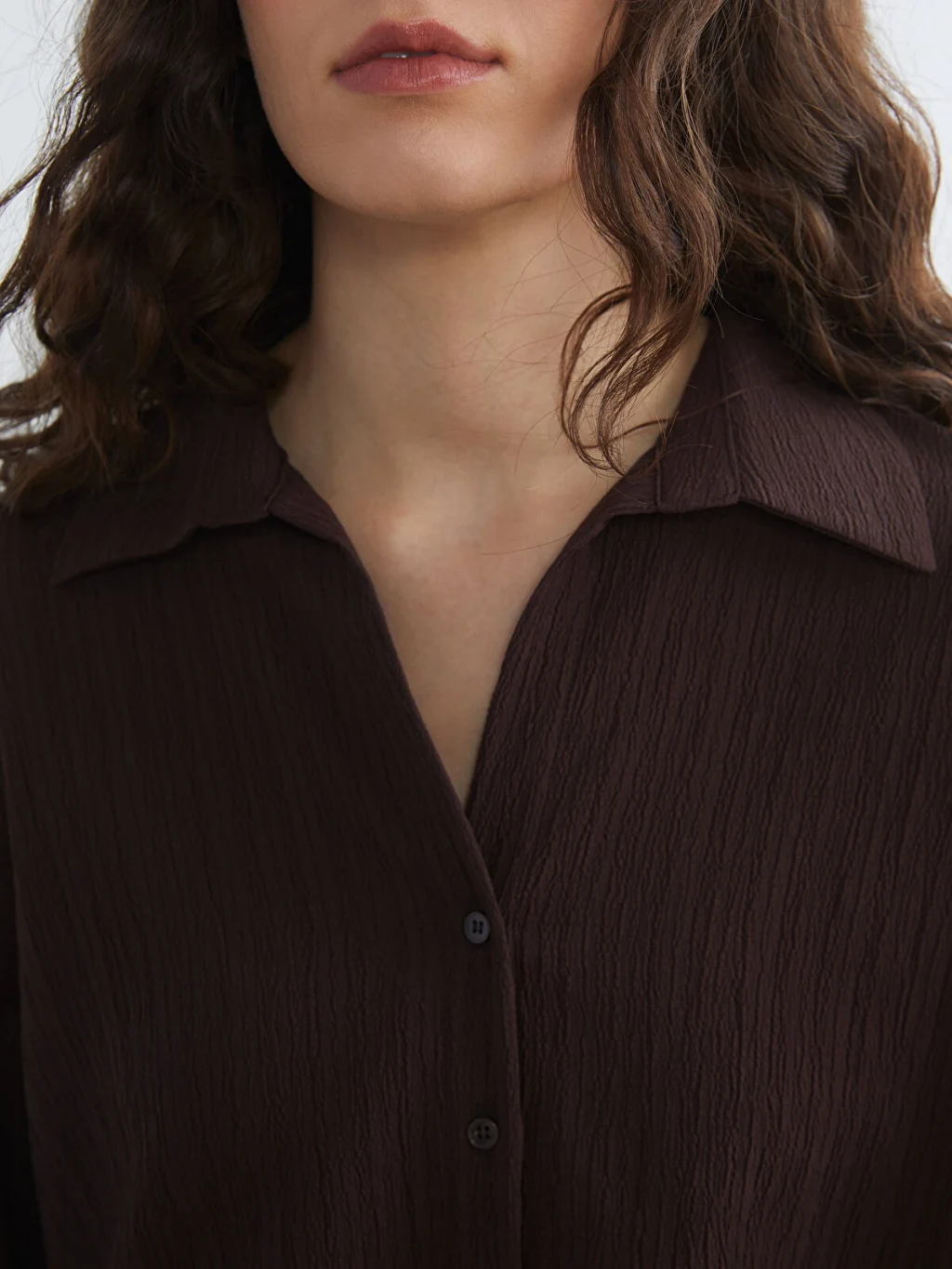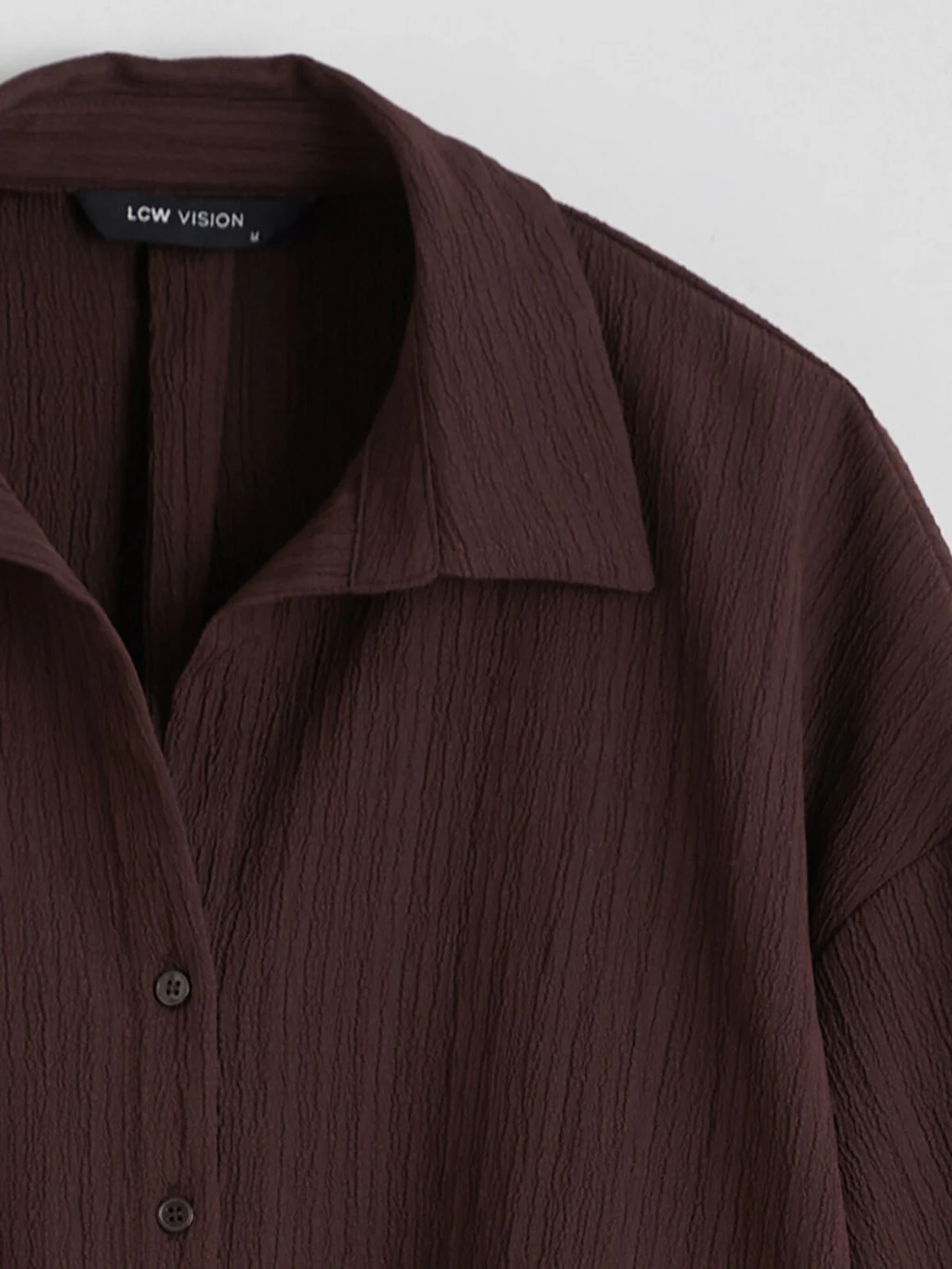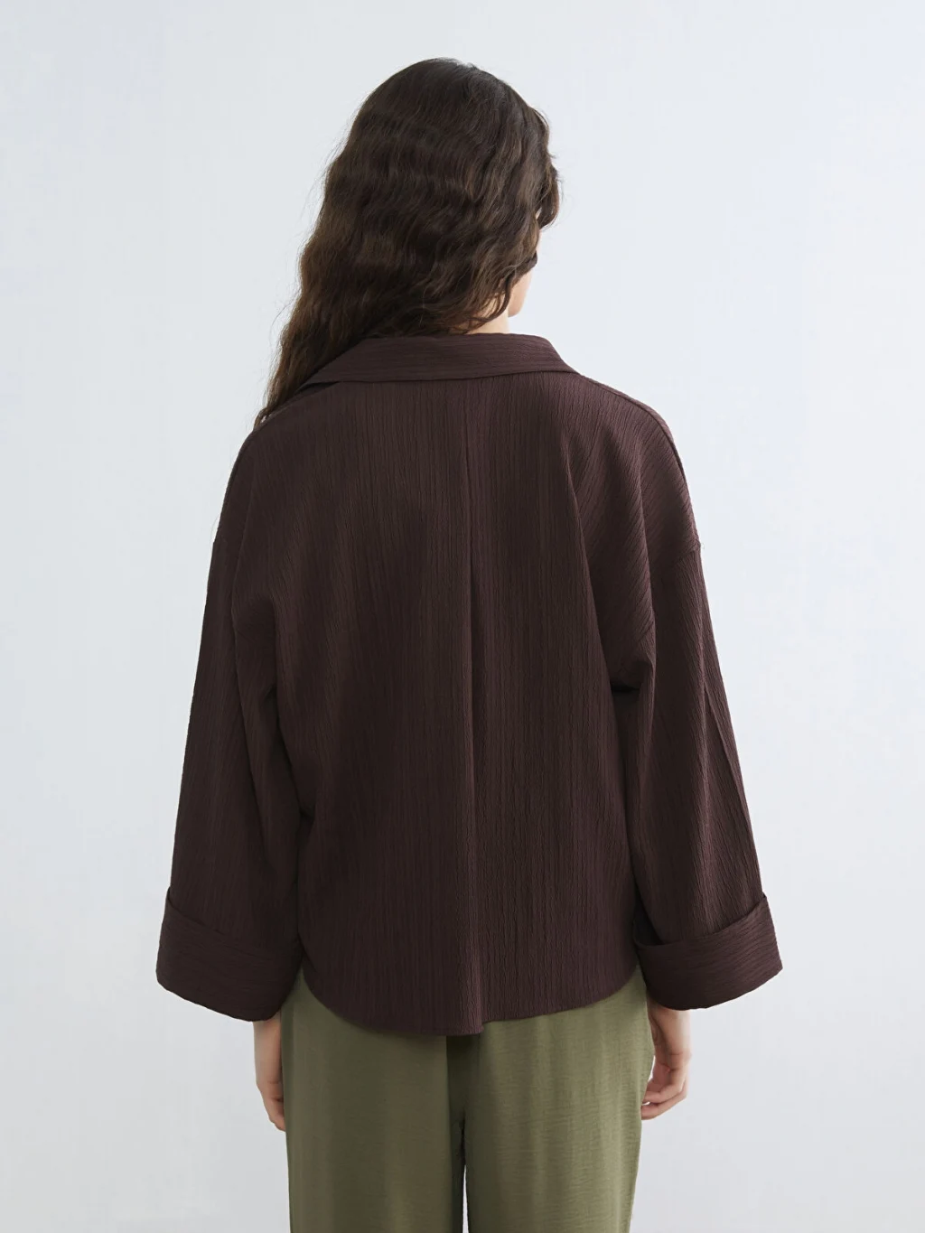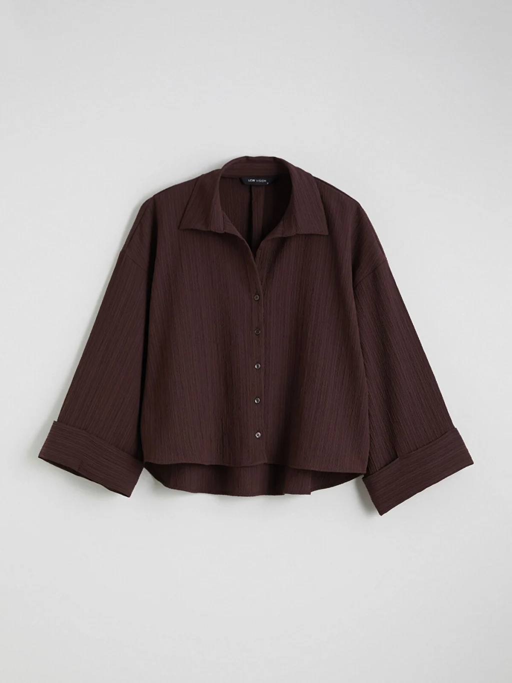 Geniş manşetli ve uzun kollu kadın gömlek, dokulu kumaştan üretilmiştir ve önden düğme kapamalıdır.