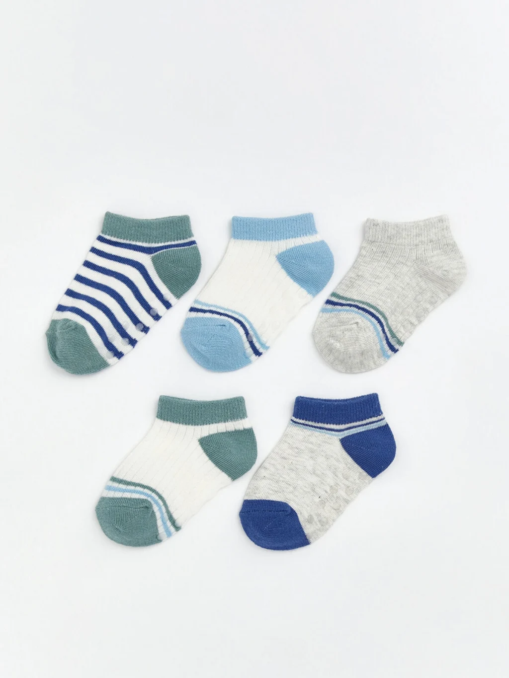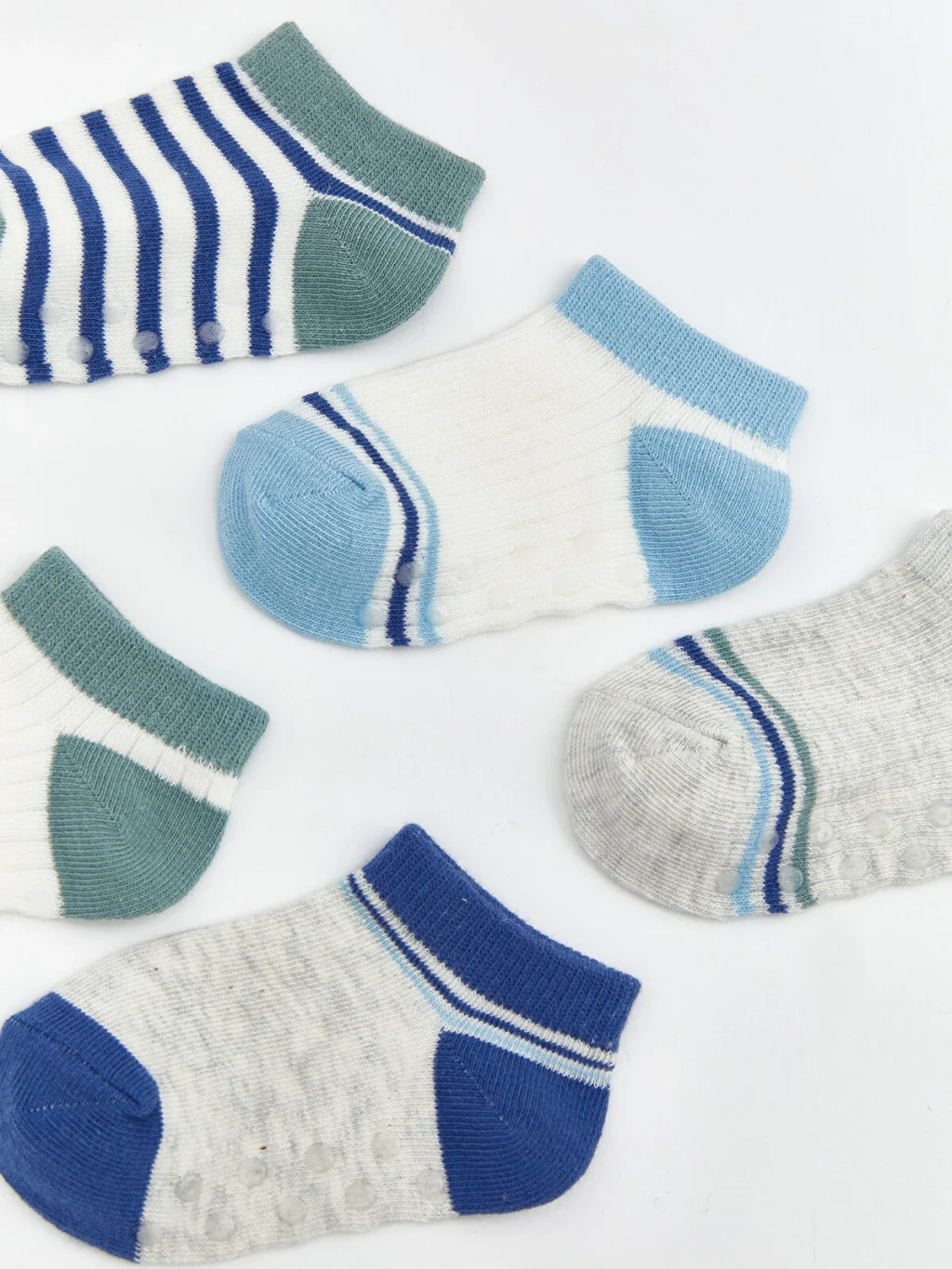 Çizgili ve farklı desenli modellerden oluşan, ribana bilekli erkek bebek patik çorap seti beş çifttir.