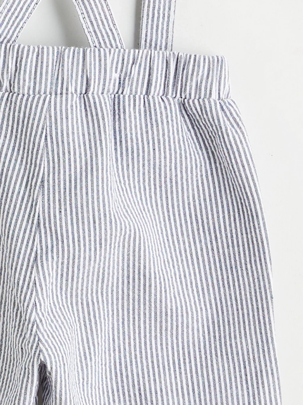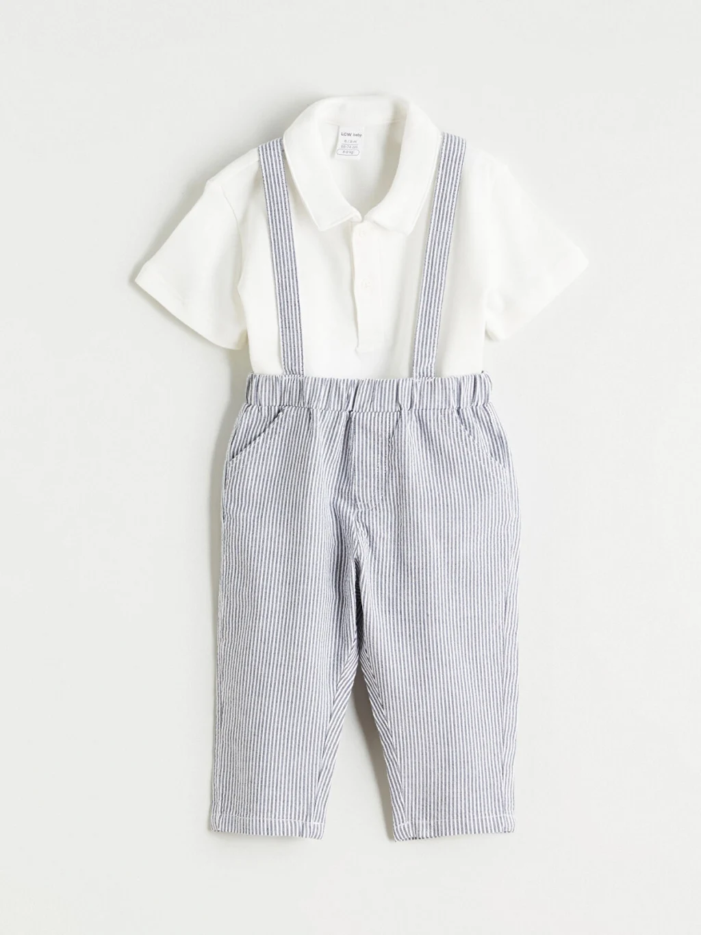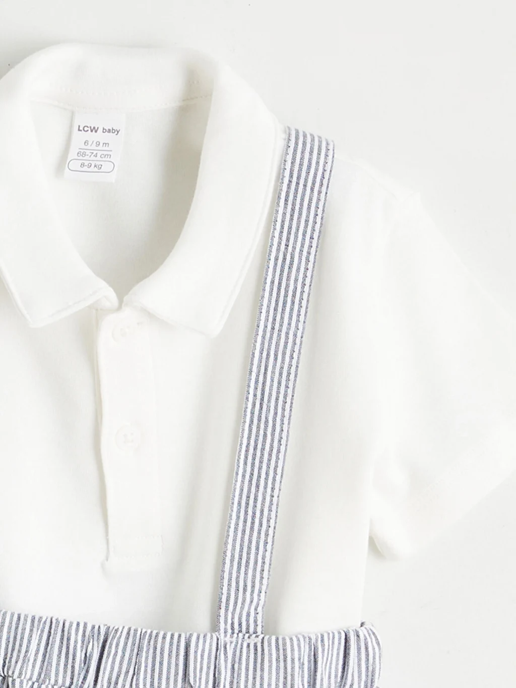 Erkek bebek takım, polo yaka ve kısa kollu üst ile çizgili desenli, askılı pantolondan oluşur. Üst düğme kapamalı, pantolon beli lastiklidir.