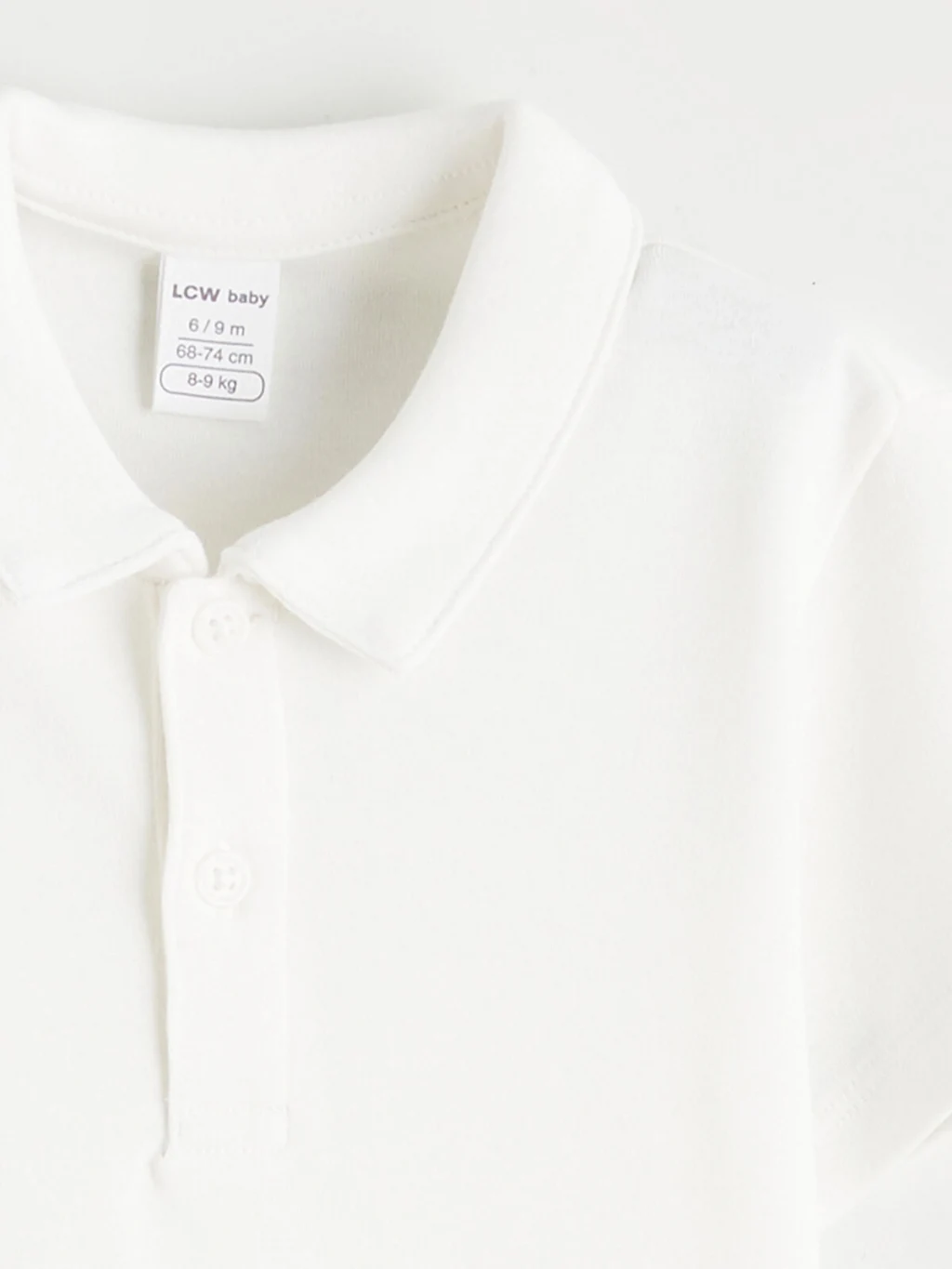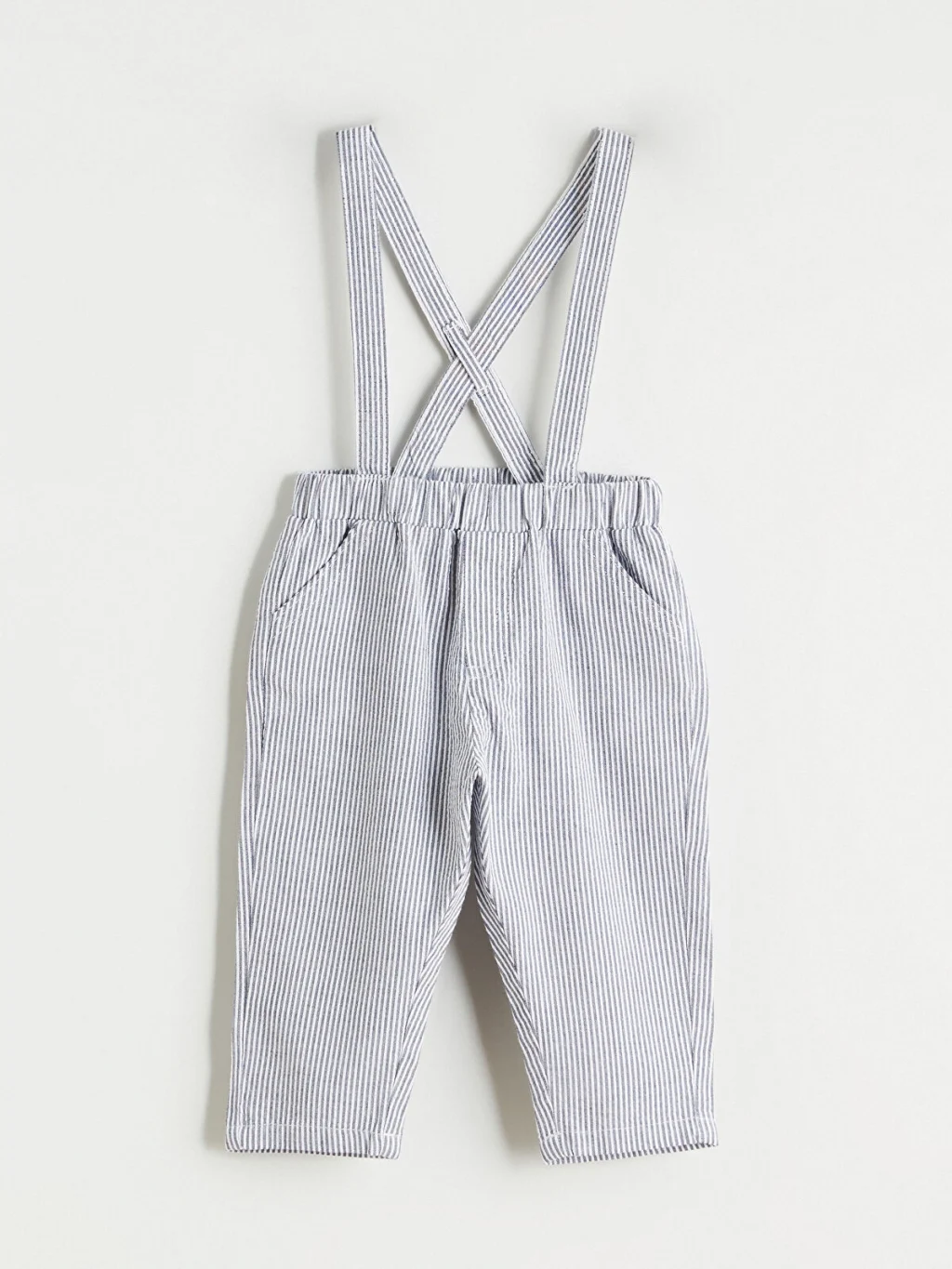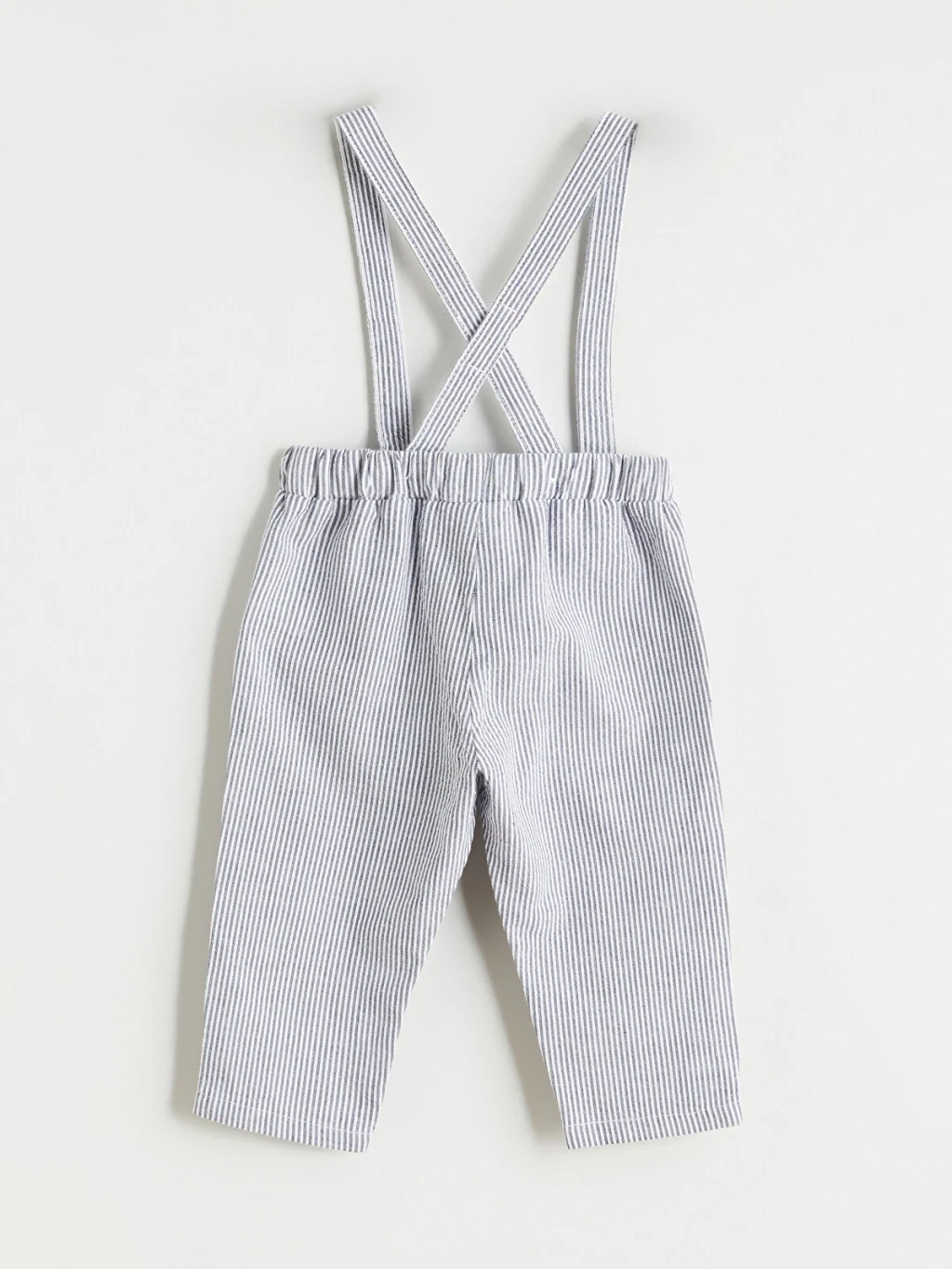 Erkek bebek takım, polo yaka ve kısa kollu üst ile çizgili desenli, askılı pantolondan oluşur. Üst düğme kapamalı, pantolon beli lastiklidir.