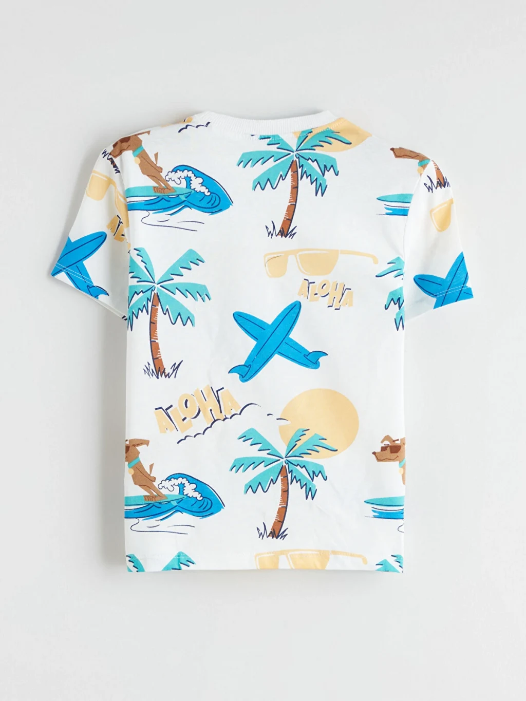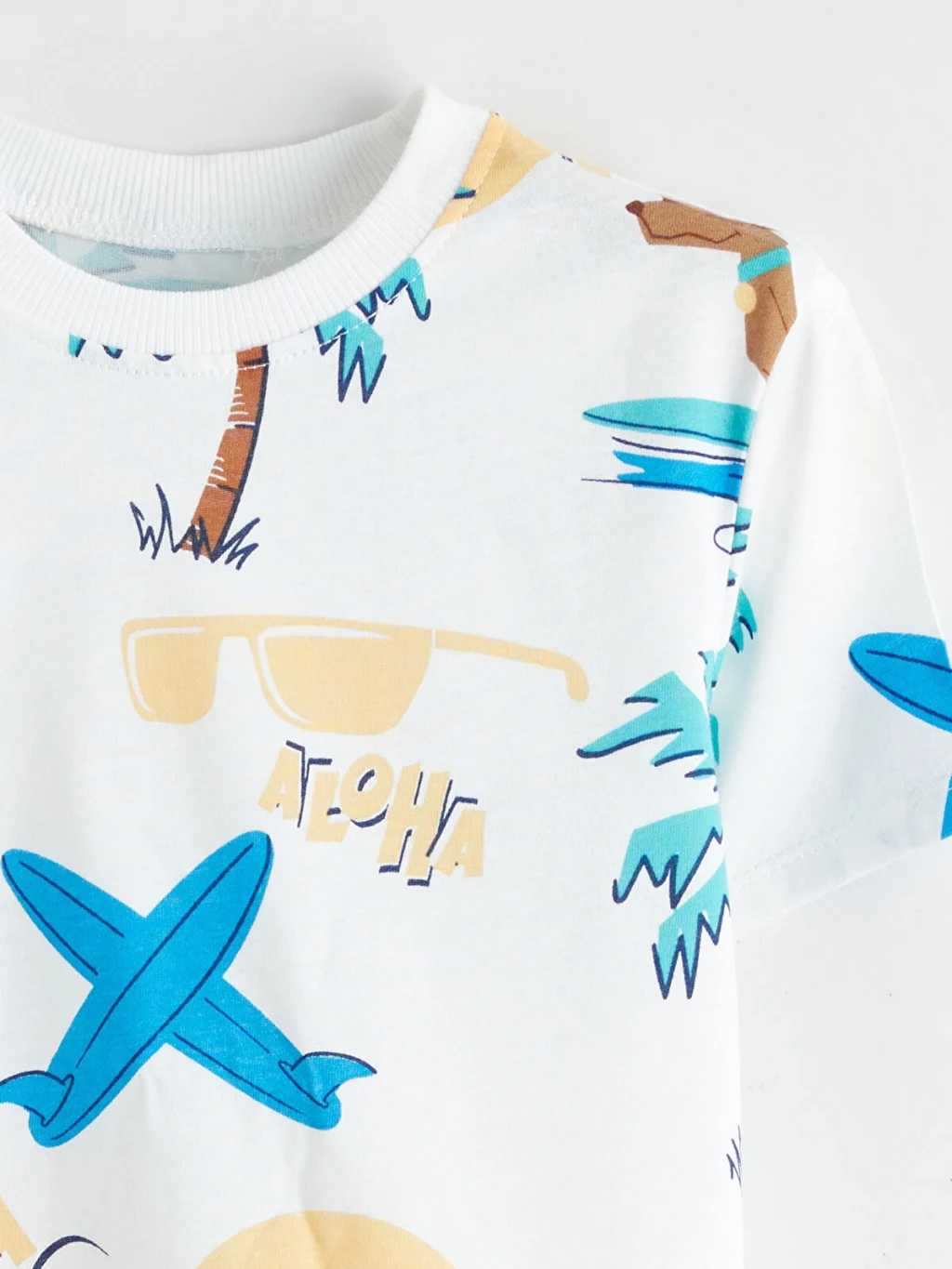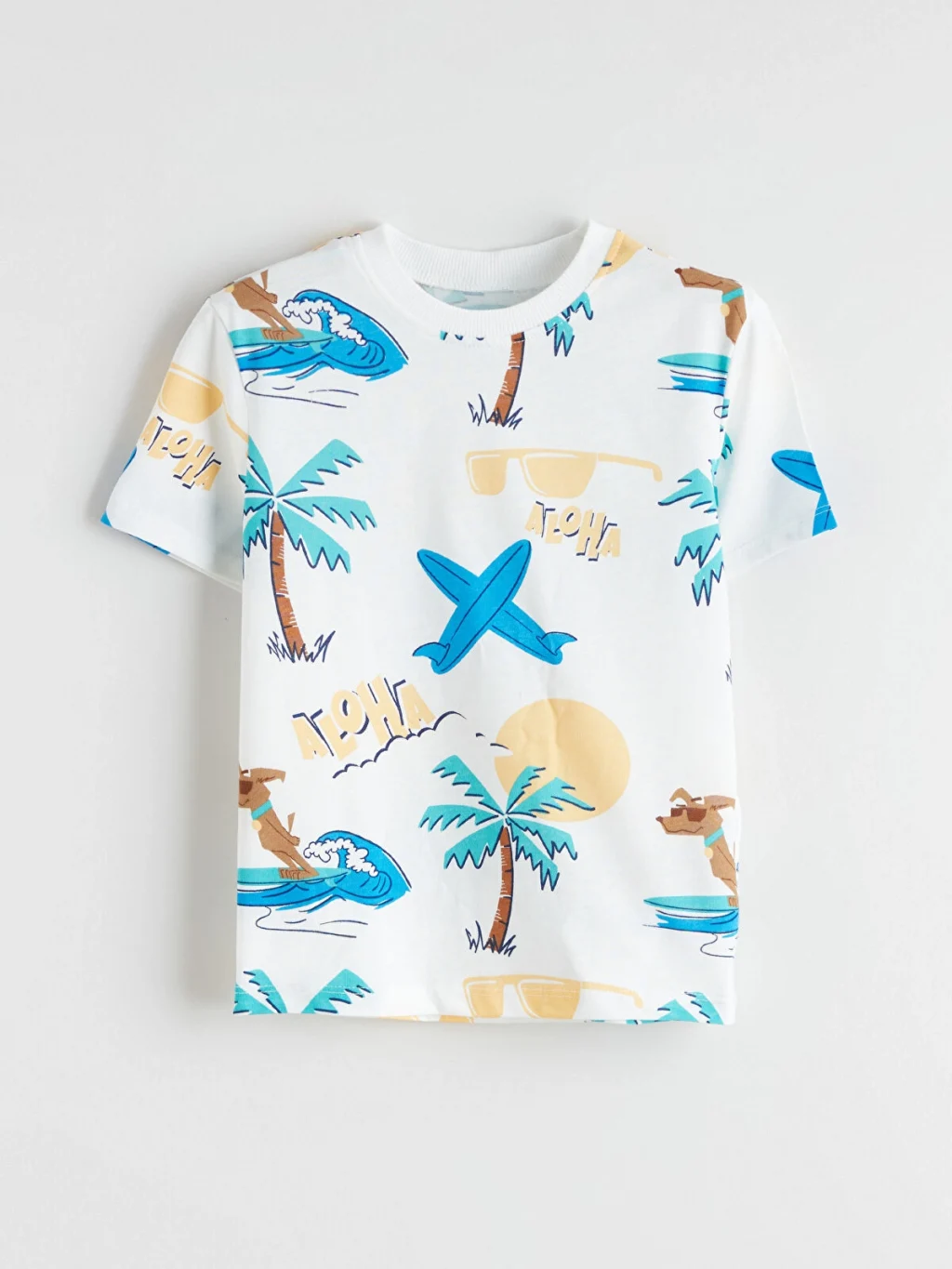 Bisiklet yaka ve kısa kollu erkek çocuk tişört, %100 pamuklu penye kumaştan üretilmiştir. Bol kalıplı ve desenli bir tasarıma sahiptir.