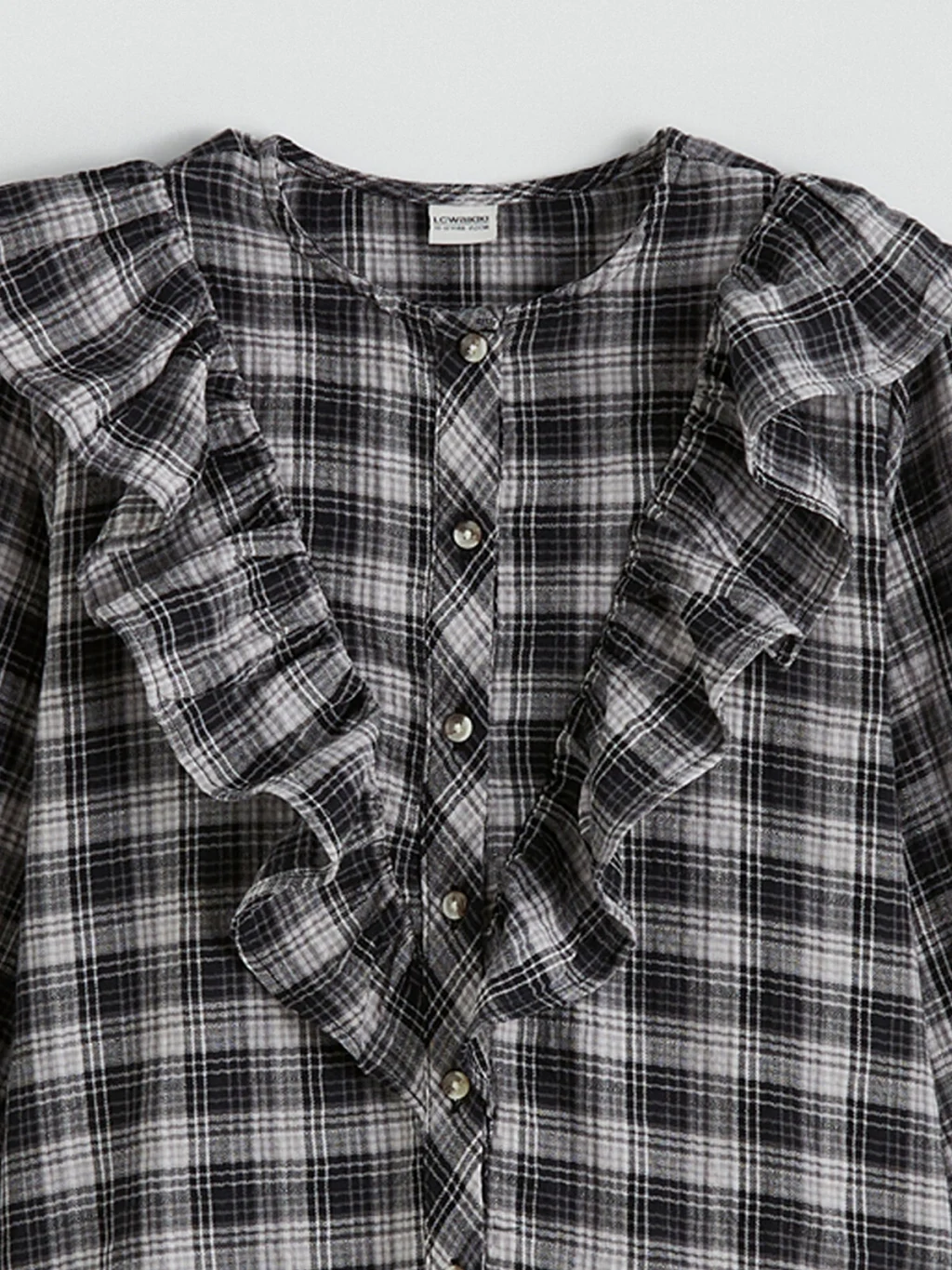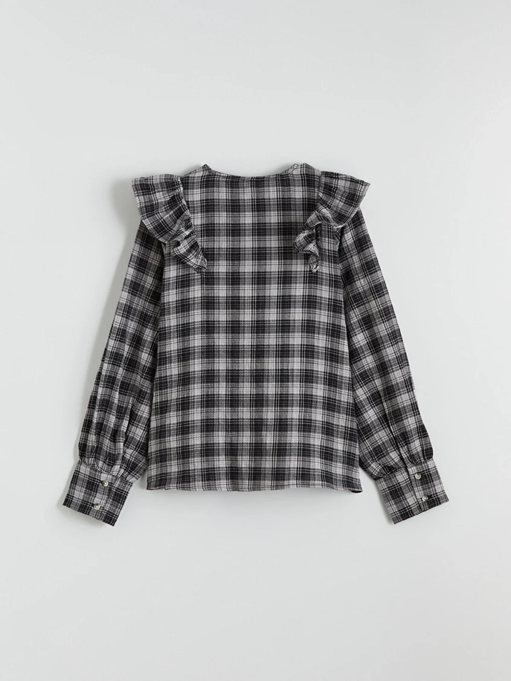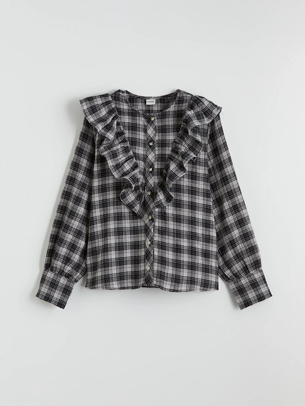 Kız çocuk gömlek, bisiklet yakalı, uzun kollu, ekose desenli, önü fırfırlı ve düğme kapamalı olup poplin kumaştan üretilmiştir.