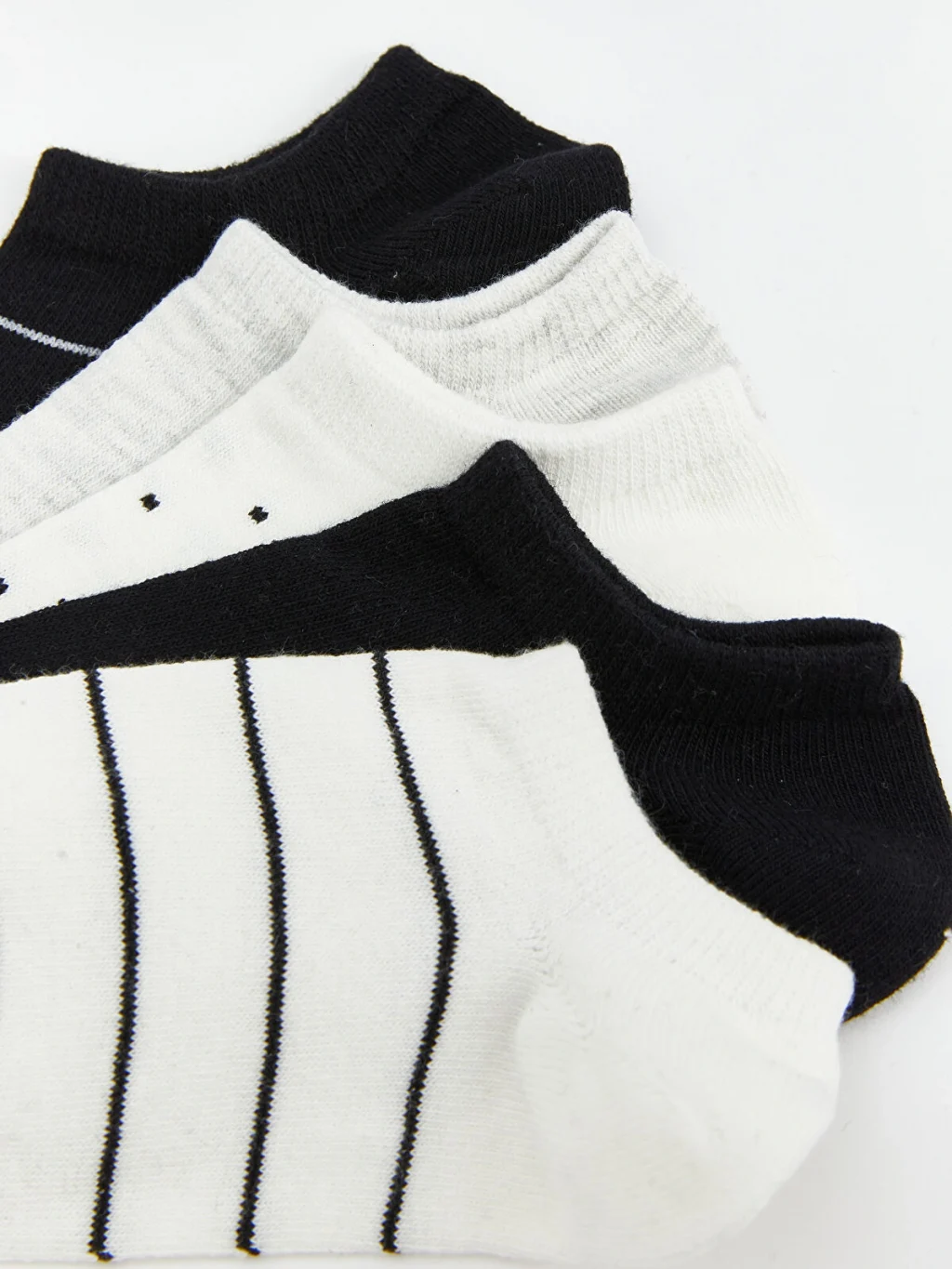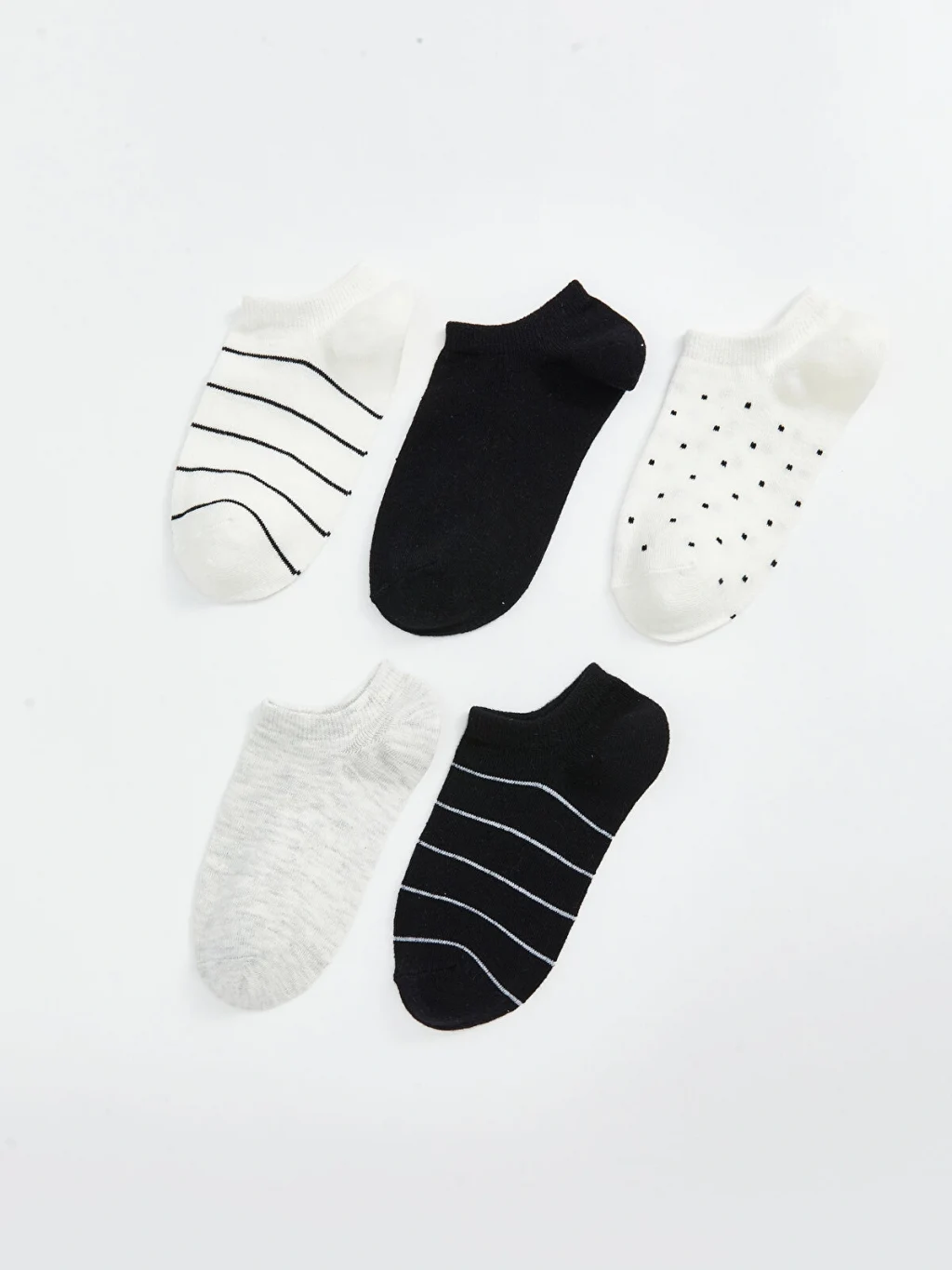 Kadın sneaker çorap seti, farklı desenlere sahiptir. Set içerisinde düz, puantiyeli ve çizgili desenli çoraplar bulunur.