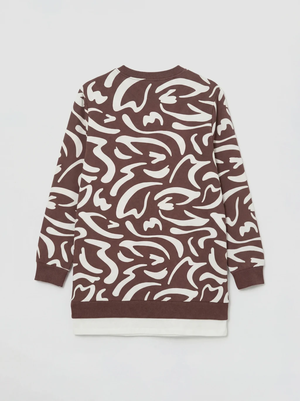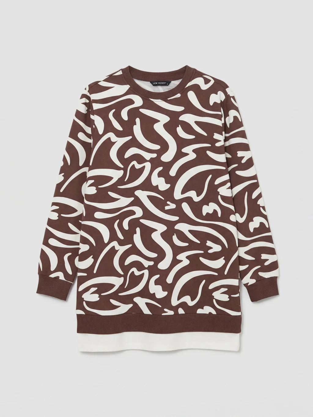 Bisiklet yaka, uzun kollu, tamamı desenli kadın sweatshirt tunik. Etek ucunda katmanlı bir görünüm bulunur ve manşetleri ribanalıdır.
