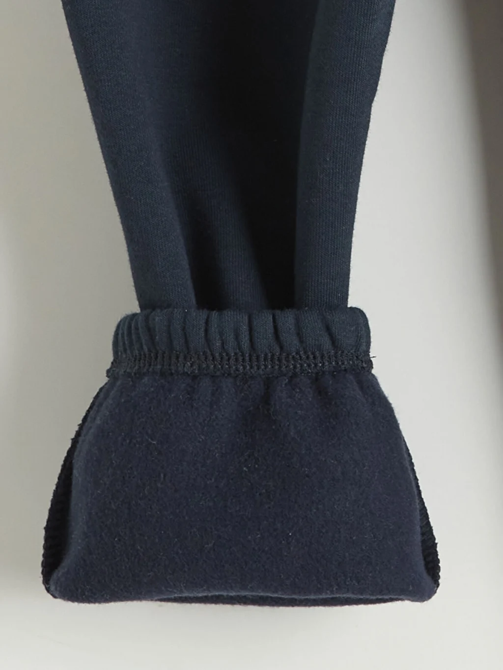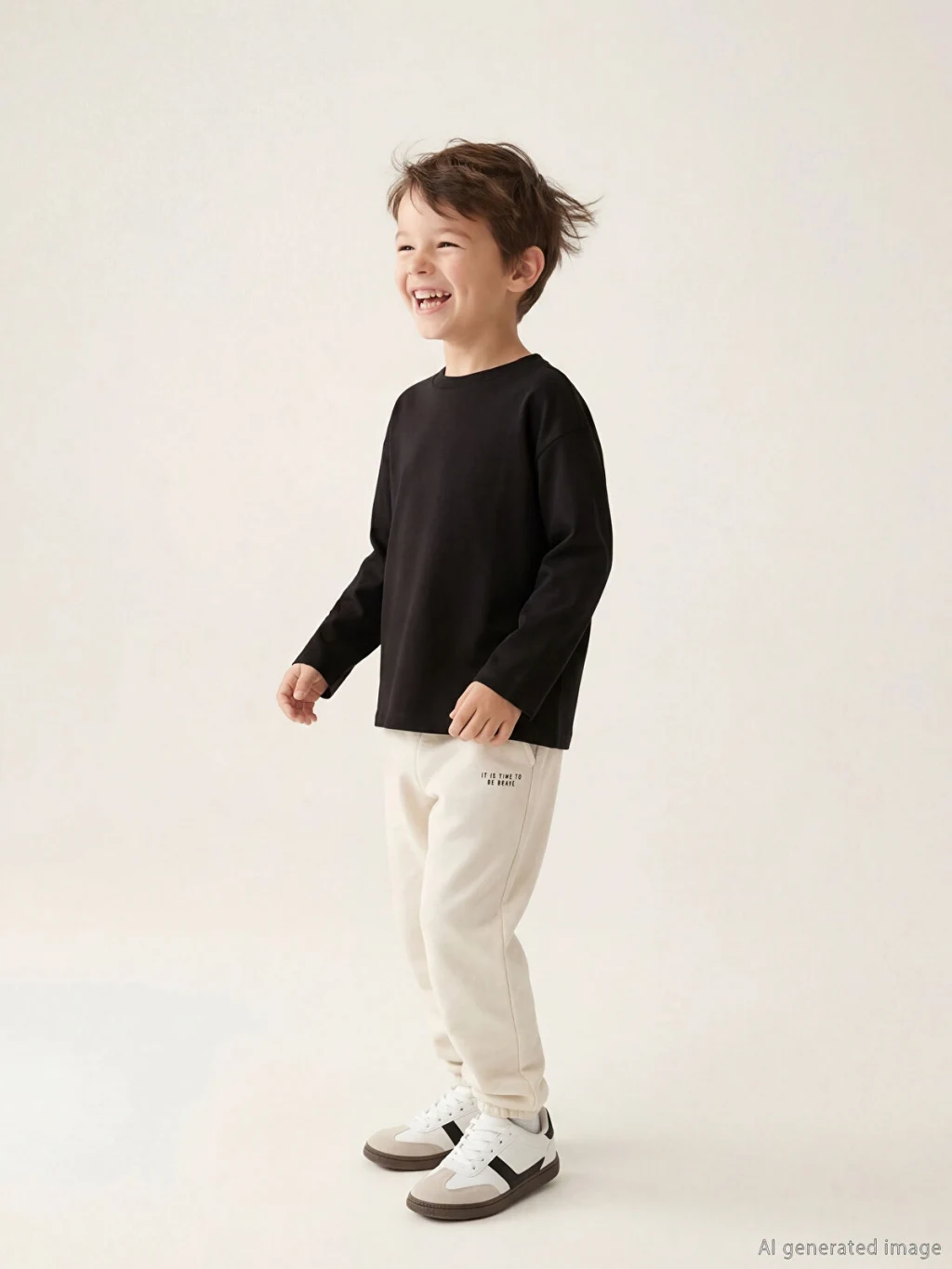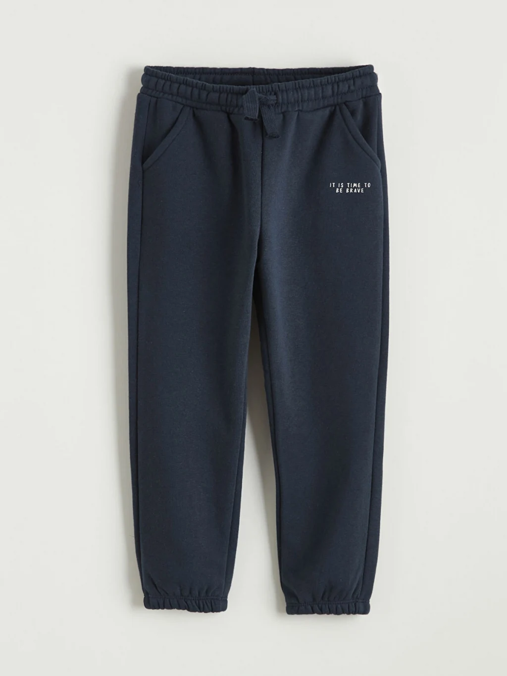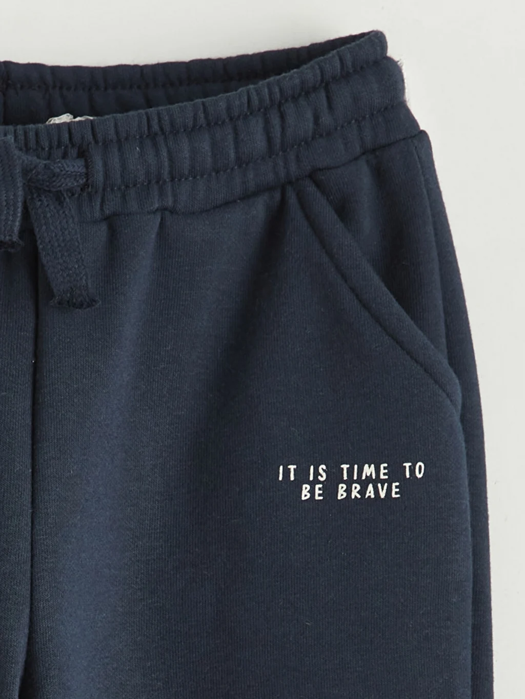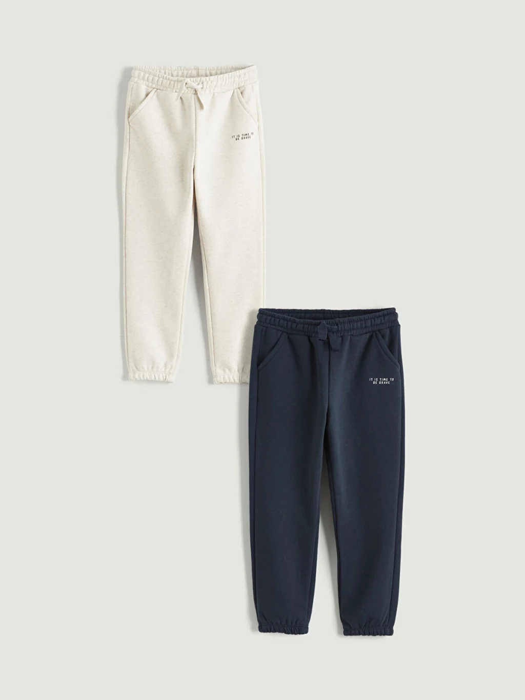 2'li erkek çocuk eşofman altı, beli lastikli ve ayarlanabilir bağcıklıdır. Paçaları ribanalı, yan cepli ve yazı baskılıdır.