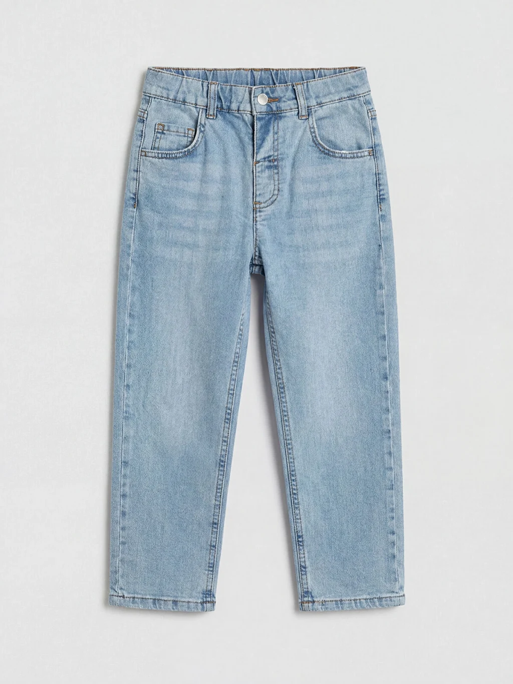 Normal bel, erkek çocuk jean pantolon. Beş cepli tasarıma sahip olup kemer köprülüdür. Beli lastiklidir ve düğme kapamalıdır.