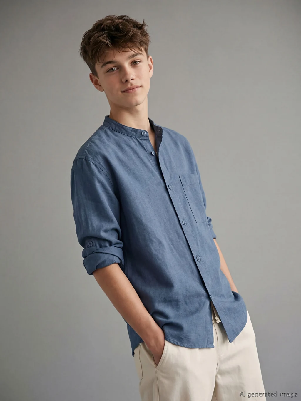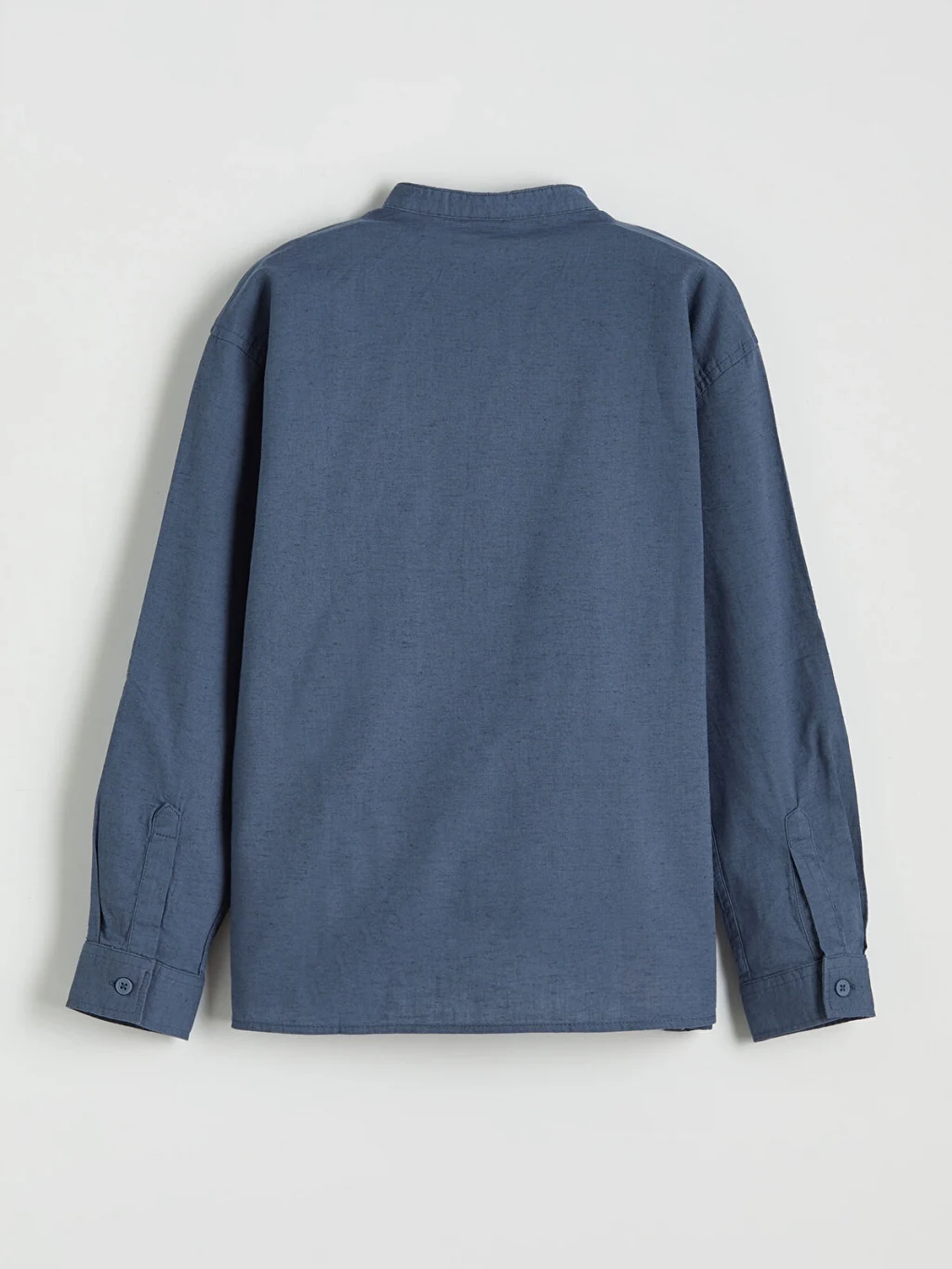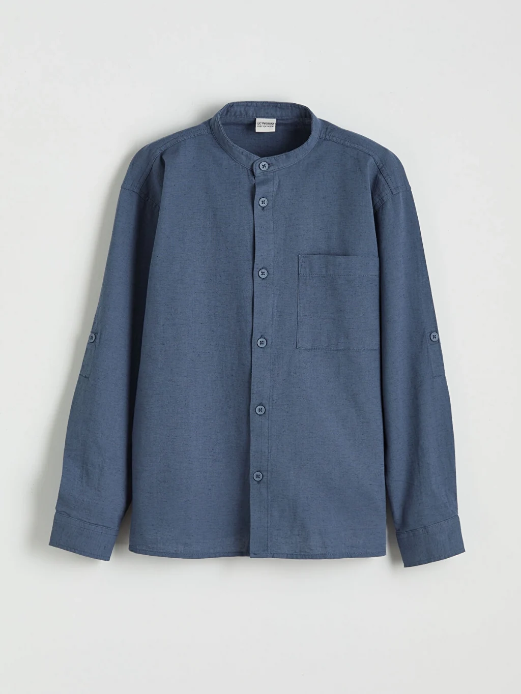 Hakim yaka, uzun kollu erkek çocuk gömlek, yüksek pamuk içeren keten karışımlı kumaştan üretilmiştir. Önden düğme kapamalı ve tek ceplidir.