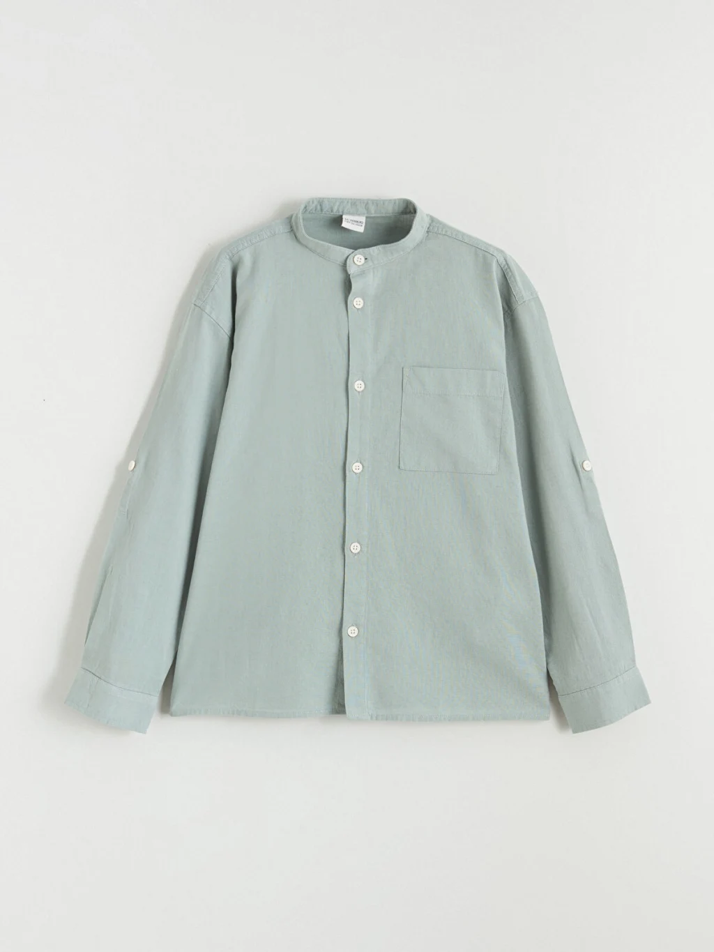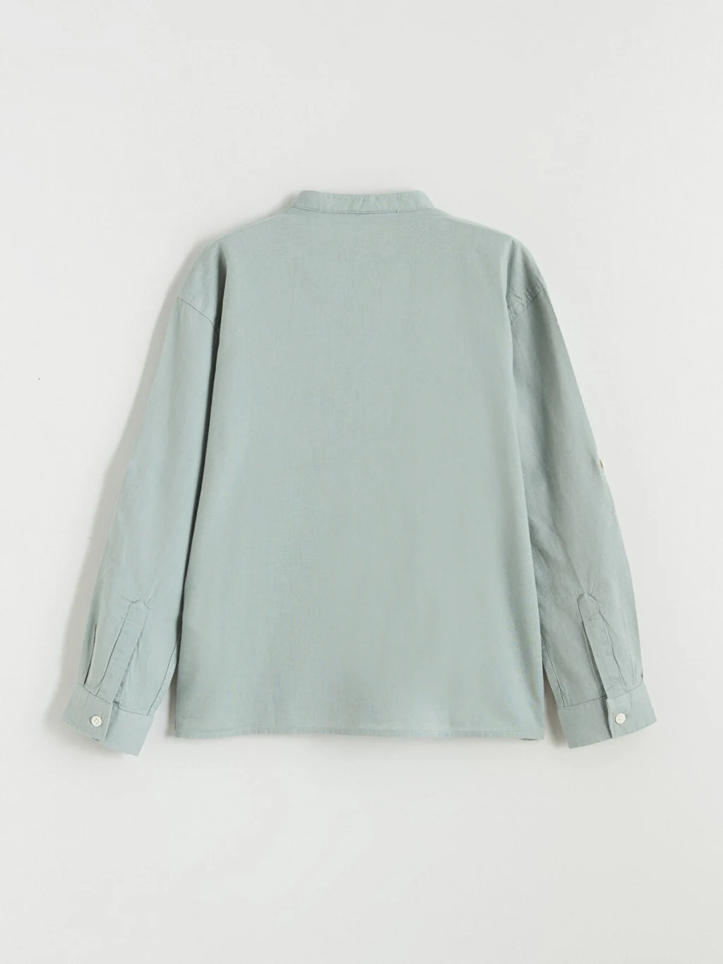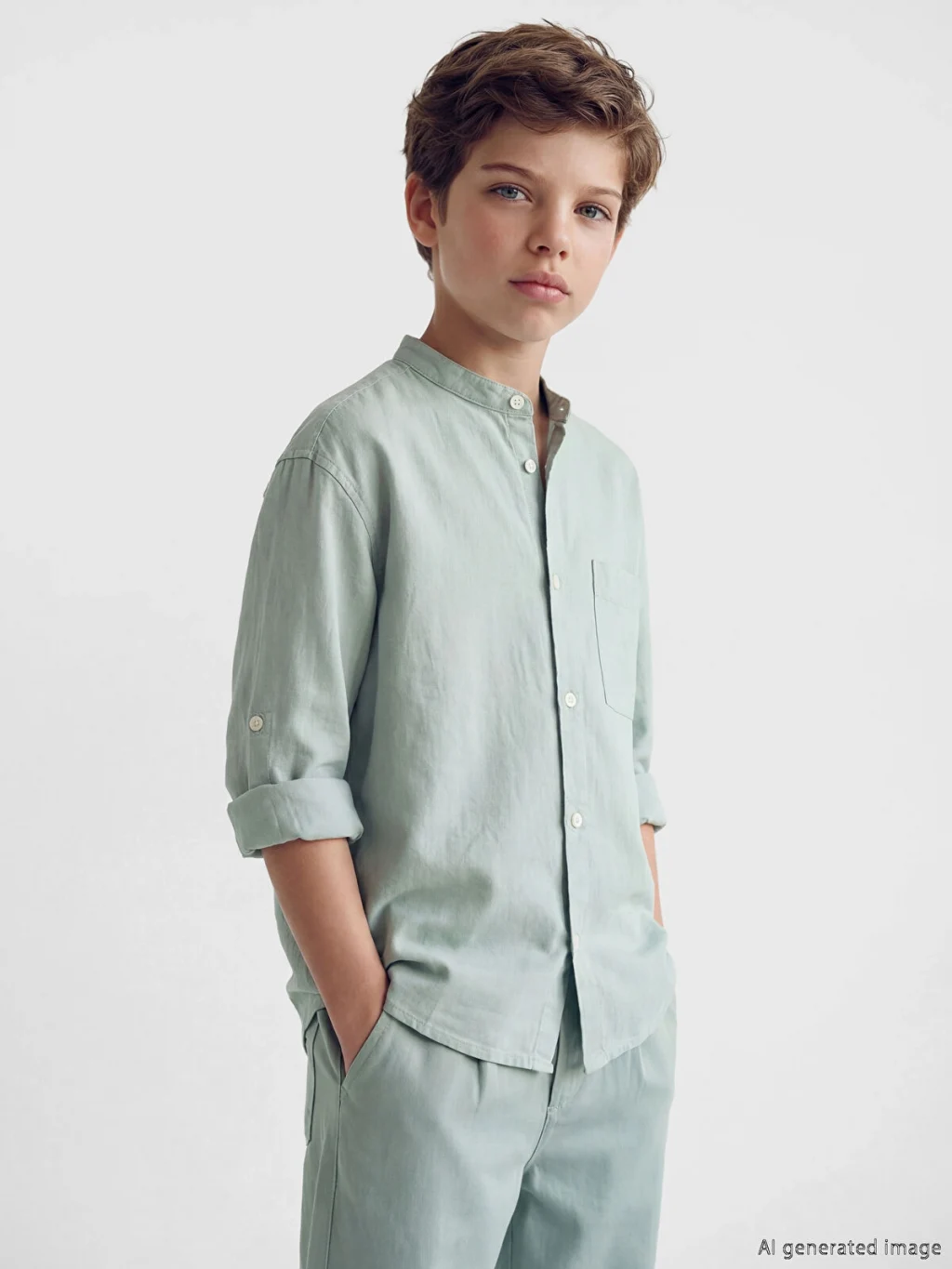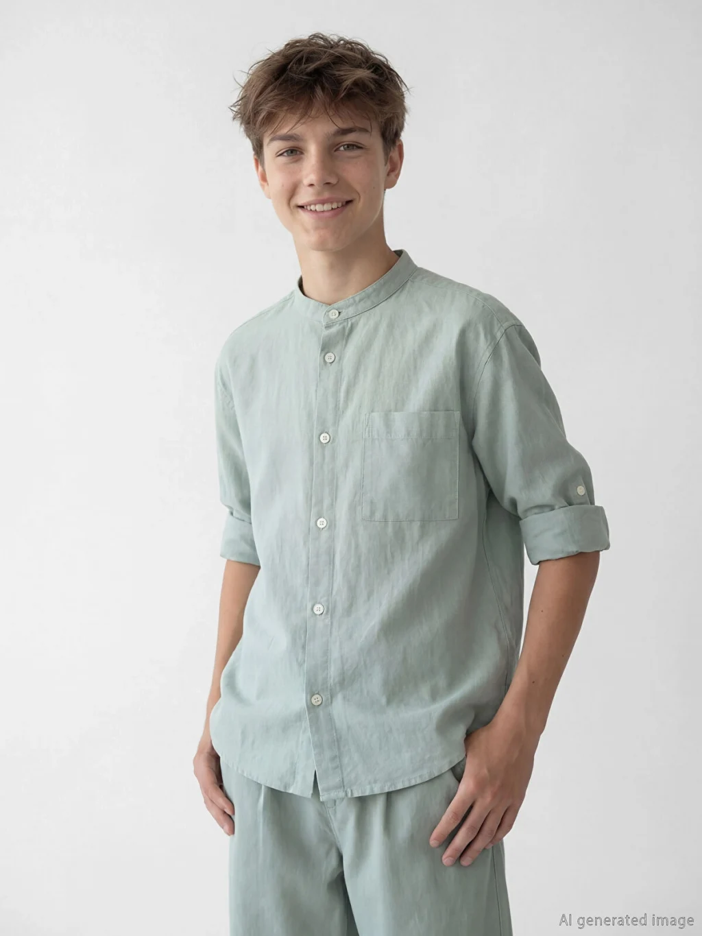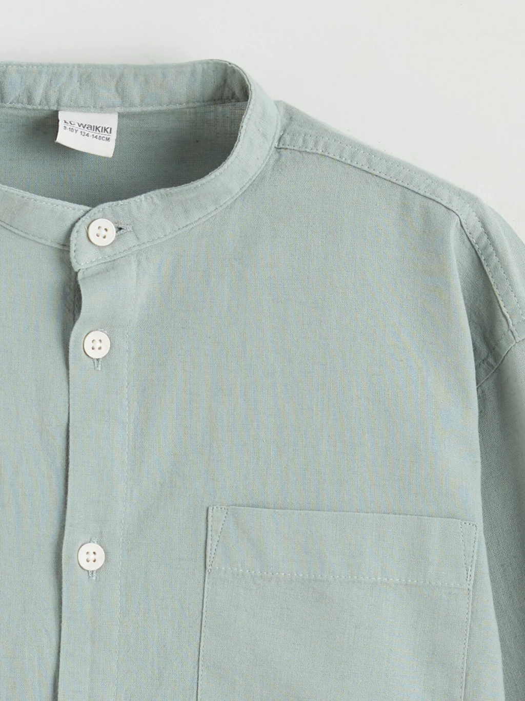 Hakim yaka, uzun kollu erkek çocuk gömlek, yüksek pamuk içeren keten karışımlı kumaştan üretilmiştir. Önden düğme kapamalı ve tek ceplidir.