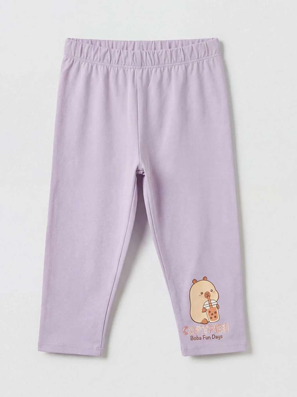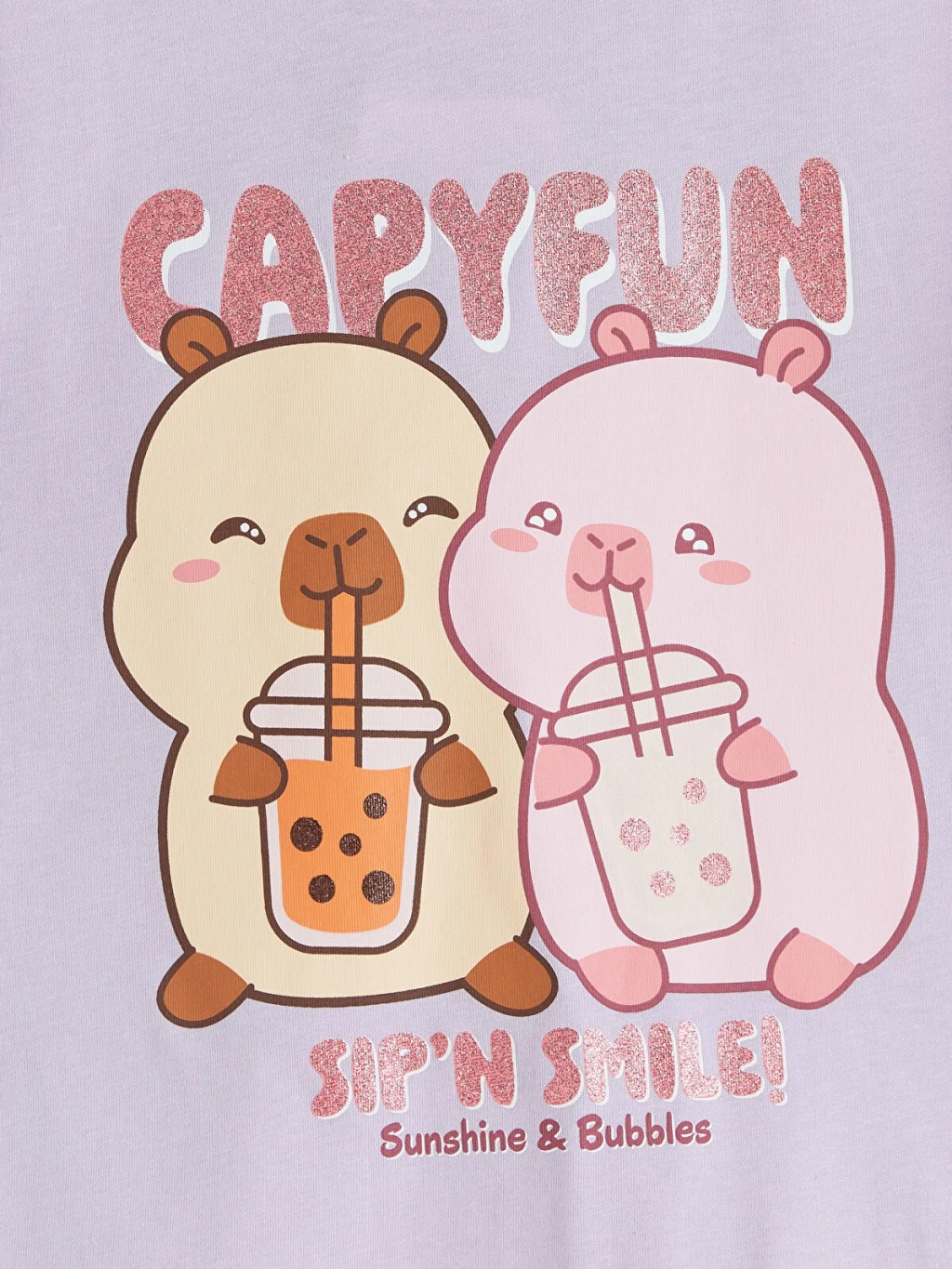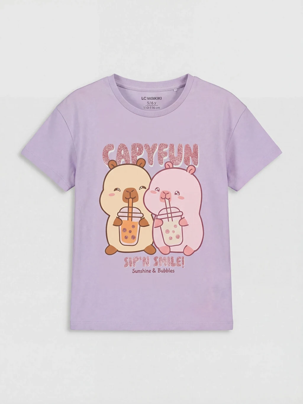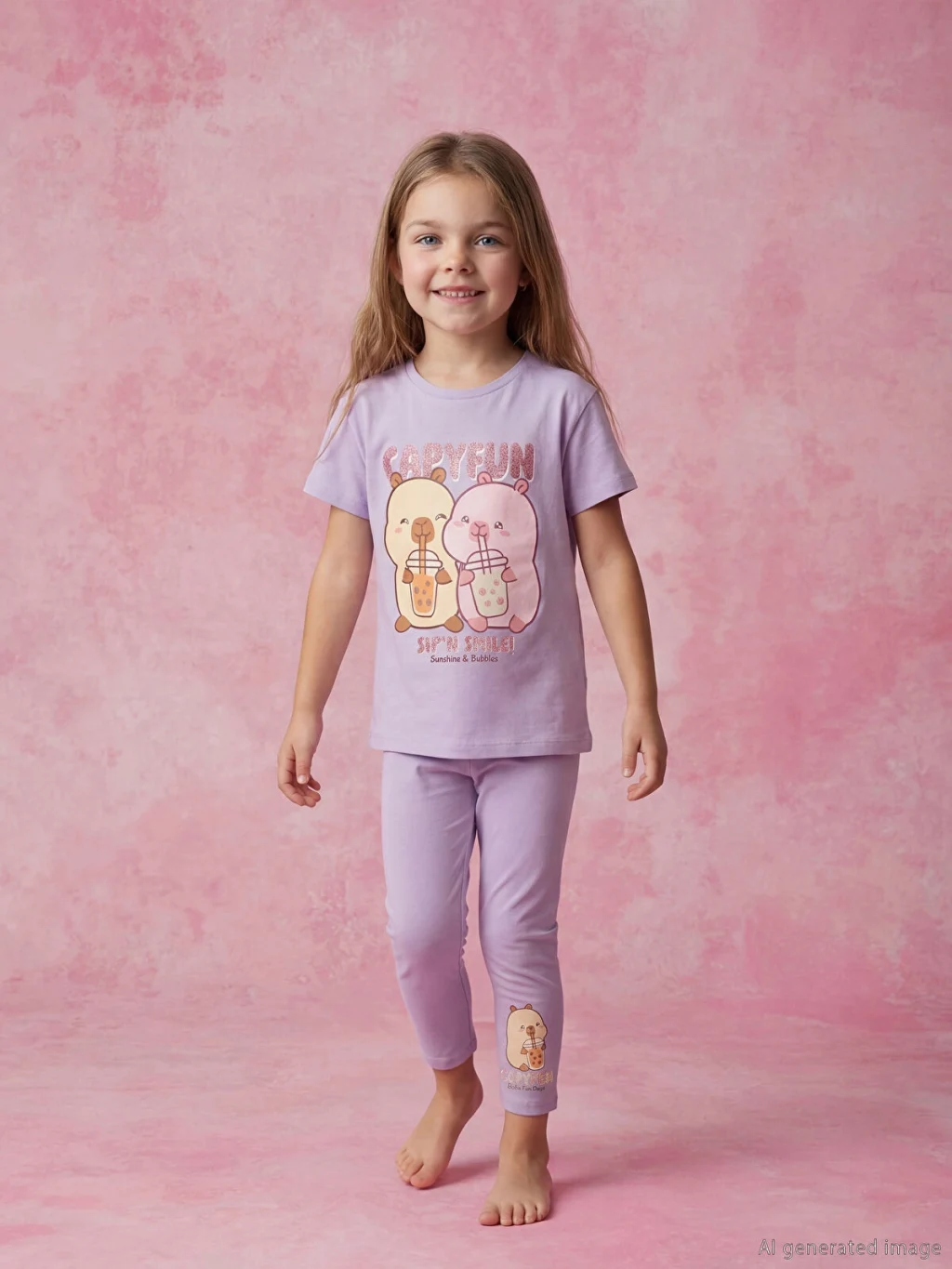 Capyfun lisanslı kız çocuk takımı, bisiklet yaka ve kısa kollu baskılı tişört ile baskılı uzun tayttan oluşur.