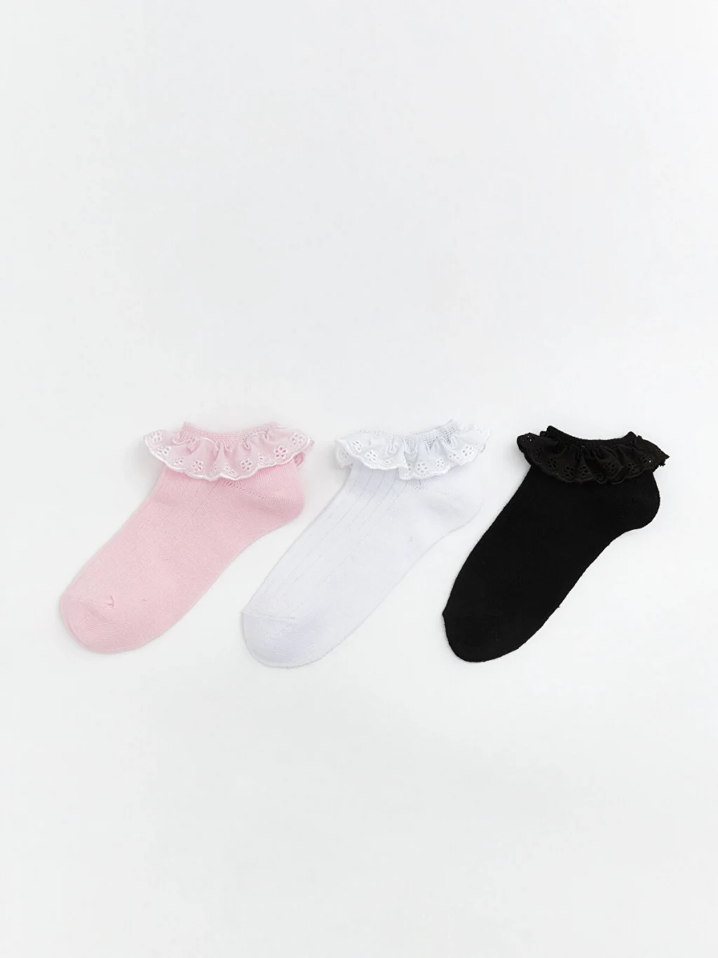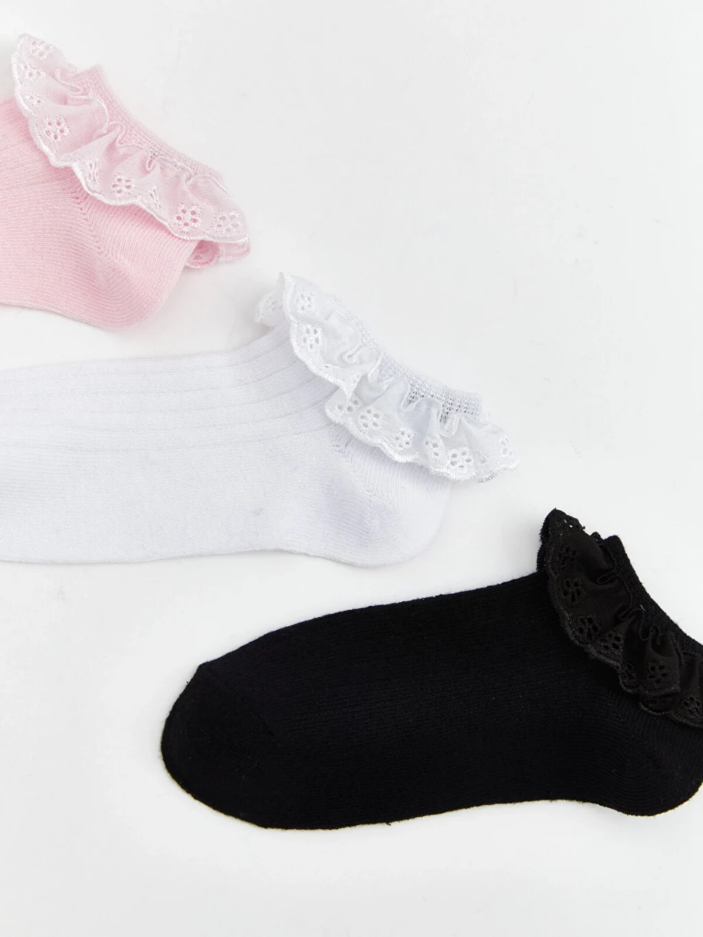 Bilek kısmı brode detaylı fırfır tasarımına sahip, fitilli ve düz dokulu kız çocuk patik çorap.