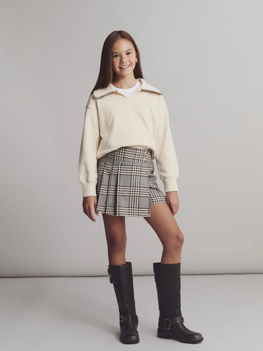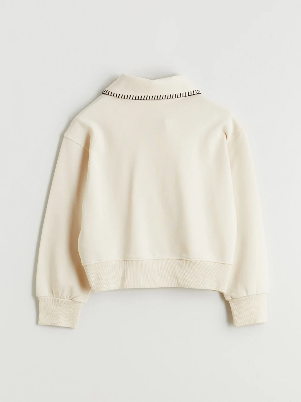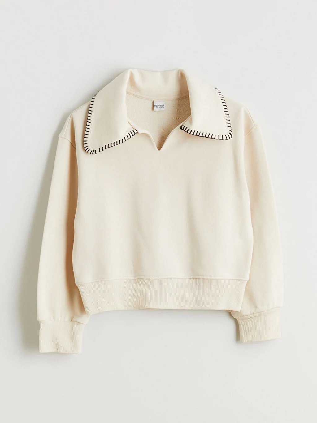 Yüksek pamuk içerikli kalın 3 iplik kumaştan üretilen kız çocuk sweatshirt, uzun kollu ve V yakalıdır. Yaka kenarları dikiş detaylı, kol ve etek ucu ribanalıdır.