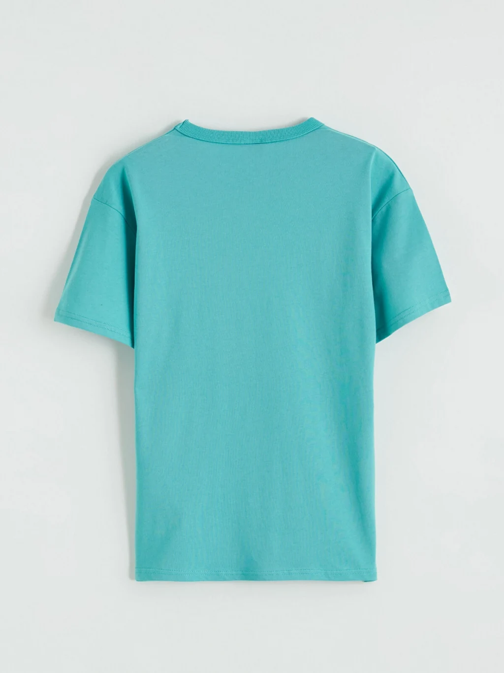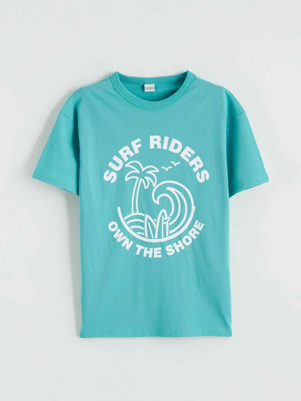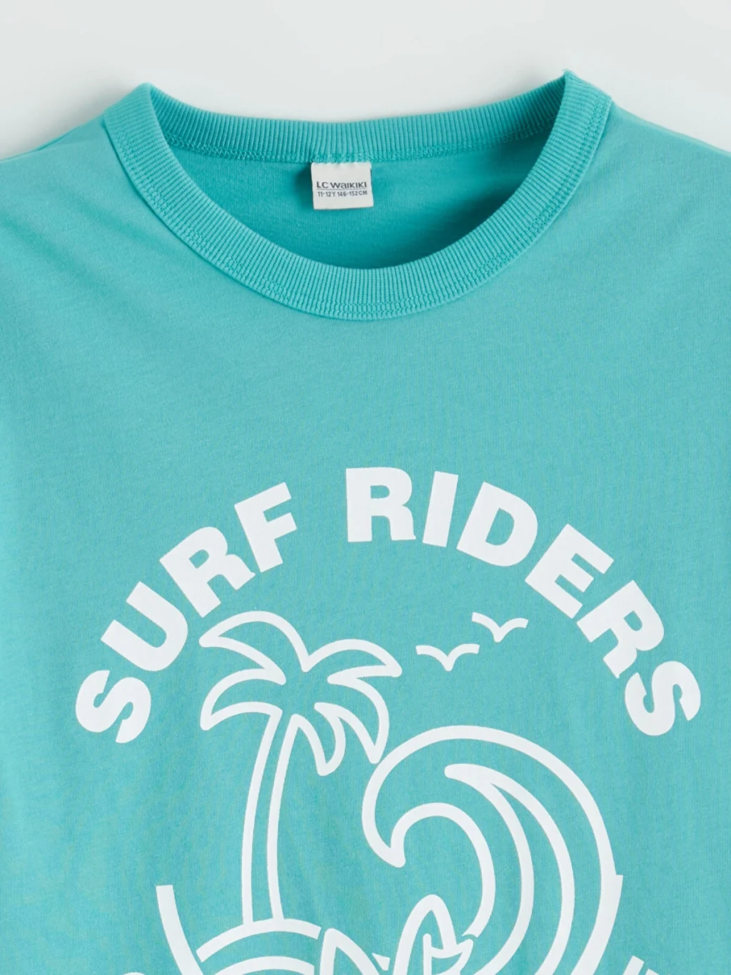 Bisiklet yakalı ve kısa kollu erkek çocuk tişört, %100 pamuklu penye kumaştan üretilmiştir. Önü slogan ve desen baskılıdır.