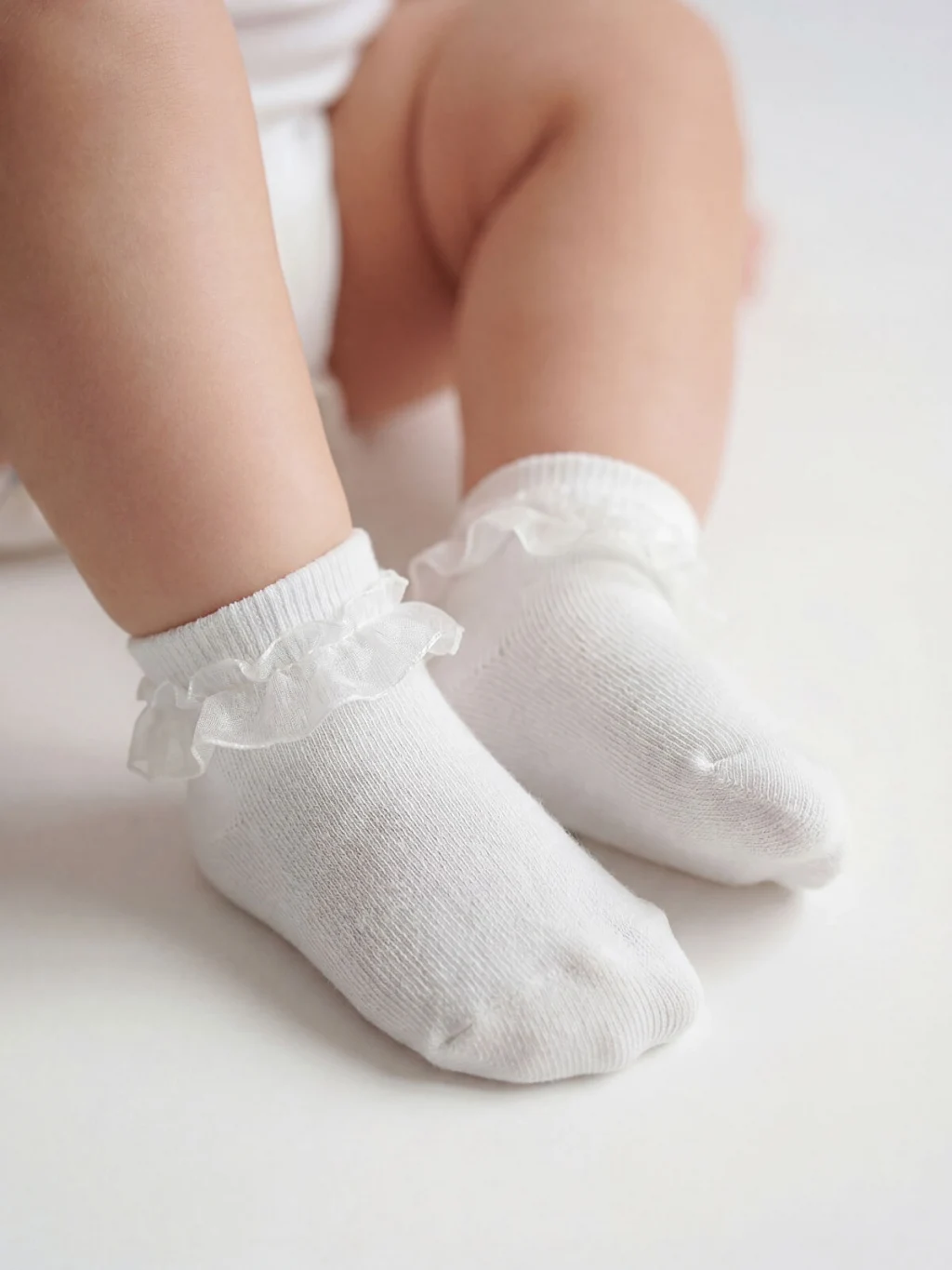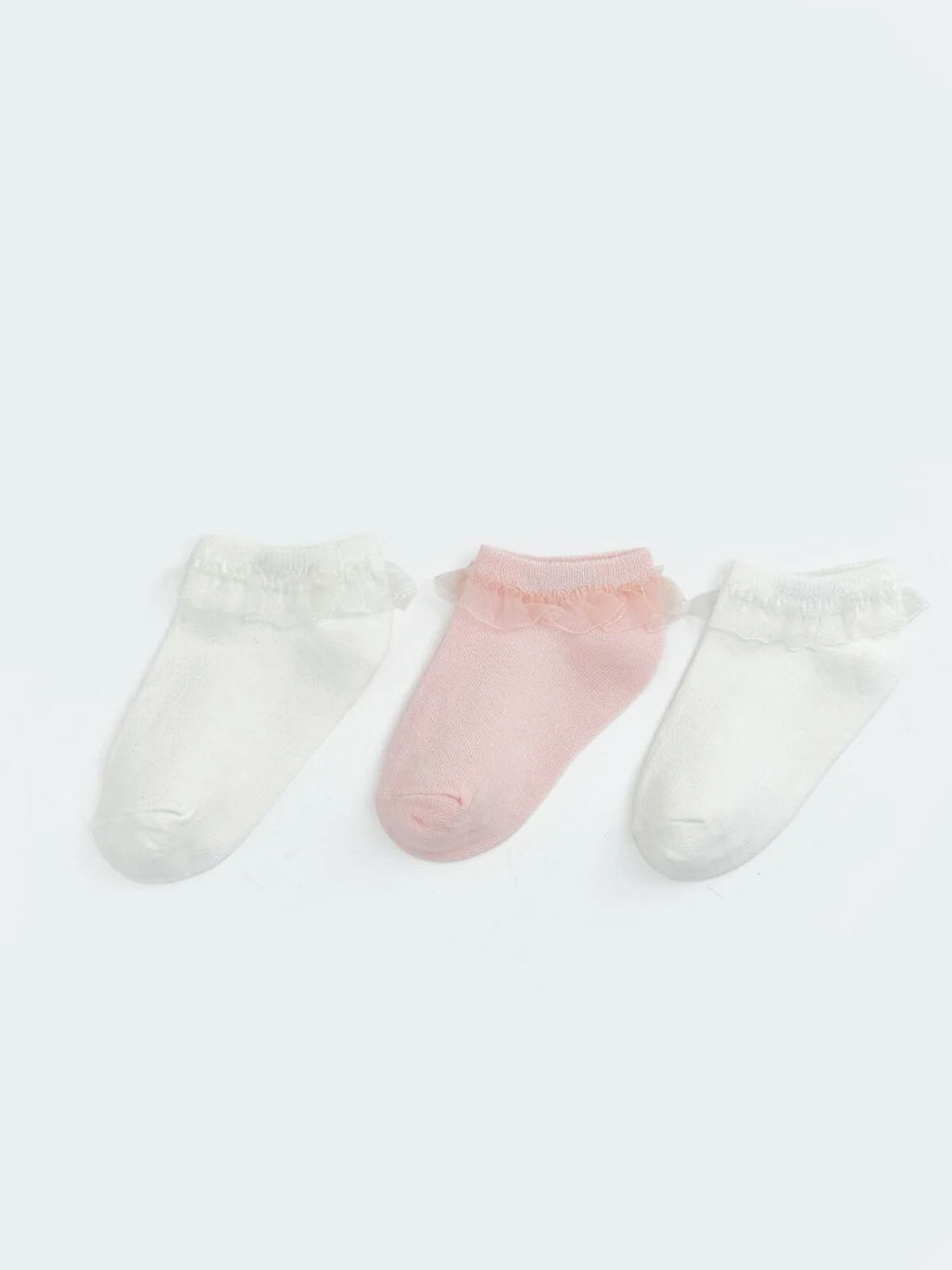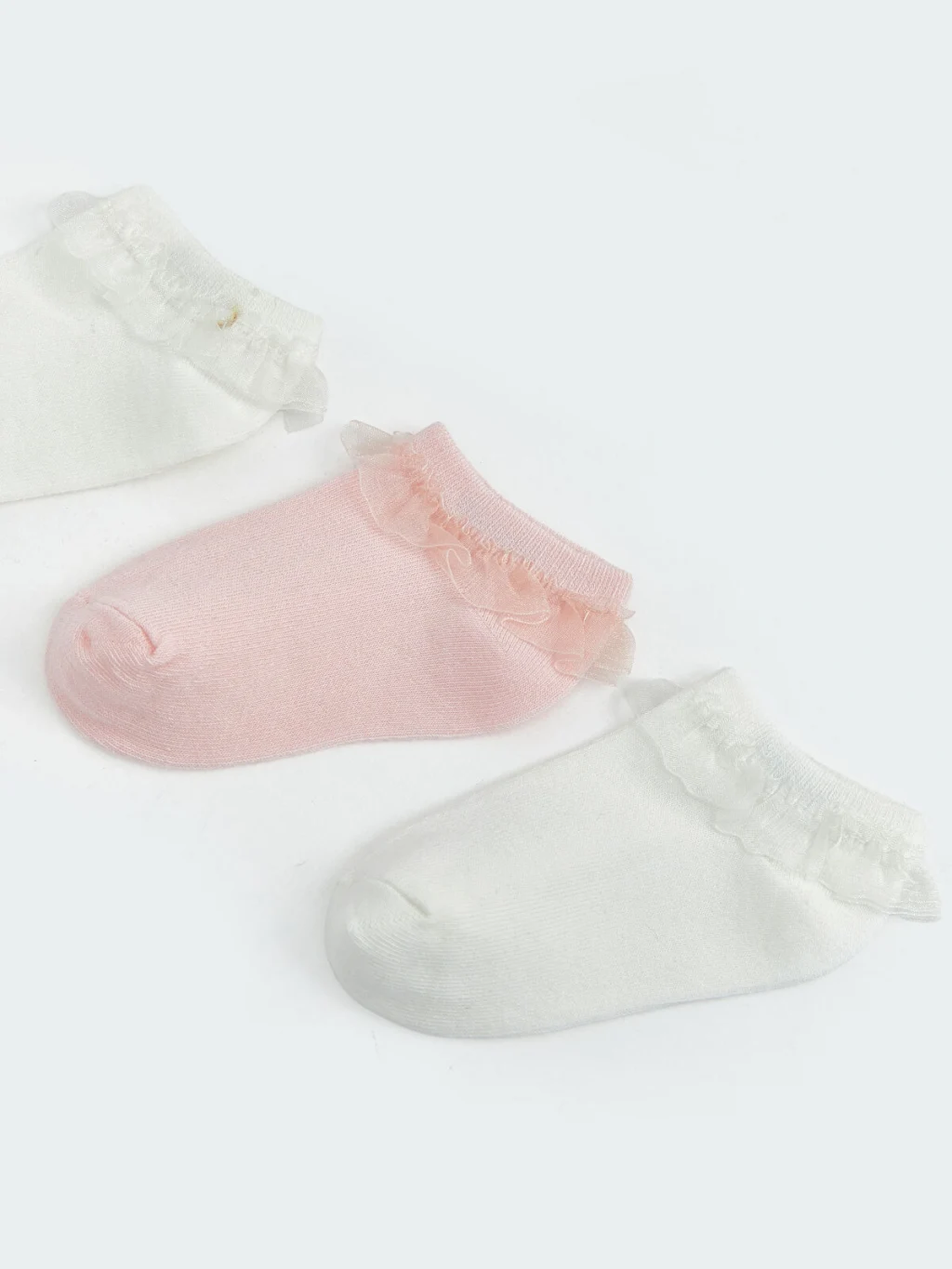 Desensiz kumaştan üretilen kız bebek patik çorap, bilek kısmında yer alan fırfır detayı ile tasarlanmıştır.