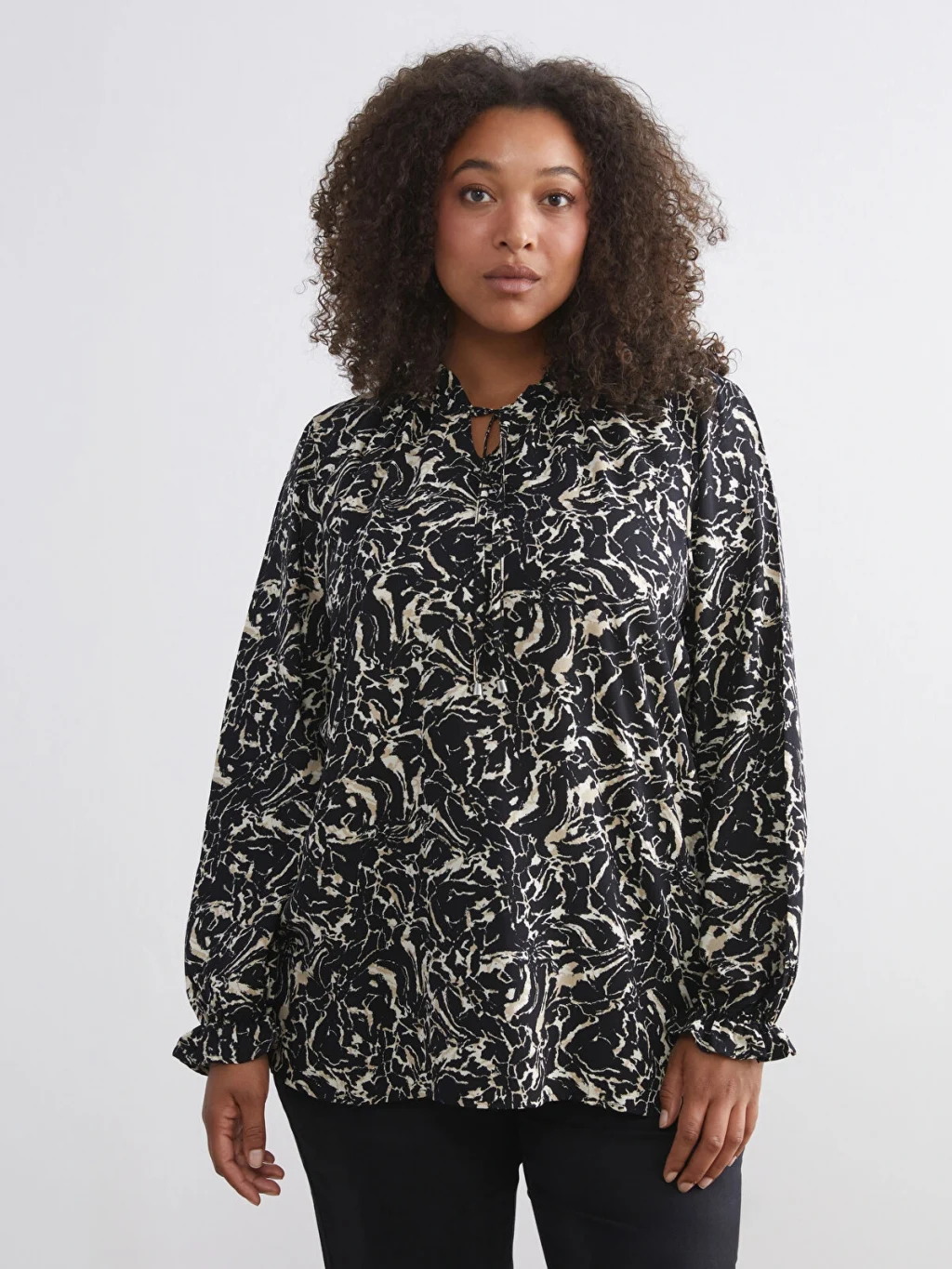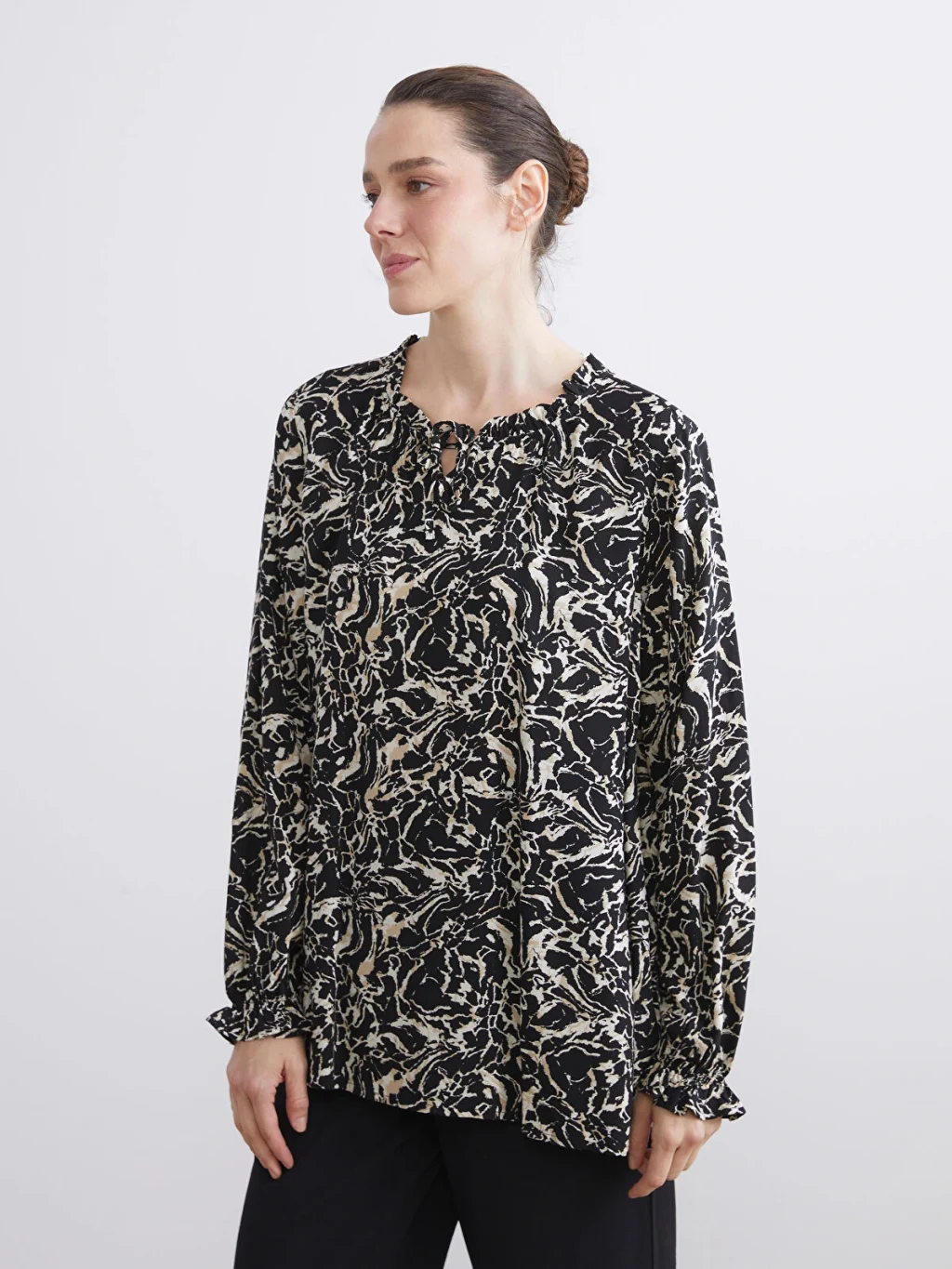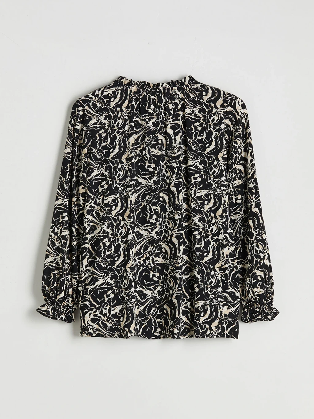 Bağlamalı yaka kadın bluz, viskon kumaştan üretilmiştir. Kol uçları ve yakası fırfırlı tasarıma sahiptir.