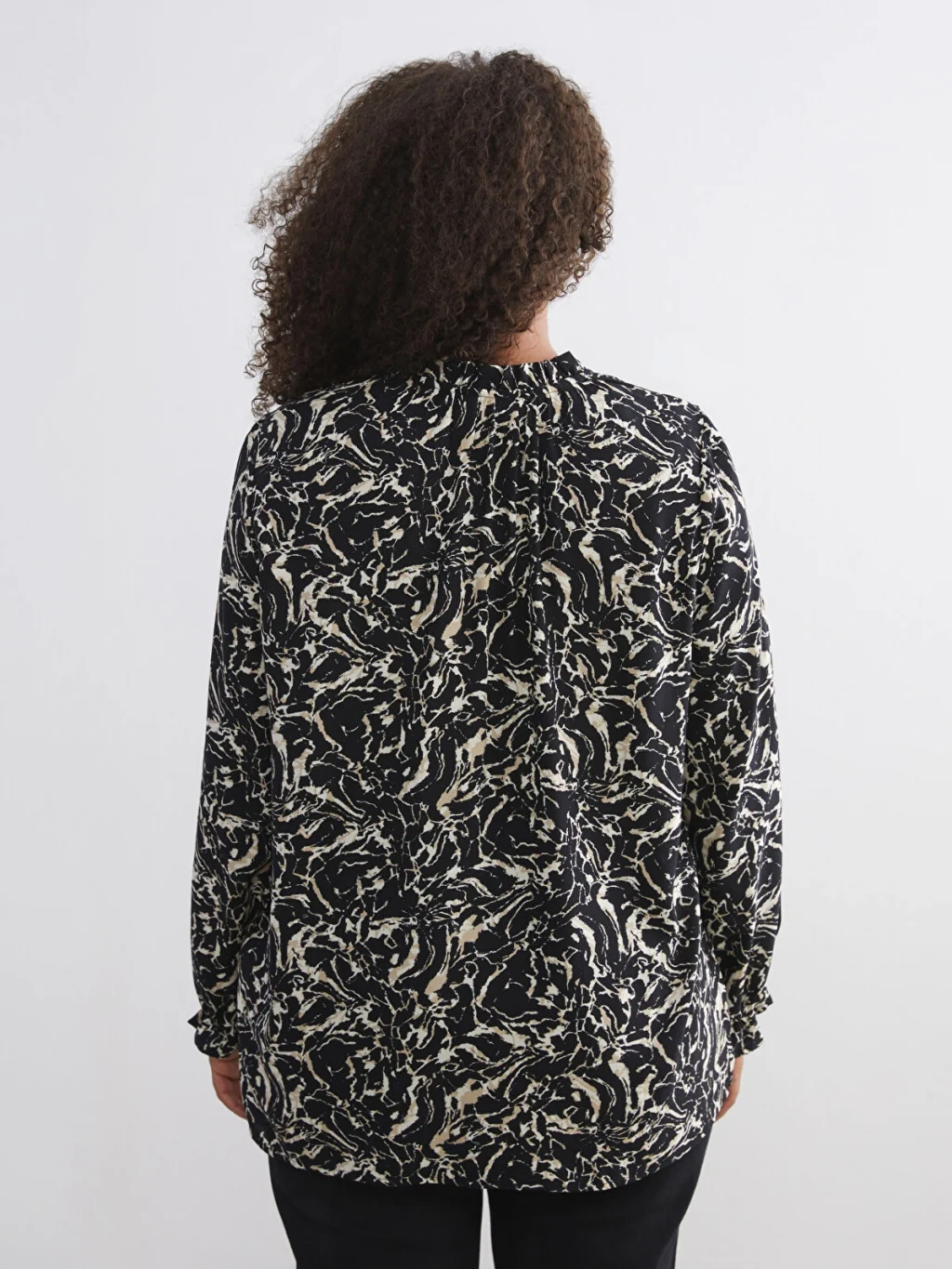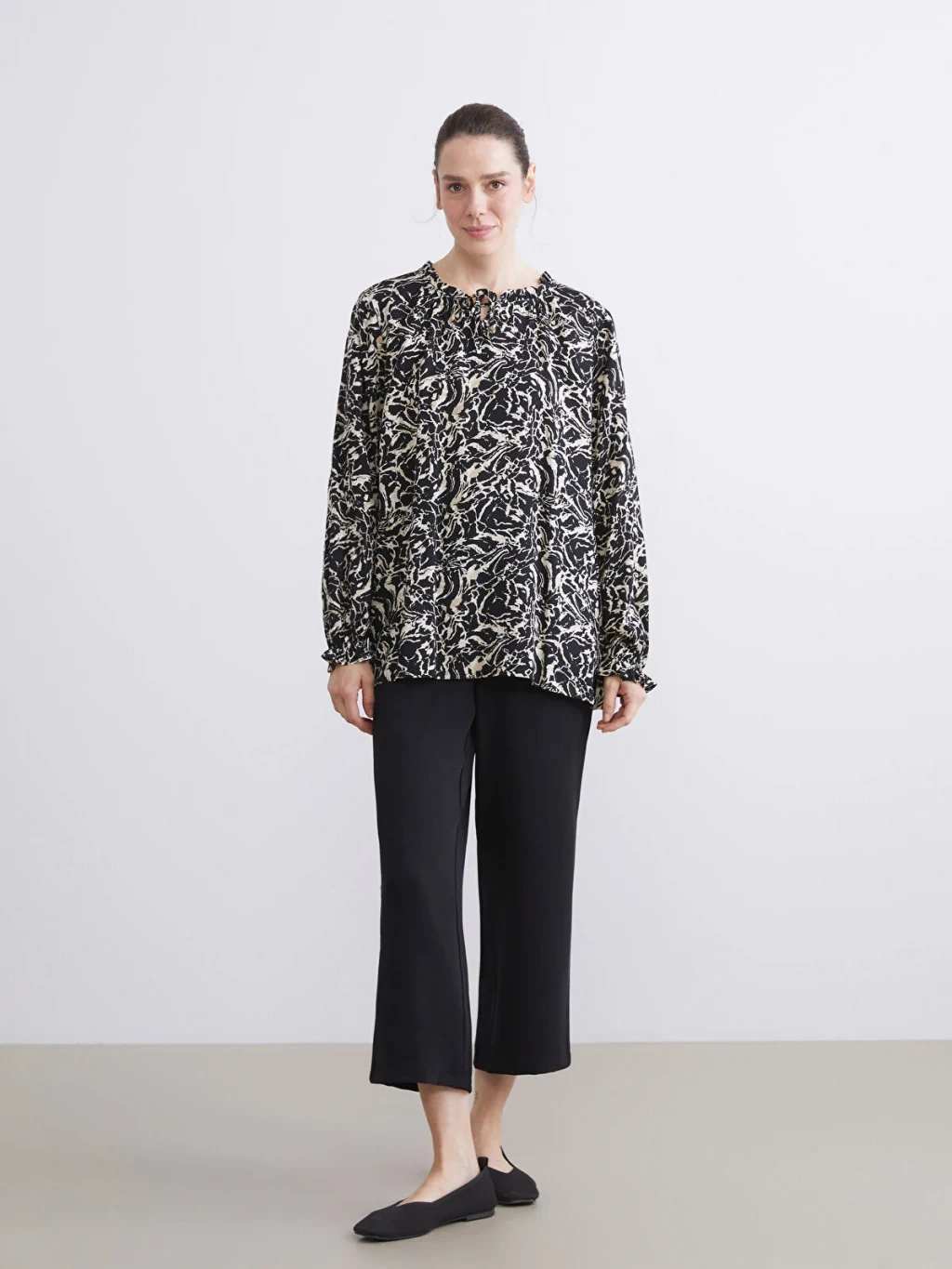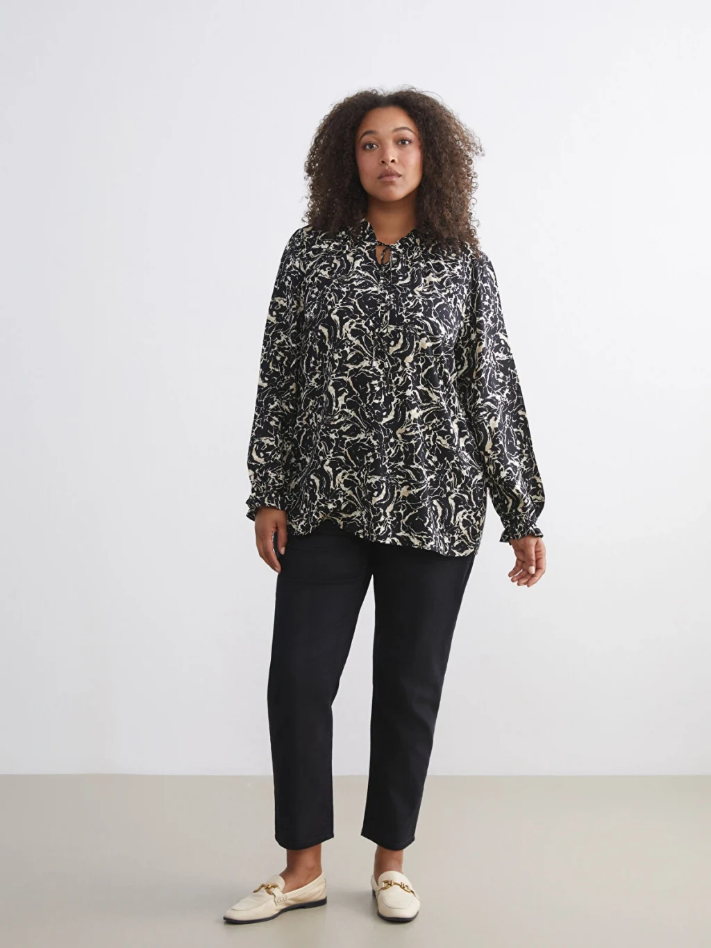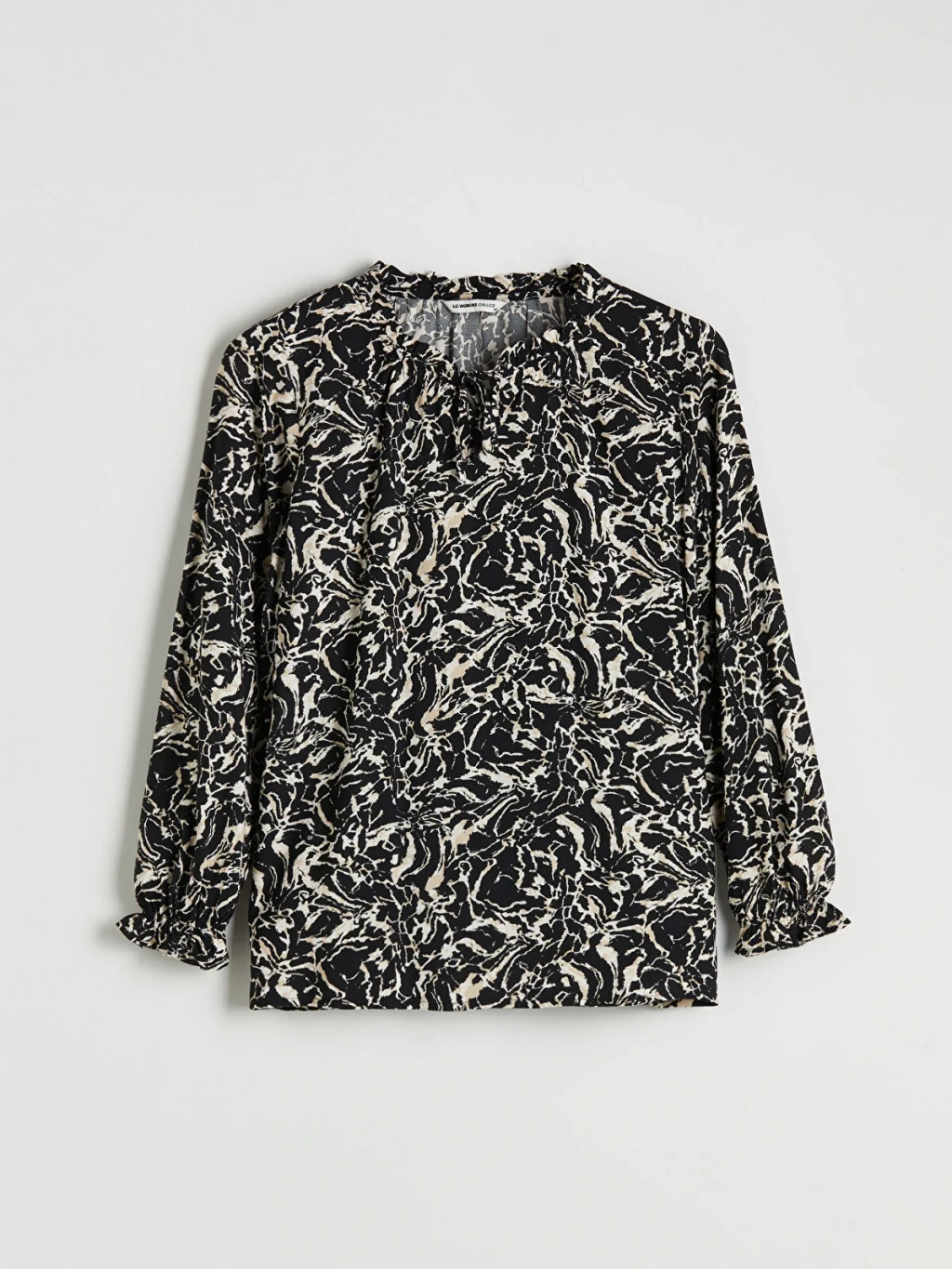 Bağlamalı yaka kadın bluz, viskon kumaştan üretilmiştir. Kol uçları ve yakası fırfırlı tasarıma sahiptir.