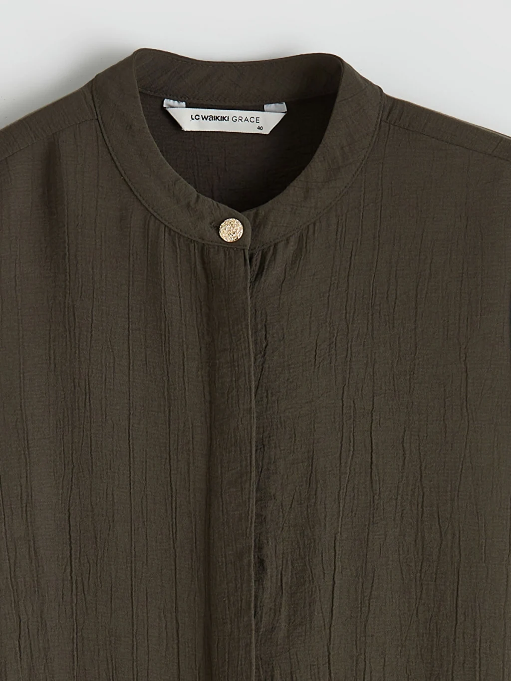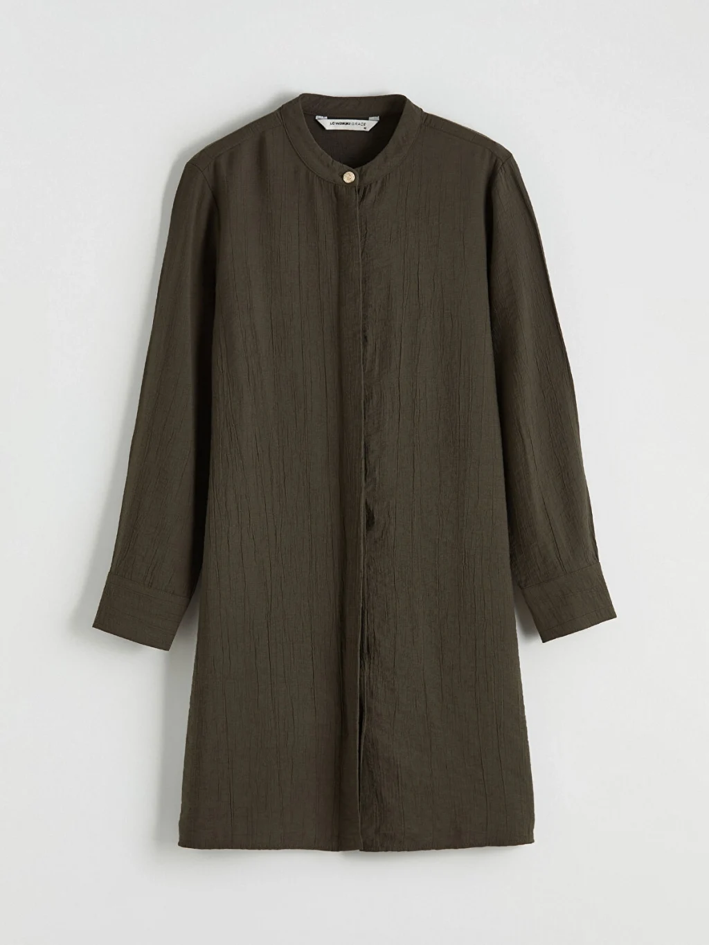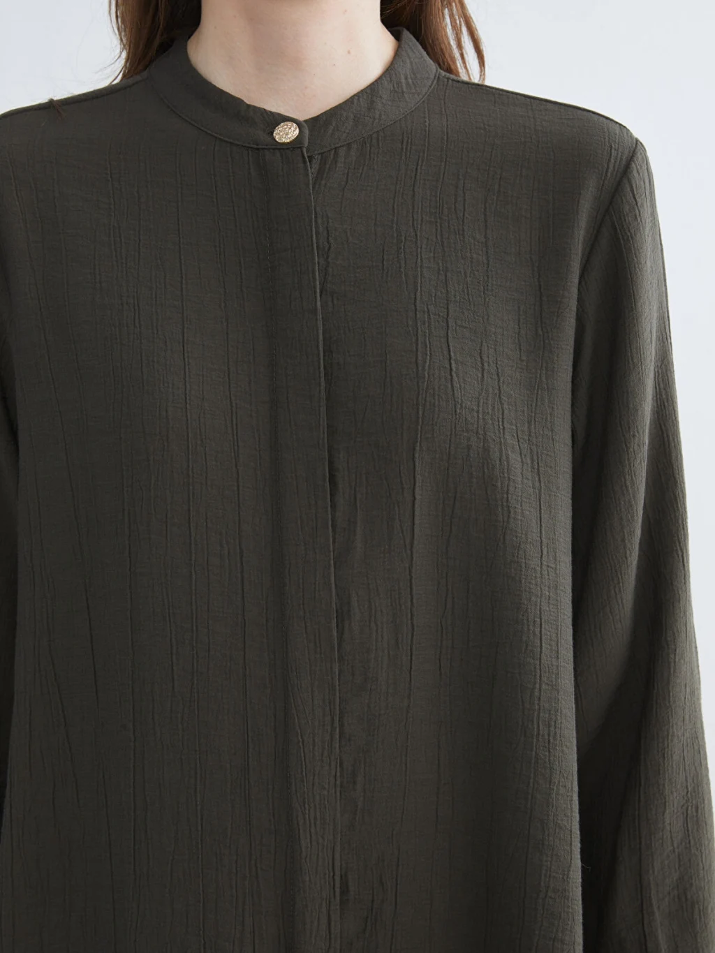 Hakim yakalı ve uzun kollu kadın gömlek tunik, dokulu kumaştan üretilmiştir. Önden düğme kapamalıdır ve kol uçları manşetlidir.