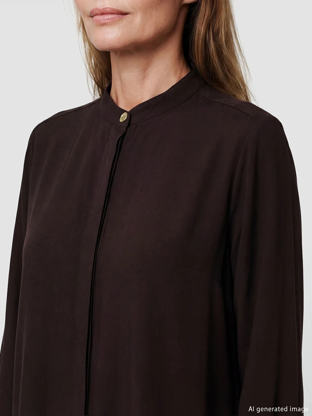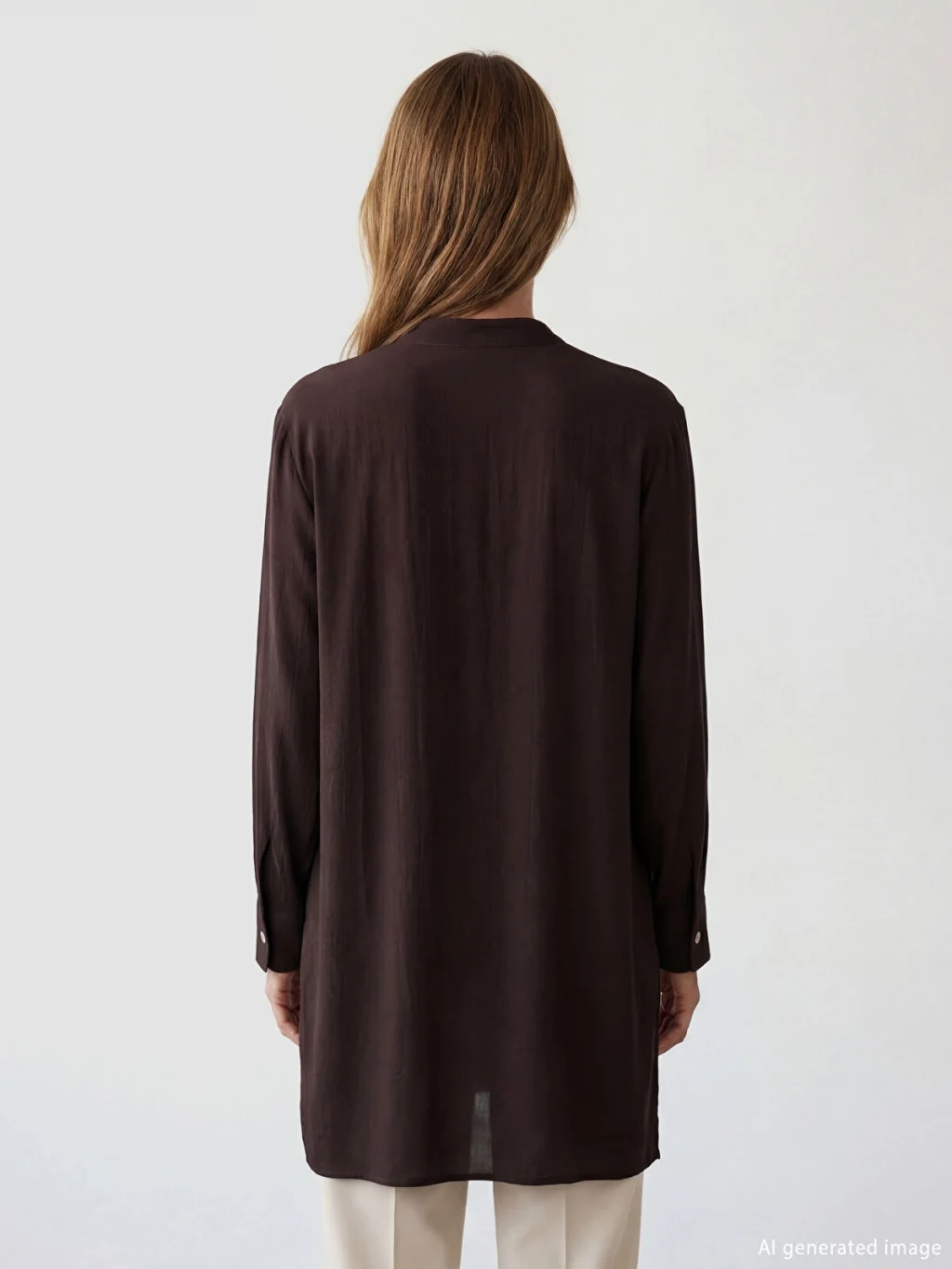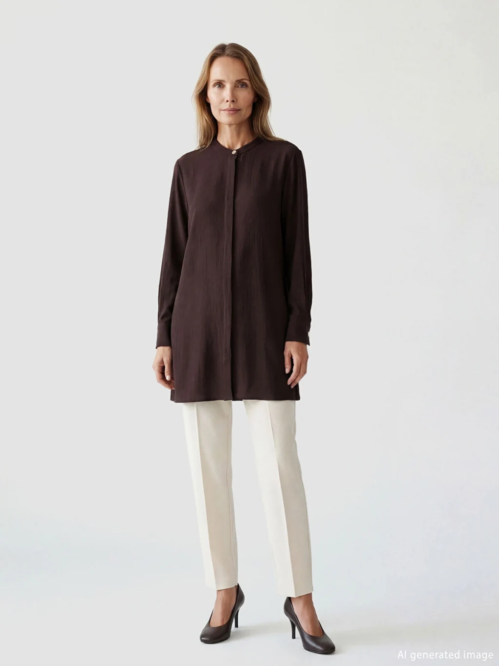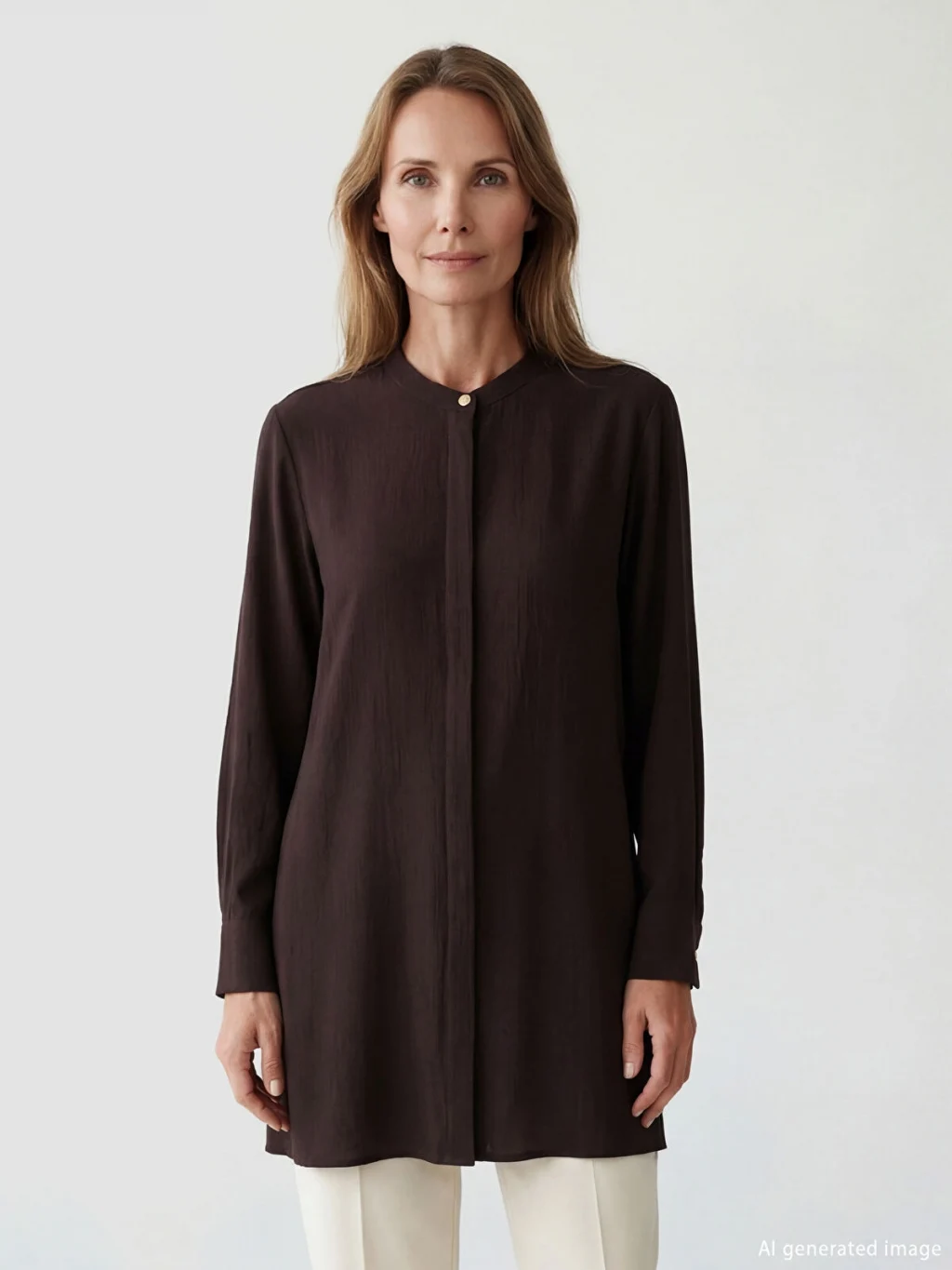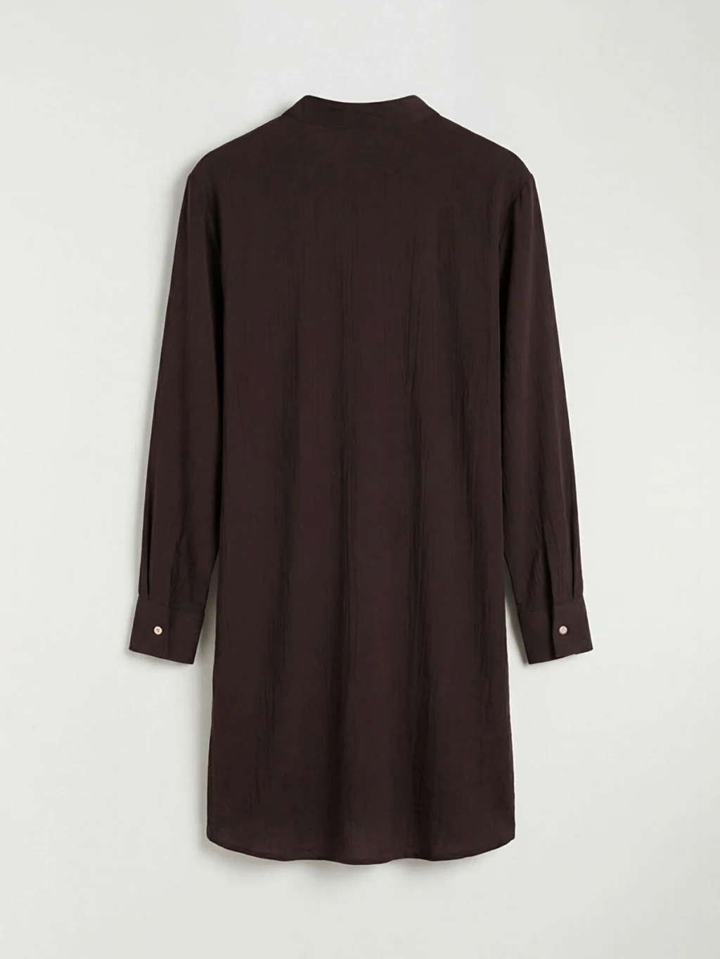 Hakim yakalı ve uzun kollu kadın gömlek tunik, dokulu kumaştan üretilmiştir. Önden düğme kapamalıdır ve kol uçları manşetlidir.