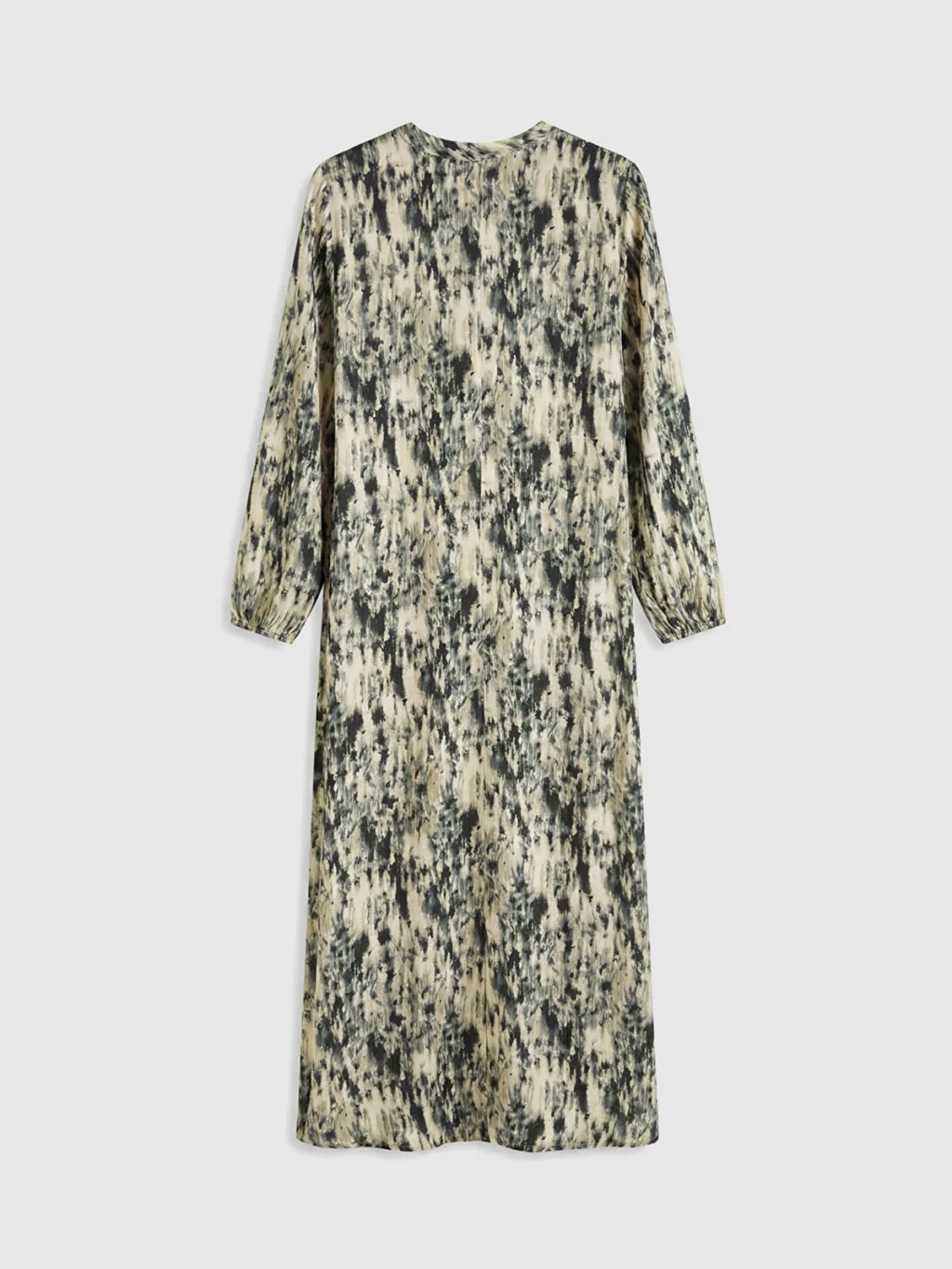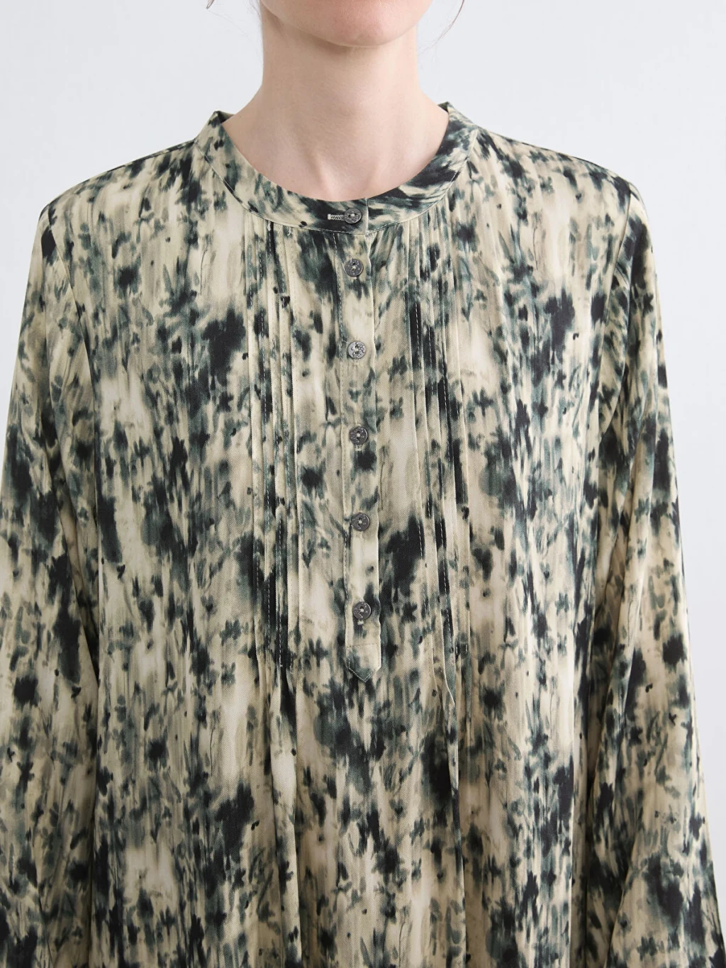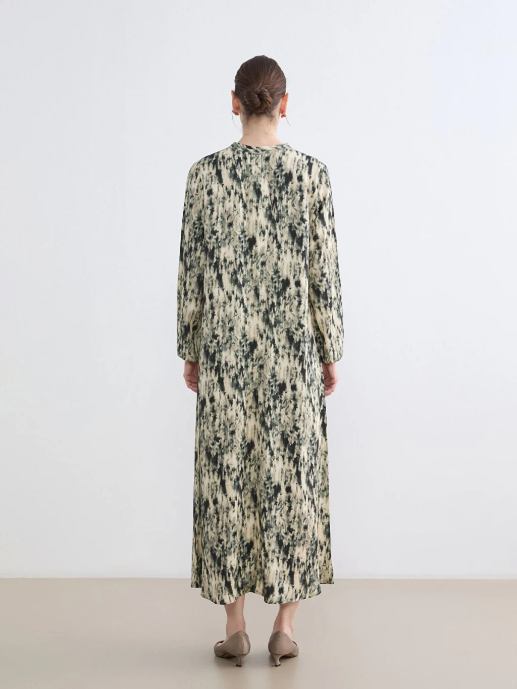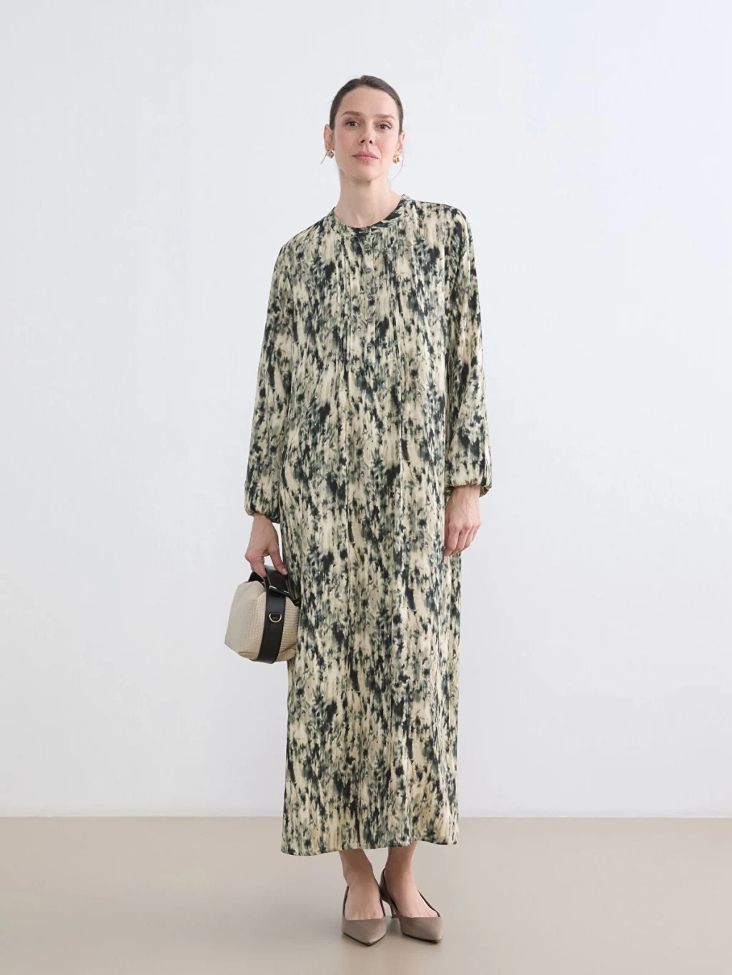 Kadın elbise, Belmando kumaştan üretilmiştir. Hakim yakalı, uzun kollu ve desenli bir tasarıma sahiptir. Önden düğme kapamalıdır ve kol uçları lastiklidir.