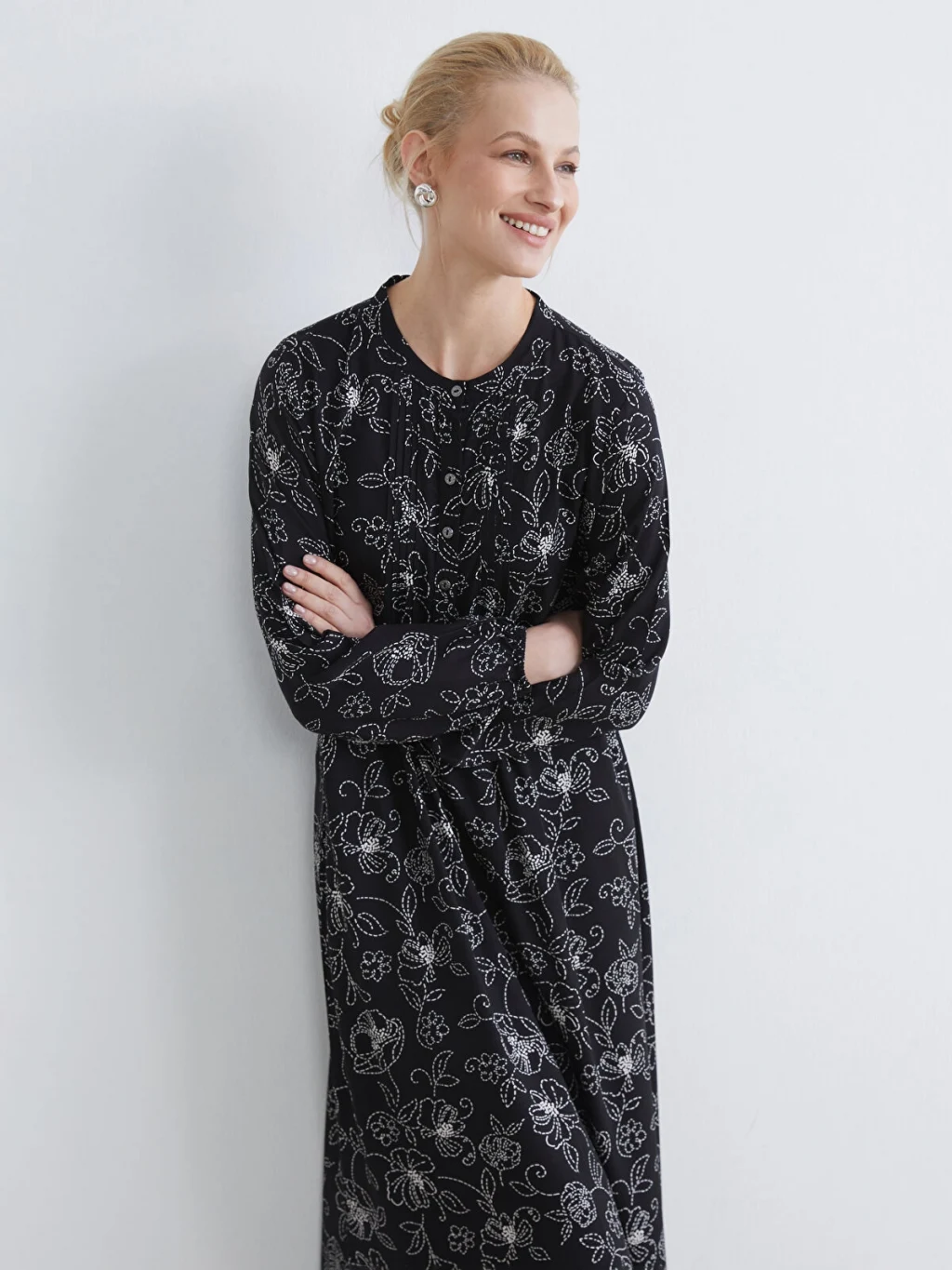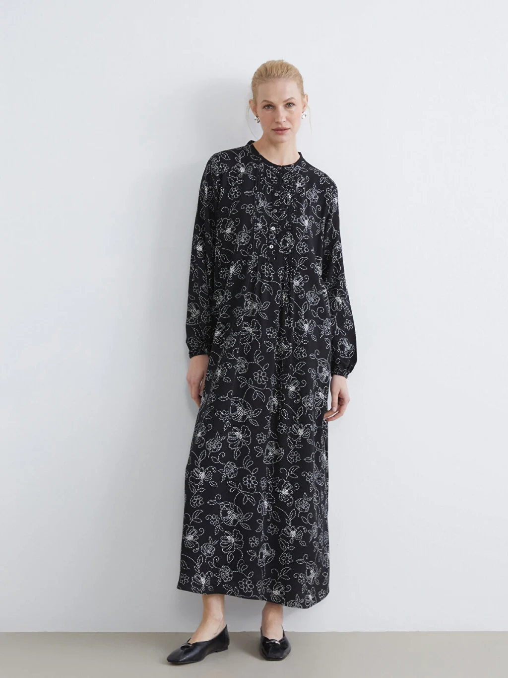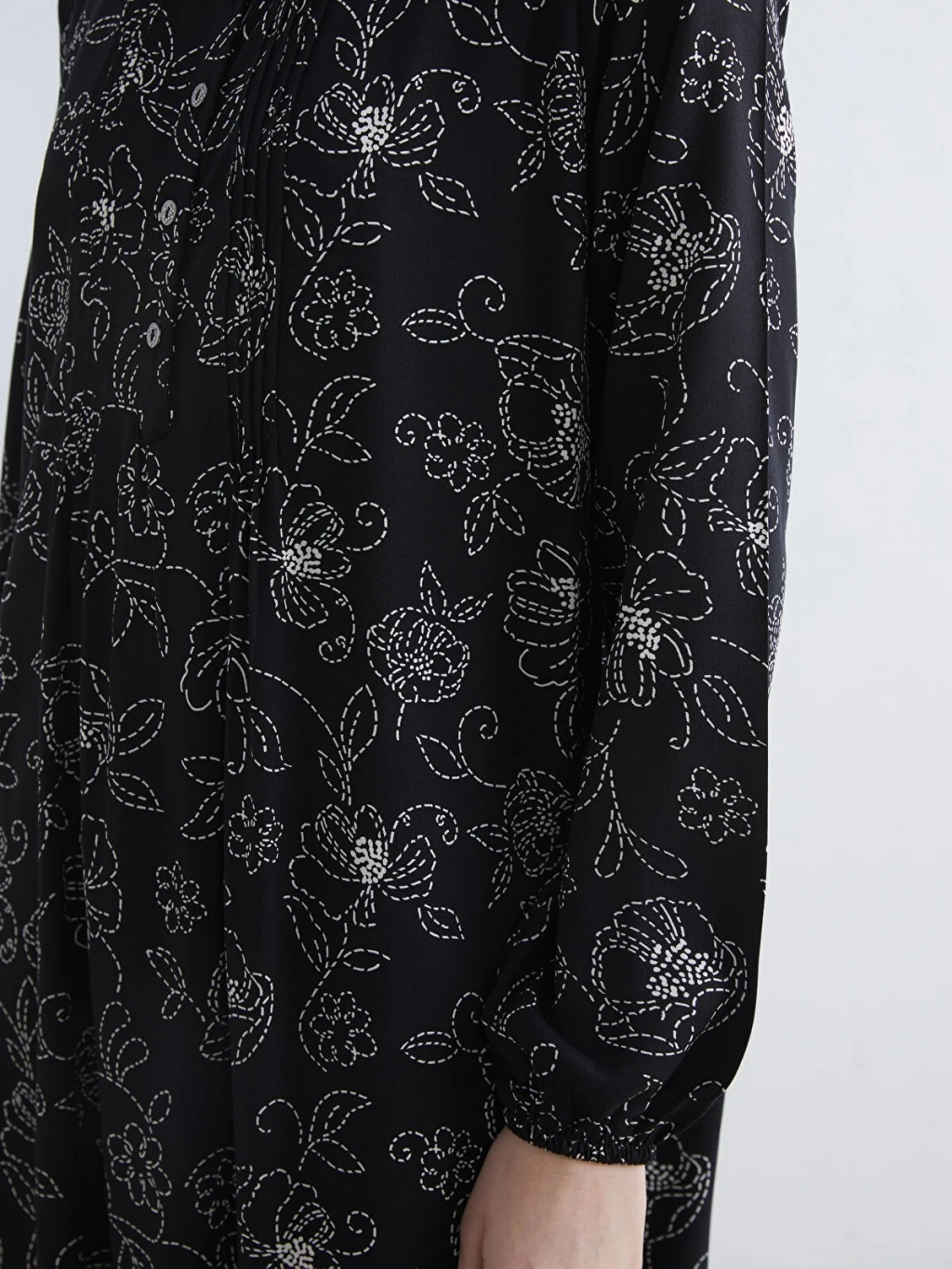 Kadın elbise, Belmando kumaştan üretilmiştir. Hakim yakalı, uzun kollu ve desenli bir tasarıma sahiptir. Önden düğme kapamalıdır ve kol uçları lastiklidir.