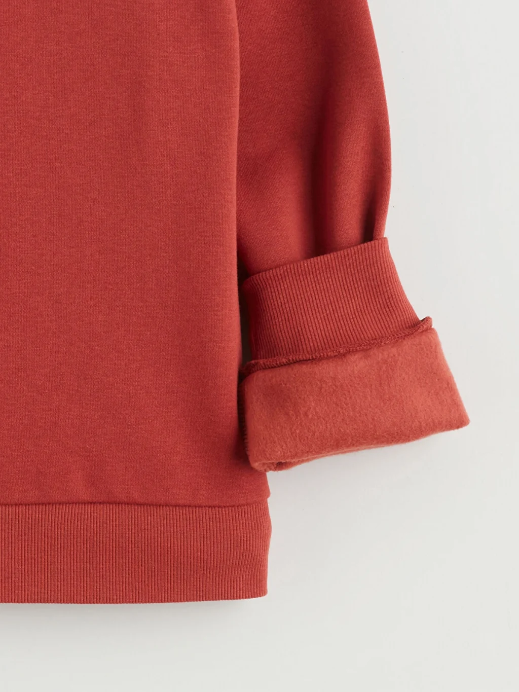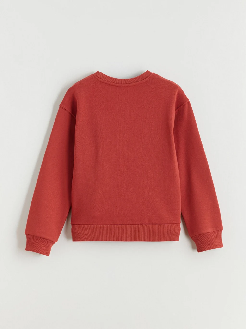 Kalın 3 iplik şardonlu kumaştan üretilen kız çocuk sweatshirt, bisiklet yaka ve uzun kolludur. Önü yazı baskılı, kol ve etek ucu ribanalıdır.