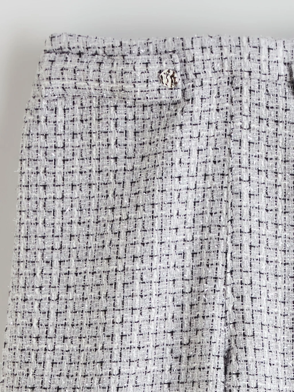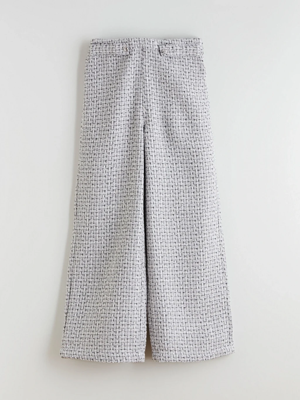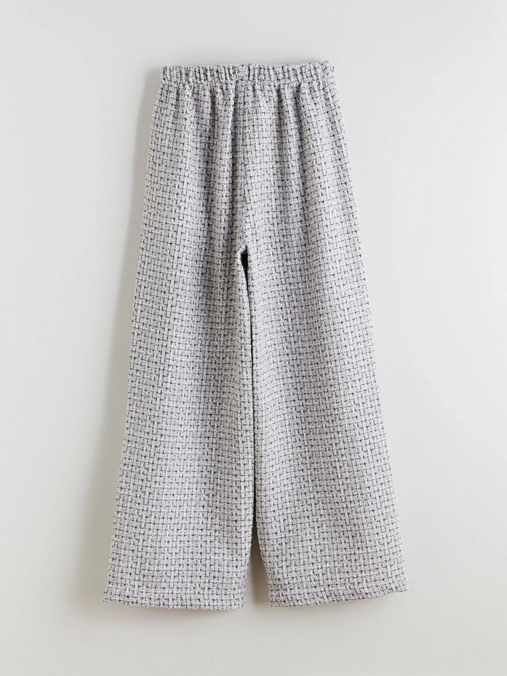 Bol kalıplı kız çocuk pantolon, tüvit kumaştan üretilmiştir. Beli lastikli olan pantolon, geniş paça kesimlidir.