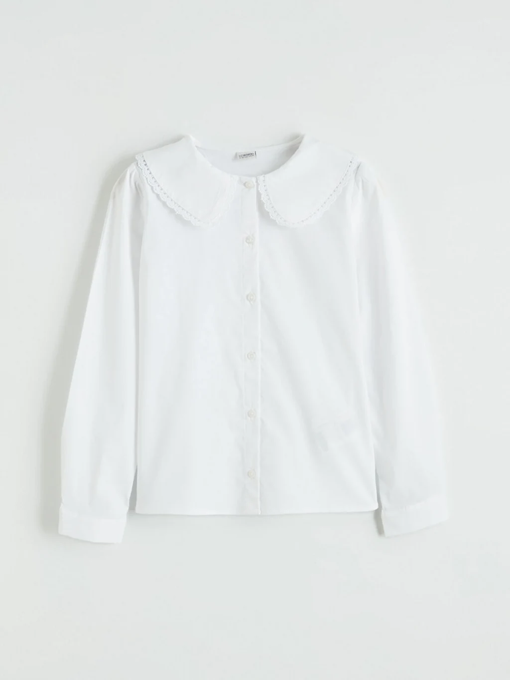 Uzun kollu kız çocuk gömlek, yaka kenarları nakış detaylı bebe yakalıdır ve önden düğme kapamalıdır.