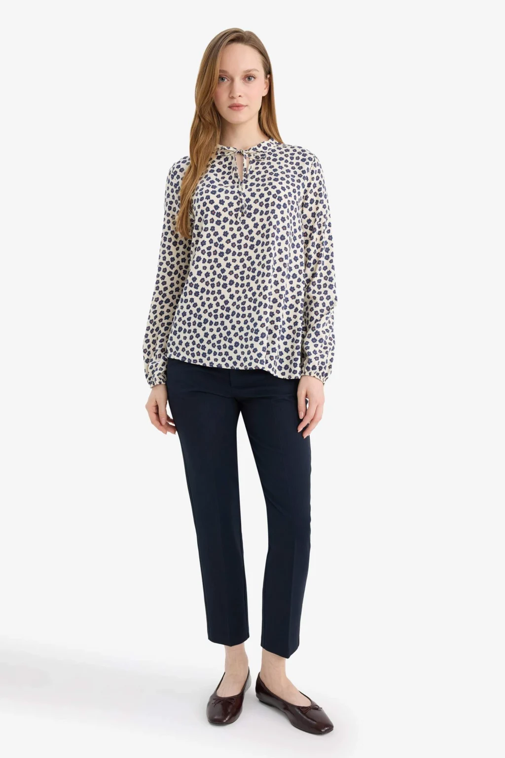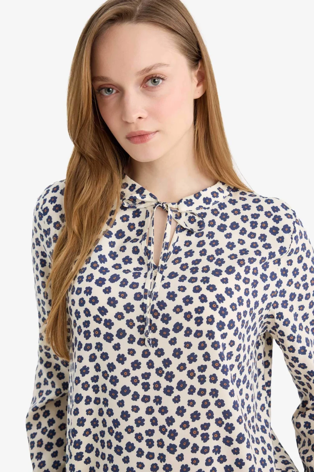 Regular Fit Desenli Uzun Kollu Bluz, zarif bağcıklı yaka detayı ve şık desenleriyle feminen bir görünüm sunar. Rahat kesimi ve yumuşak kumaşıyla gün boyu konfor sağlar, hem günlük hem özel anlara uygun şık bir tercihtir.