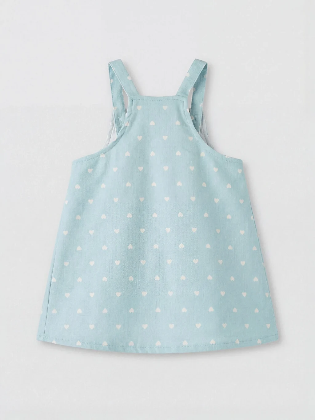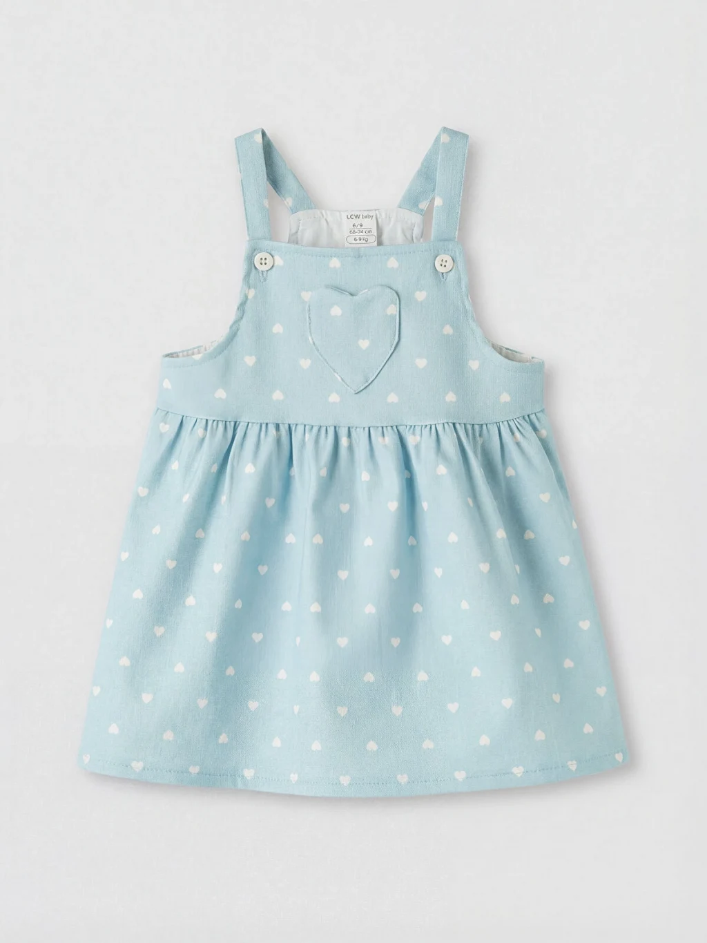 Kız bebek elbise takımı, fırfırlı bisiklet yakalı, kısa kollu tişört ve desenli, düğme kapamalı askılı salopet elbiseden oluşur.