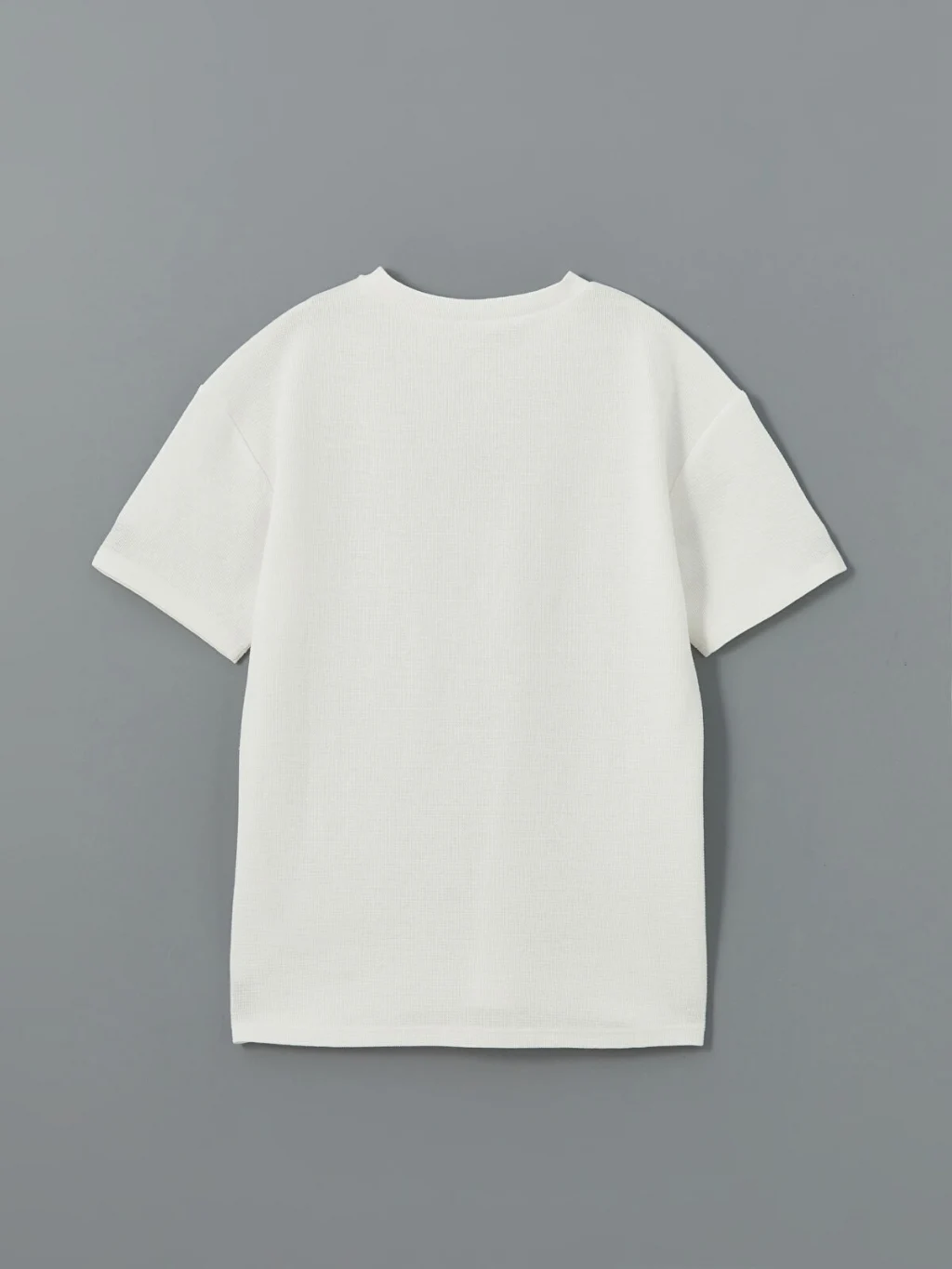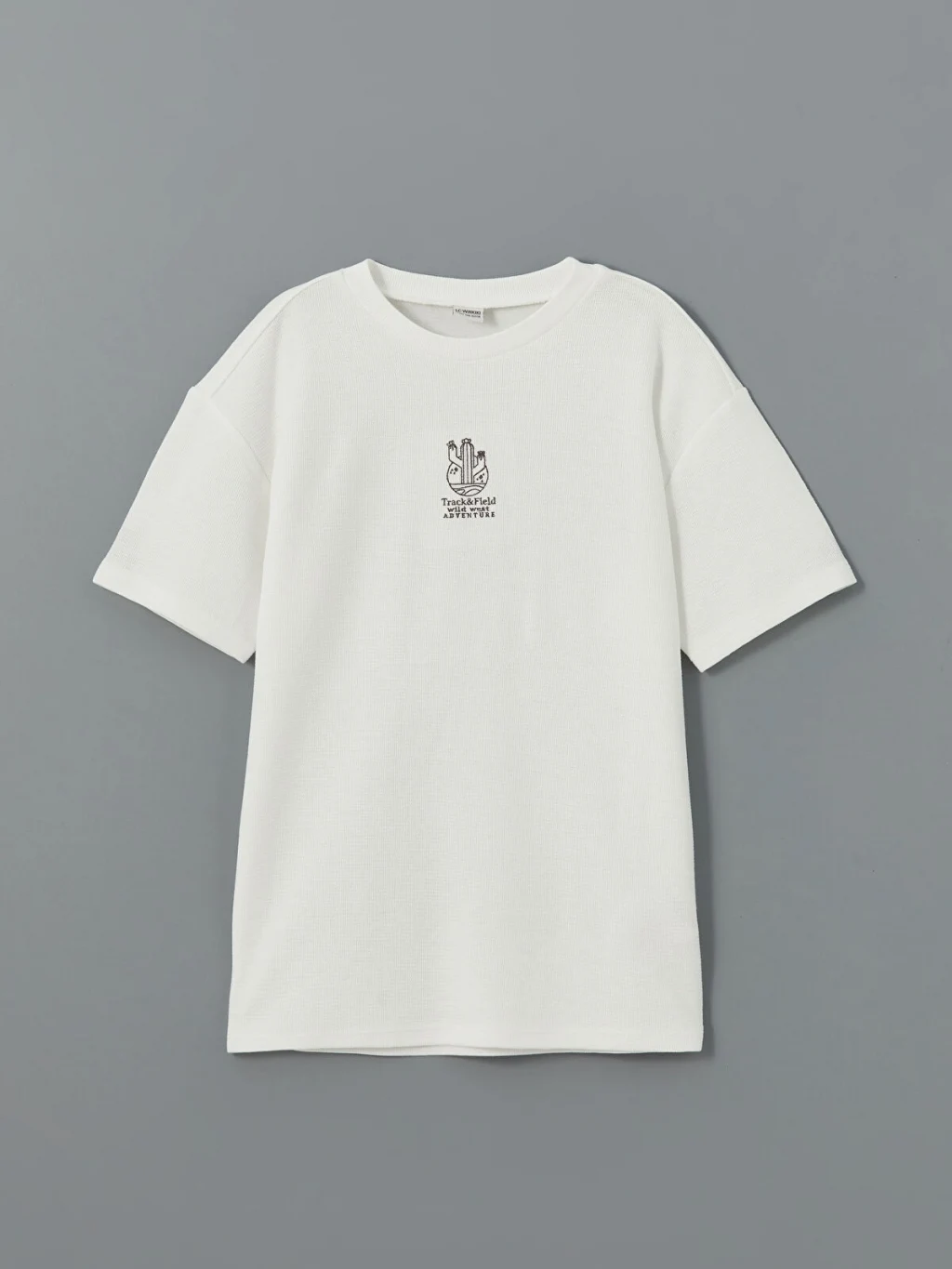 Bisiklet yaka ve kısa kollu erkek çocuk tişört, waffle kumaştan üretilmiştir. Bol kalıplı ve önü baskılıdır.