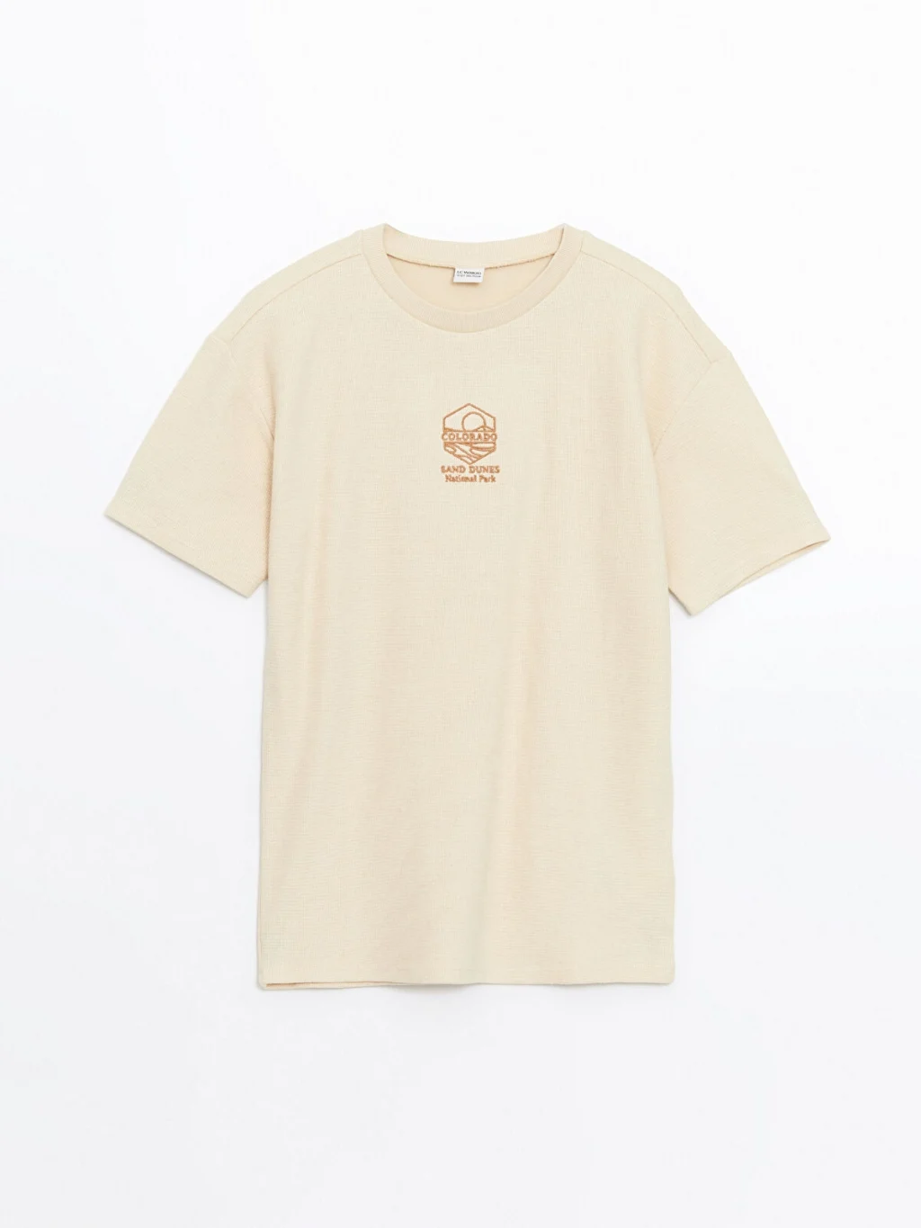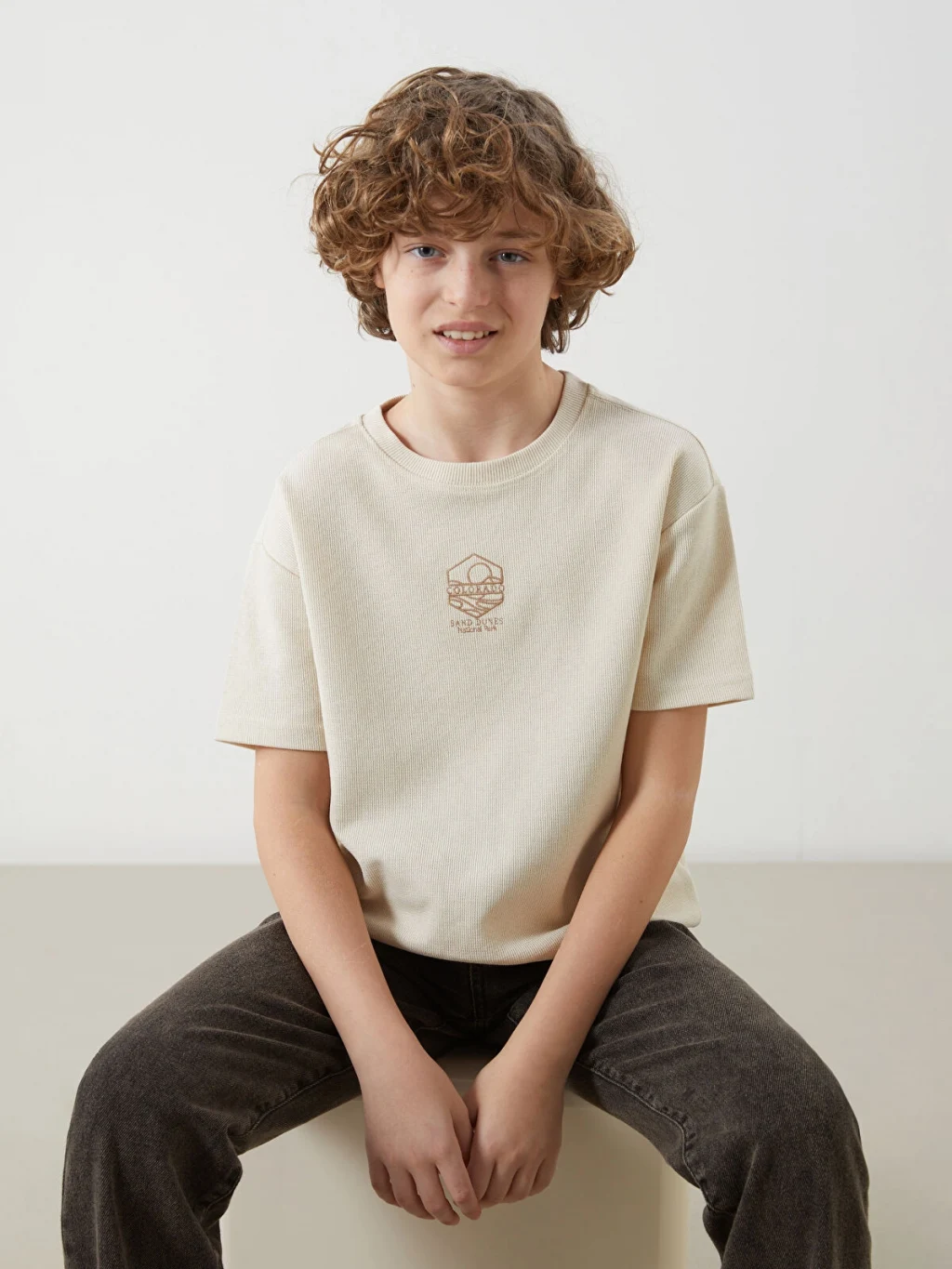 Bisiklet yaka, kısa kollu erkek çocuk tişört, waffle kumaştan üretilmiştir. Bol kalıplı tişörtün göğüs kısmında baskı detayı bulunur.