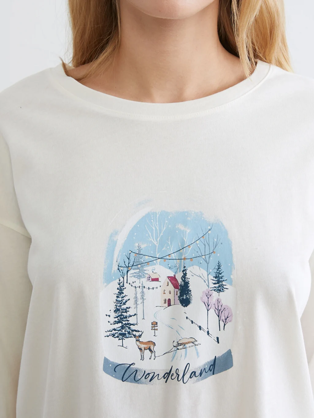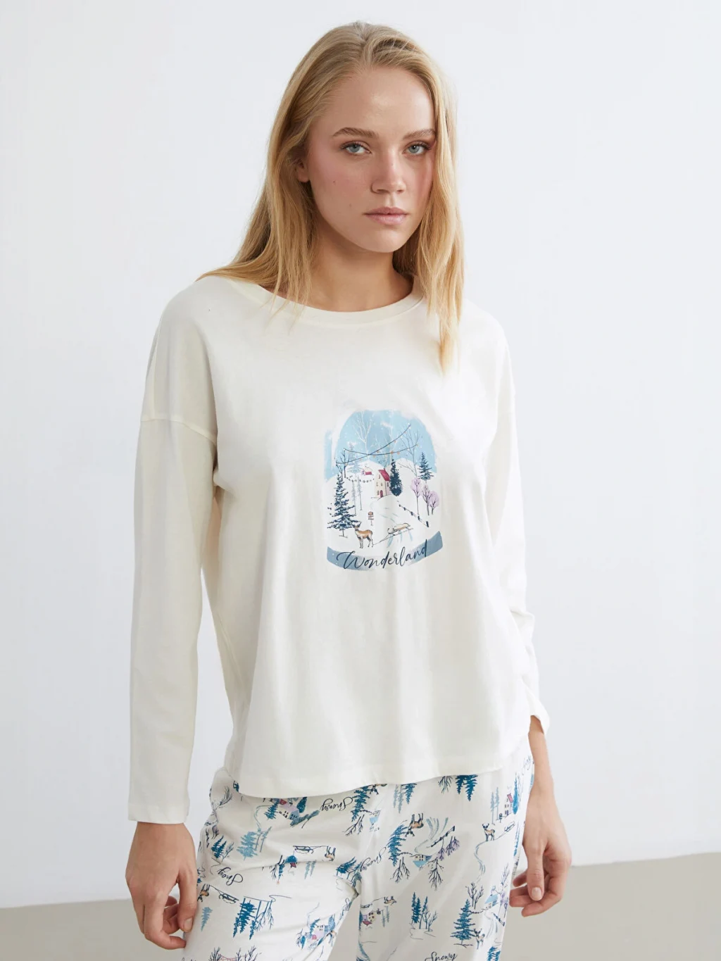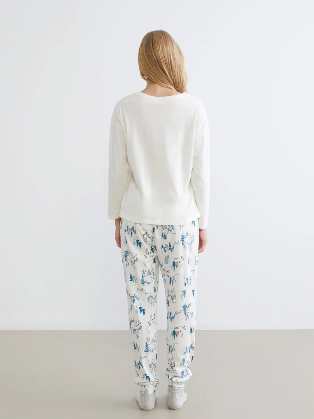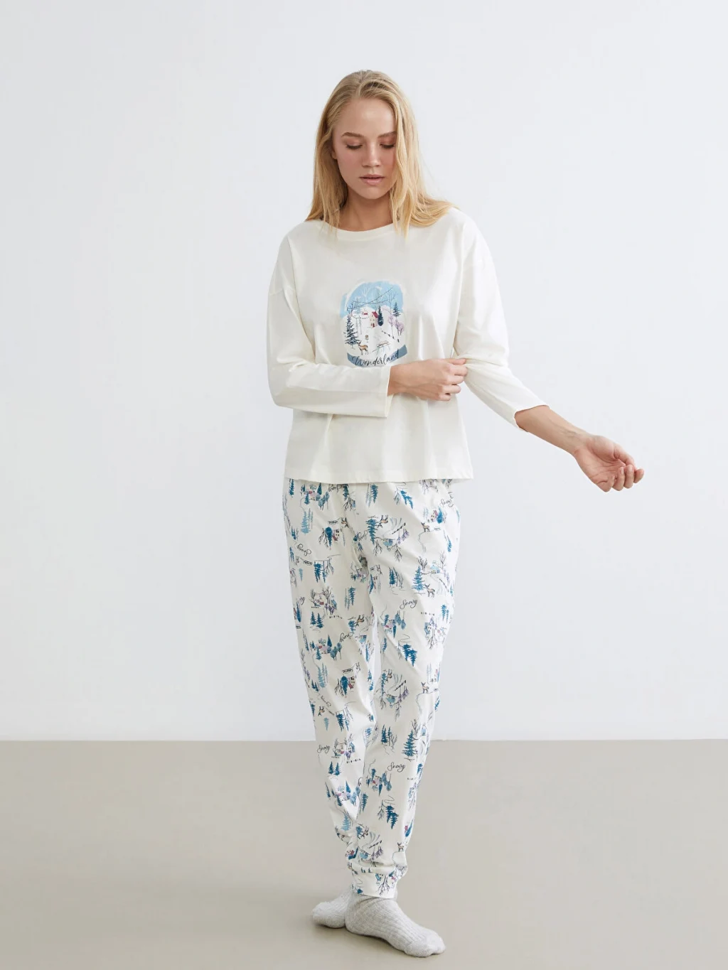 %100 pamuklu penye kumaştan üretilen kadın pijama takımı, bisiklet yaka, uzun kollu, baskılı üst ve paçaları lastikli, desenli alttan oluşur.