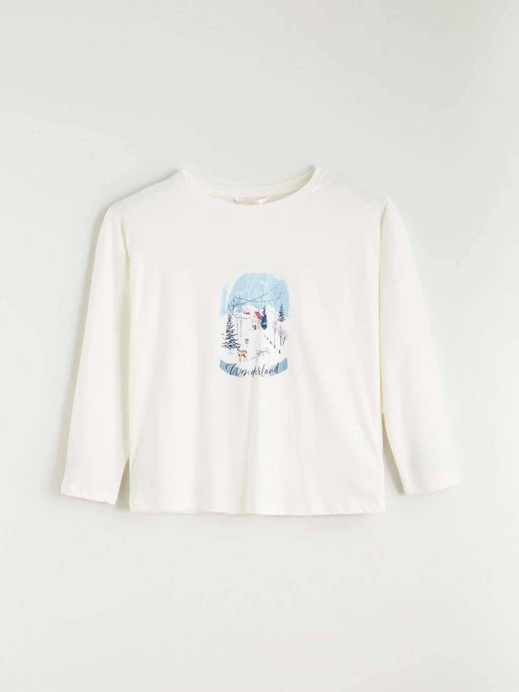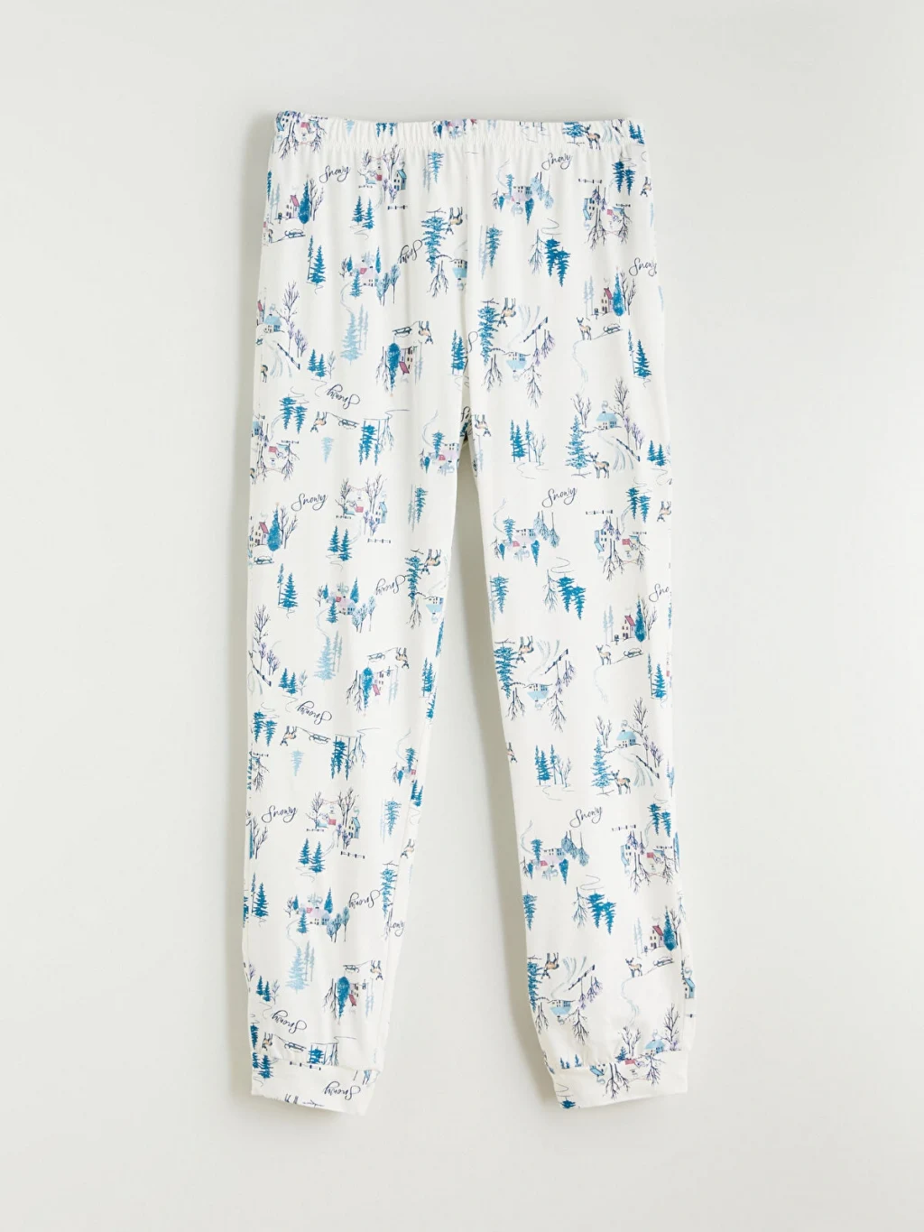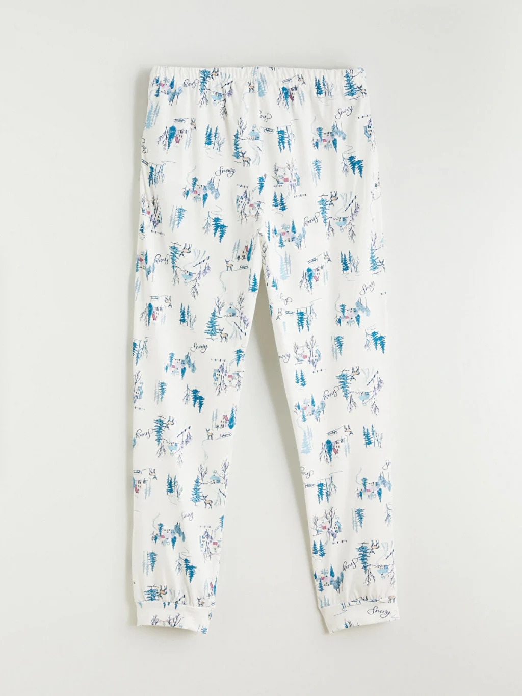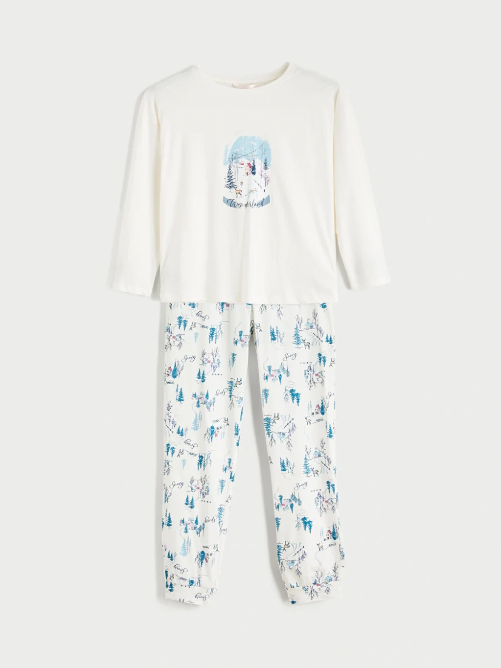 %100 pamuklu penye kumaştan üretilen kadın pijama takımı, bisiklet yaka, uzun kollu, baskılı üst ve paçaları lastikli, desenli alttan oluşur.