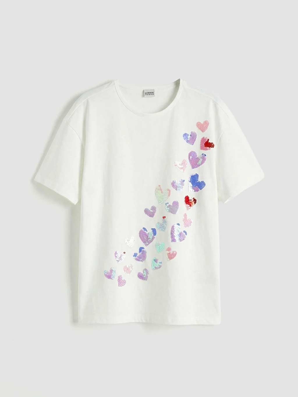 Bisiklet yaka ve kısa kollu kız çocuk tişört, pamuklu penye kumaştan üretilmiştir. Bol kalıplıdır ve önü payet işlemeli kalp desenlidir.