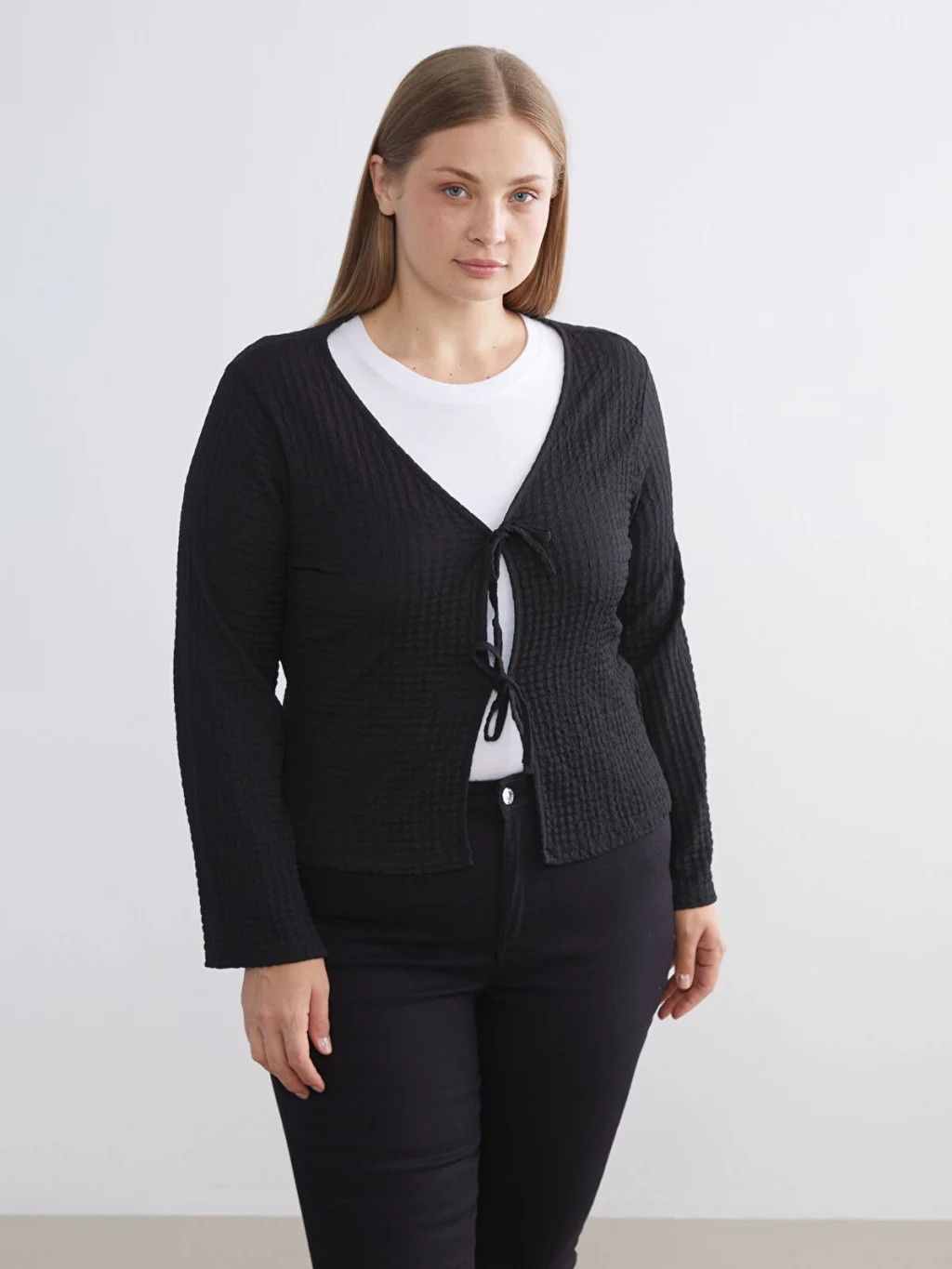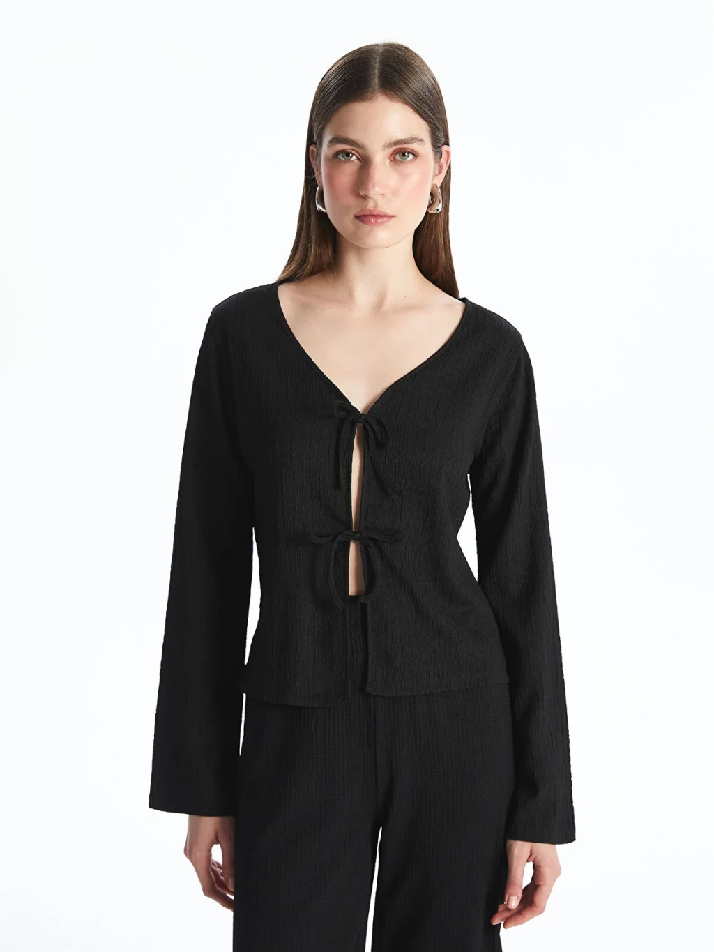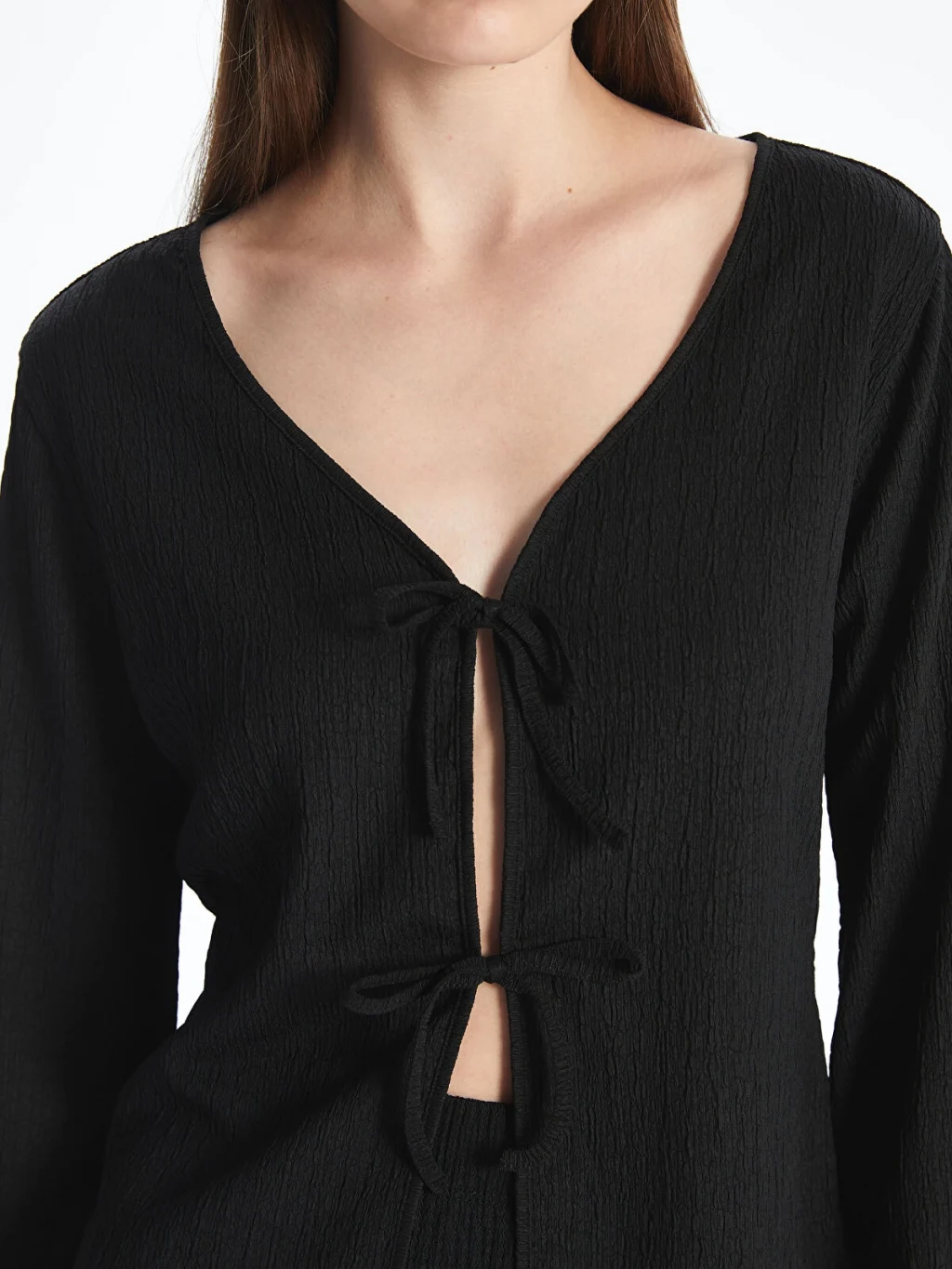 V yakalı, uzun kollu kadın bluz, dokulu kumaştan üretilmiştir. Önü iki adet bağcık detayı ile kapanmaktadır.