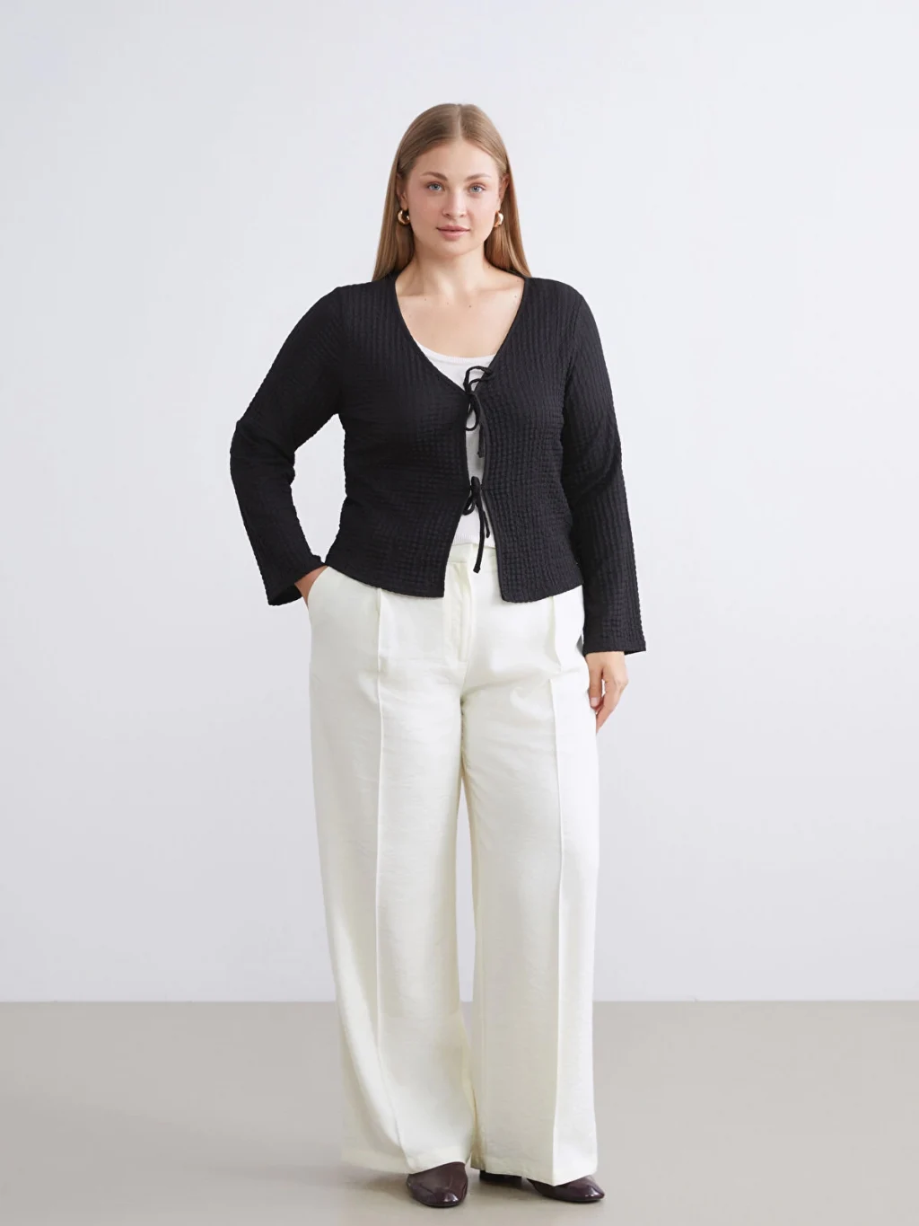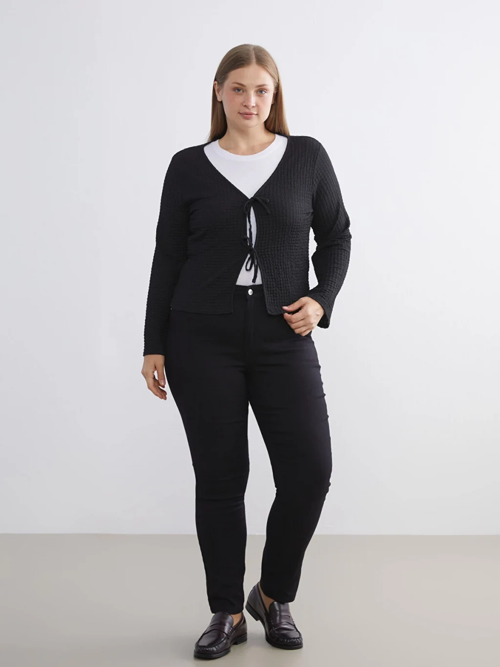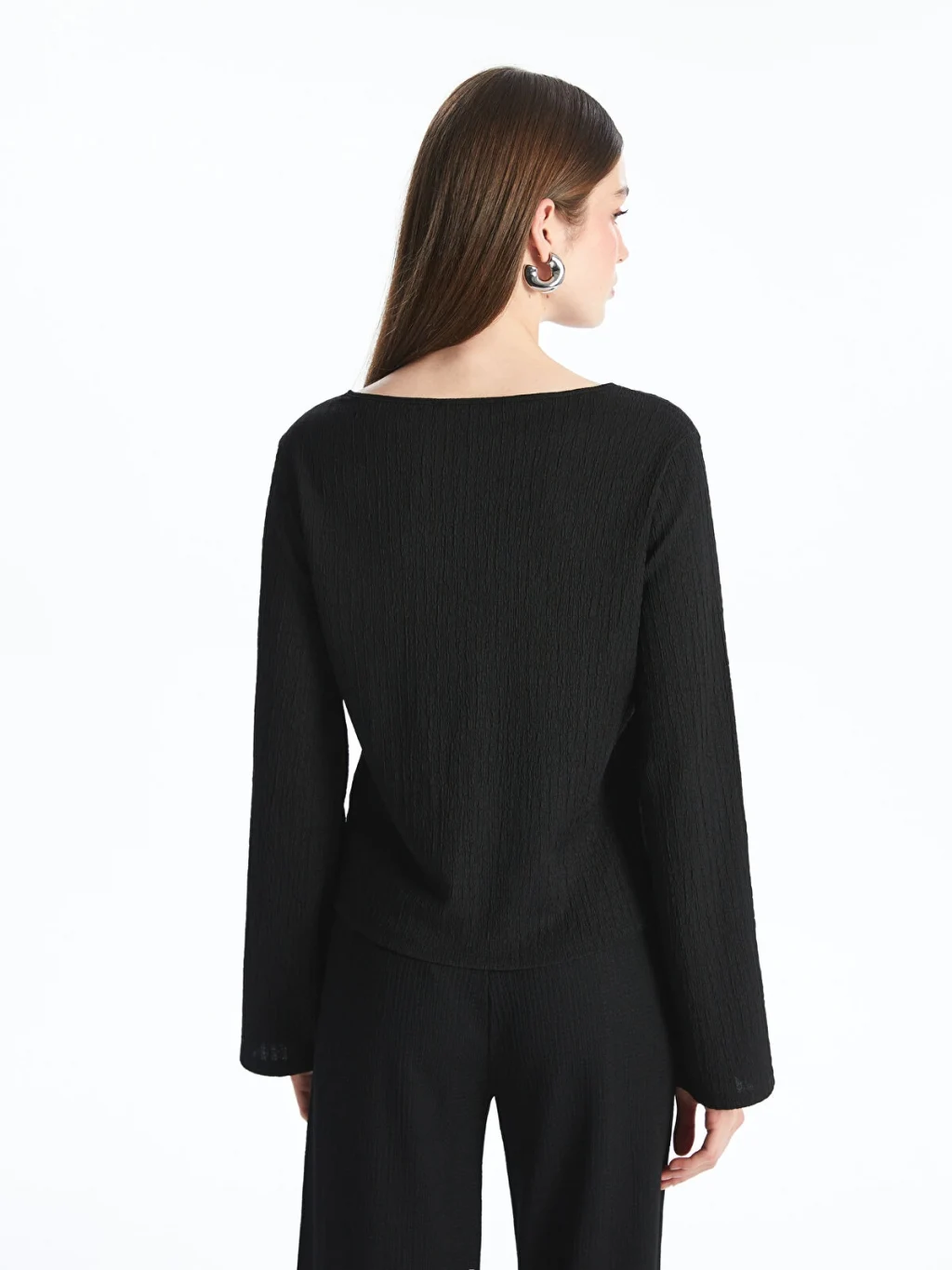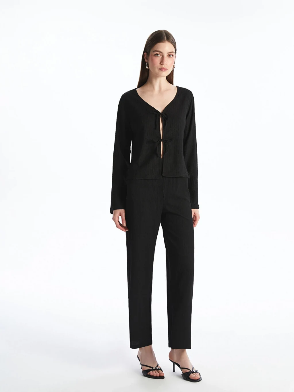 V yakalı, uzun kollu kadın bluz, dokulu kumaştan üretilmiştir. Önü iki adet bağcık detayı ile kapanmaktadır.