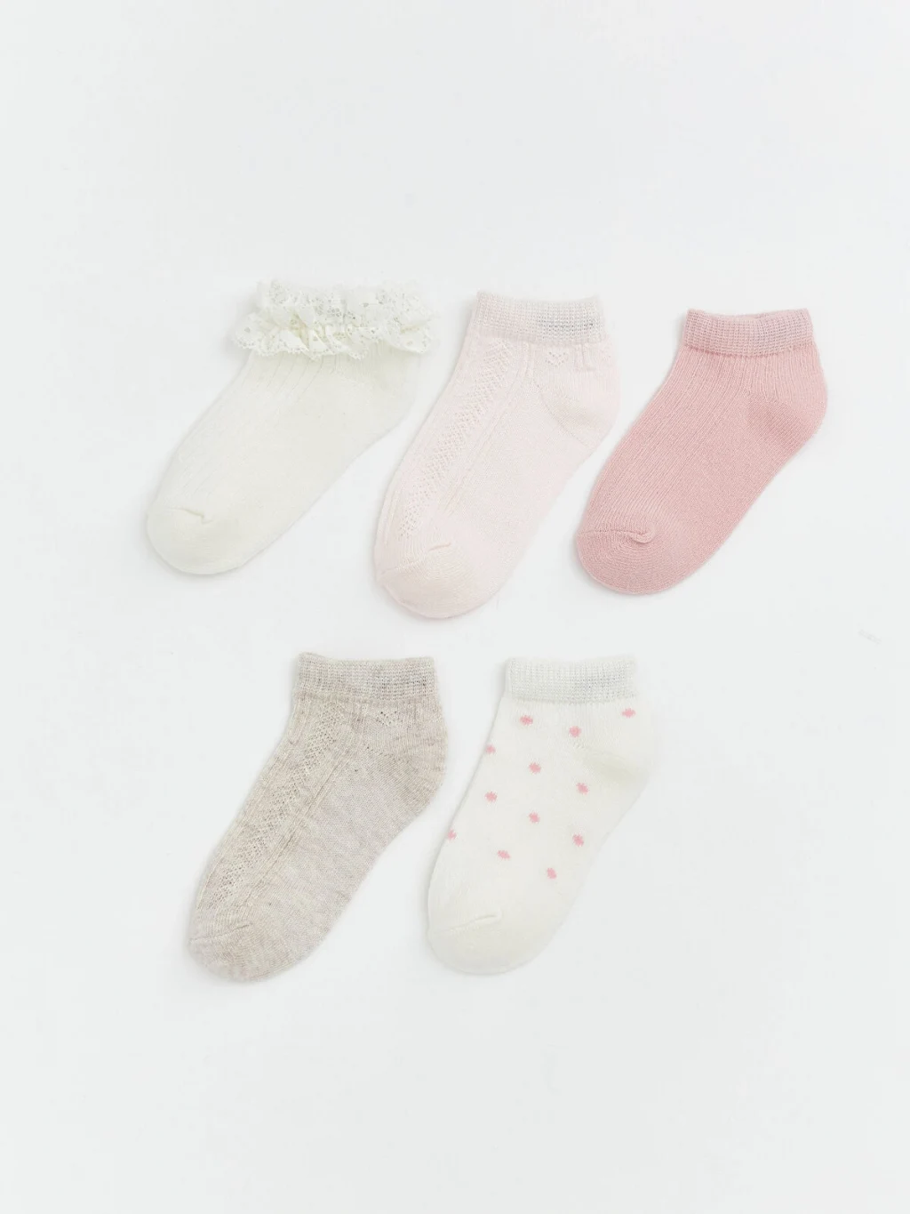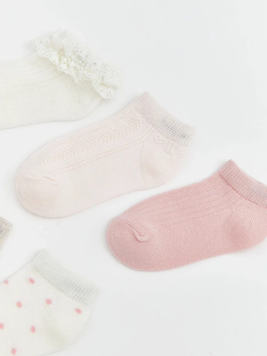 Farklı desen ve dokulara sahip kız bebek patik çorap seti; fırfır detaylı, puantiyeli ve fitilli modellerden oluşur.
