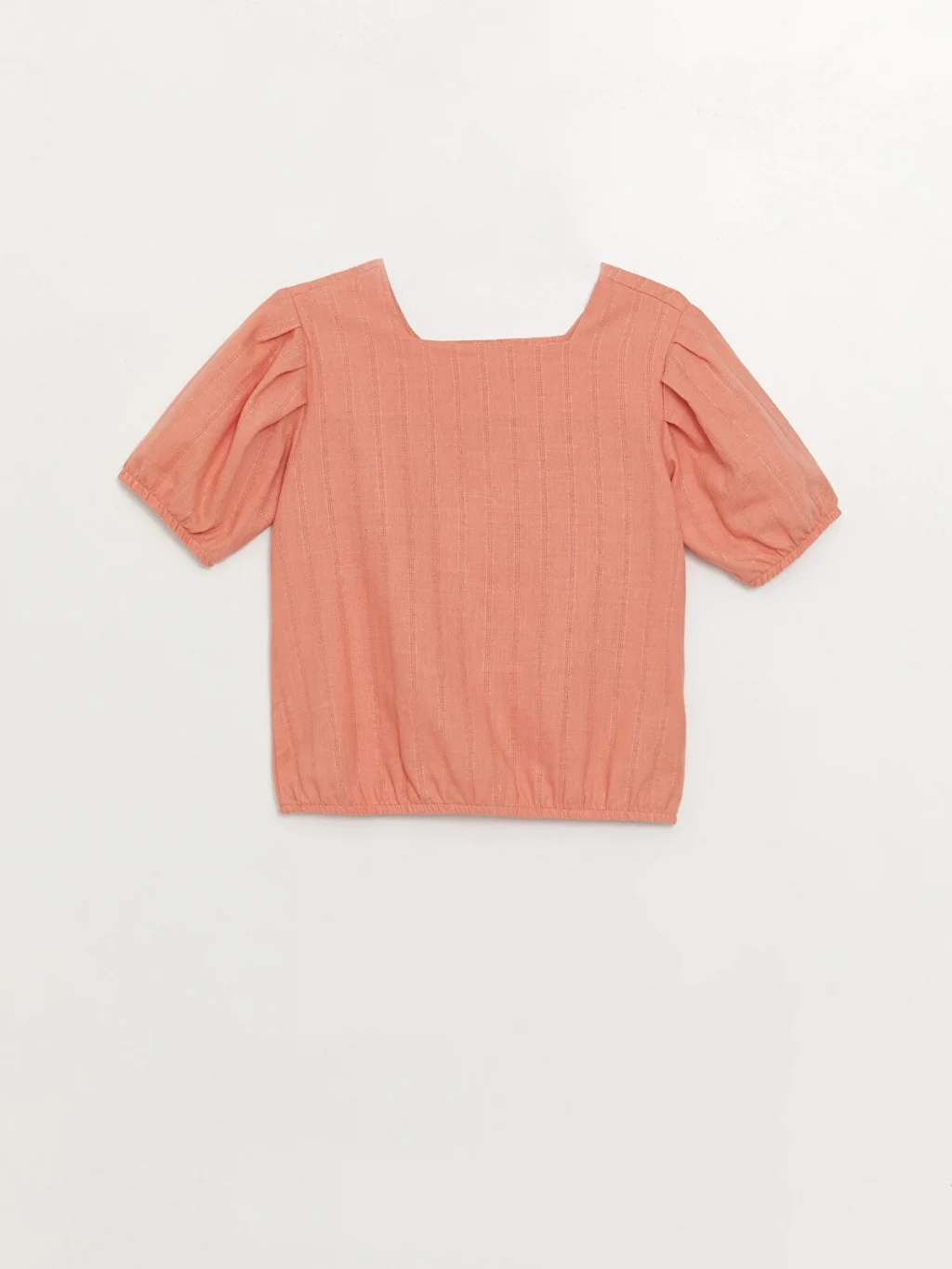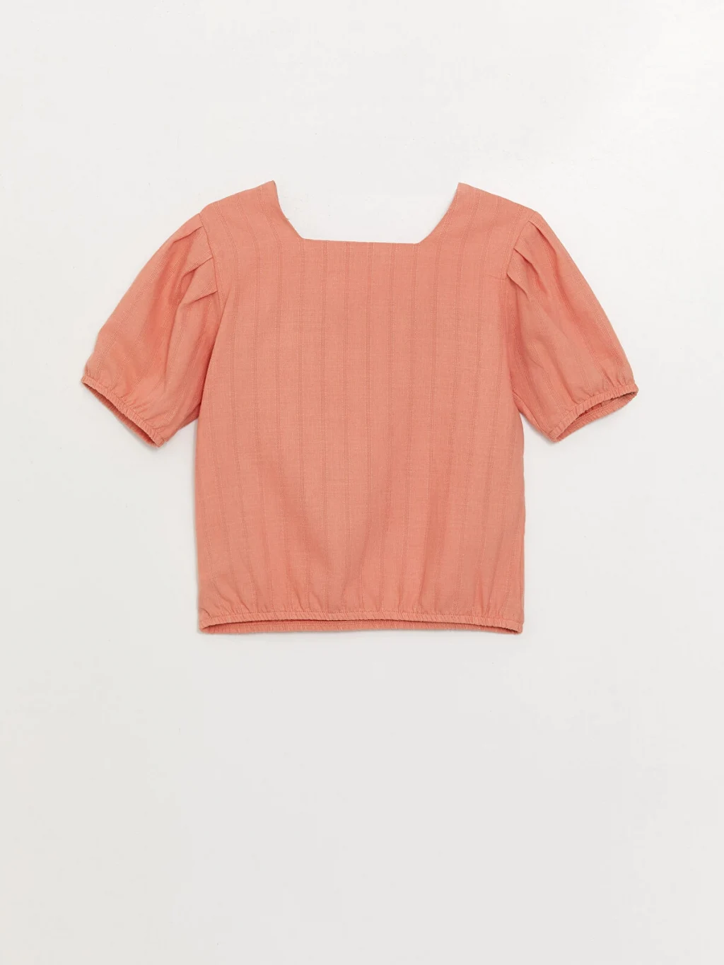 Kısa kollu kız çocuk bluz, kare yaka tasarımıyla şık ve zarif bir görünüm sağlıyor. Keten karışımlı kumaşın kullanımı ise nefes alabilen, hafif ve serin tutma özelliğiyle kız çocuğunuzun rahat etmesini sağlar.