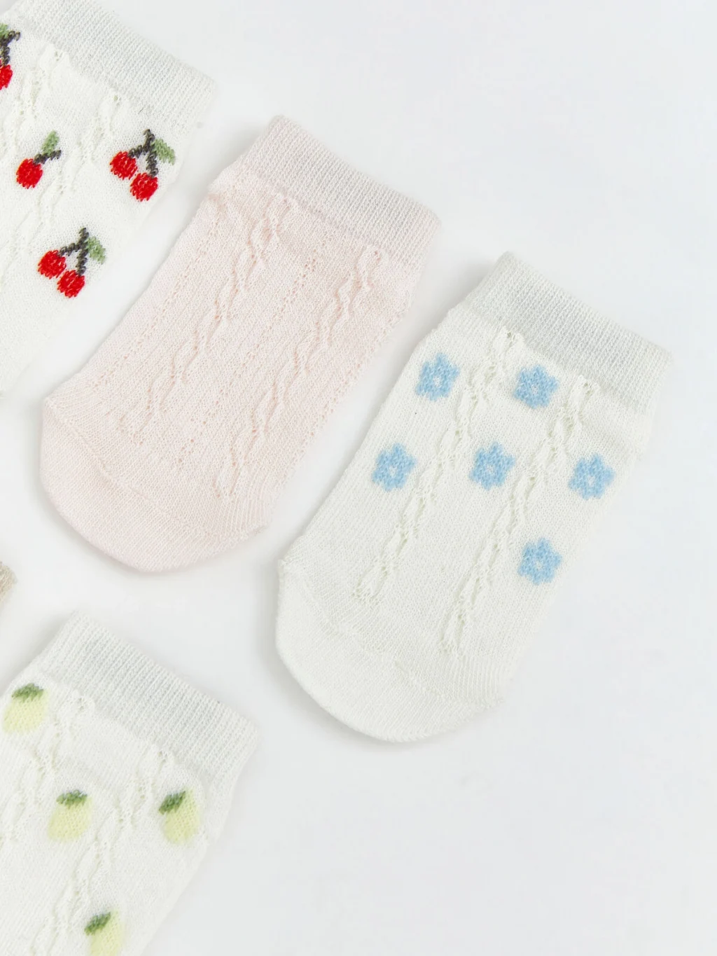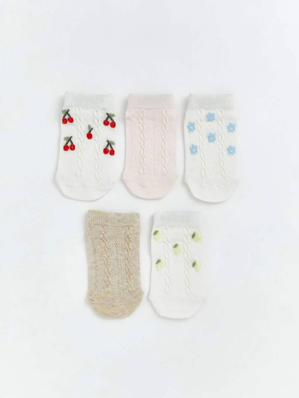 Saç örgüsü dokulu kız bebek patik çorap; işleme çiçek, meyve desenli ve desensiz seçeneklere sahiptir.