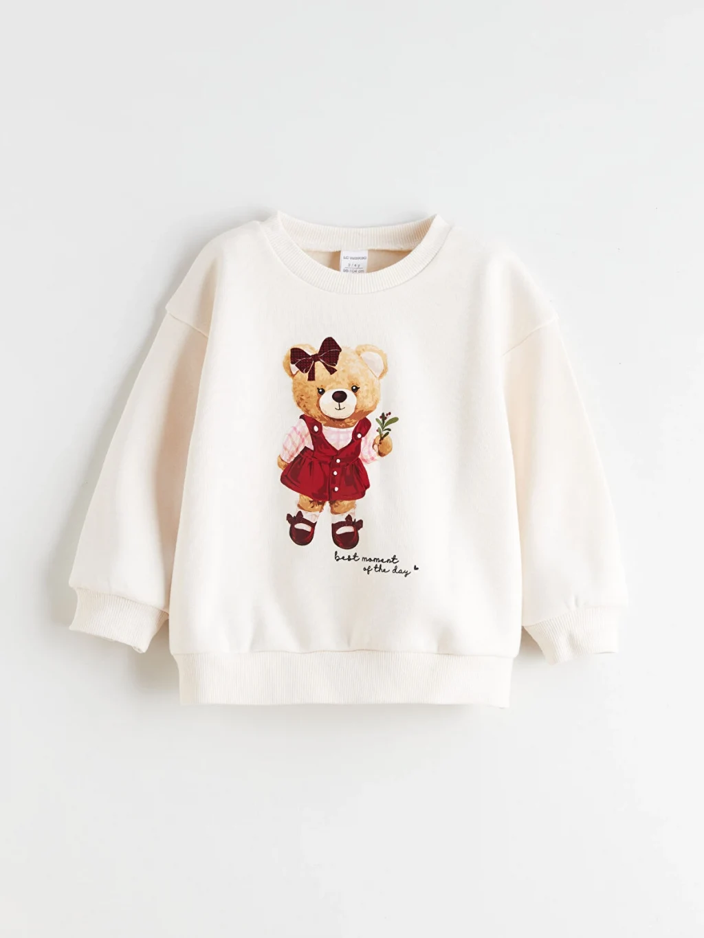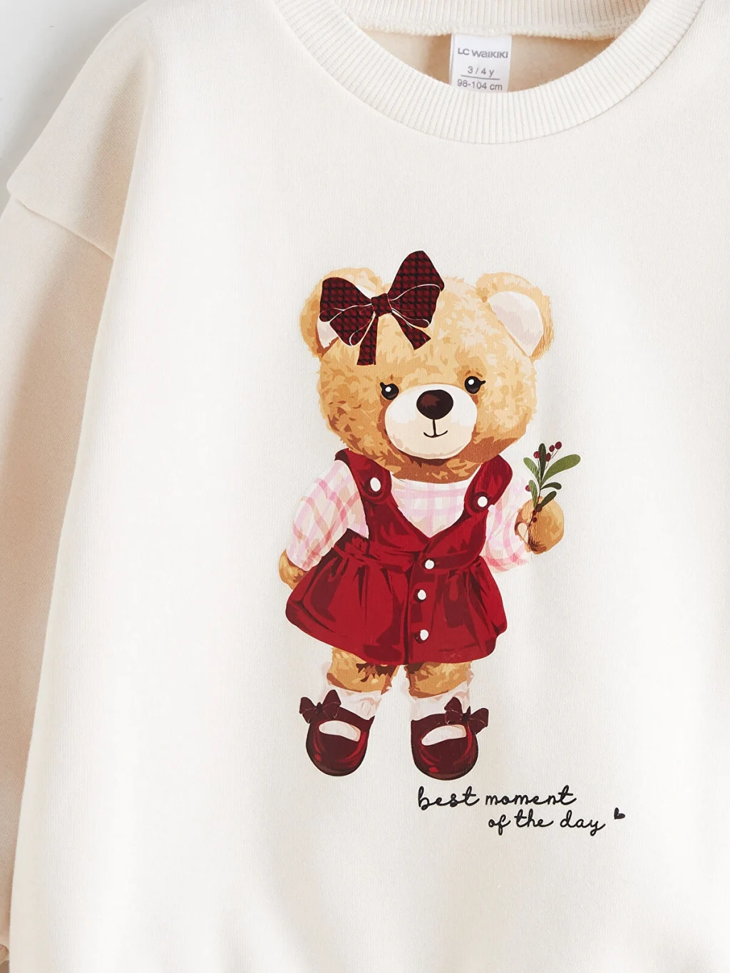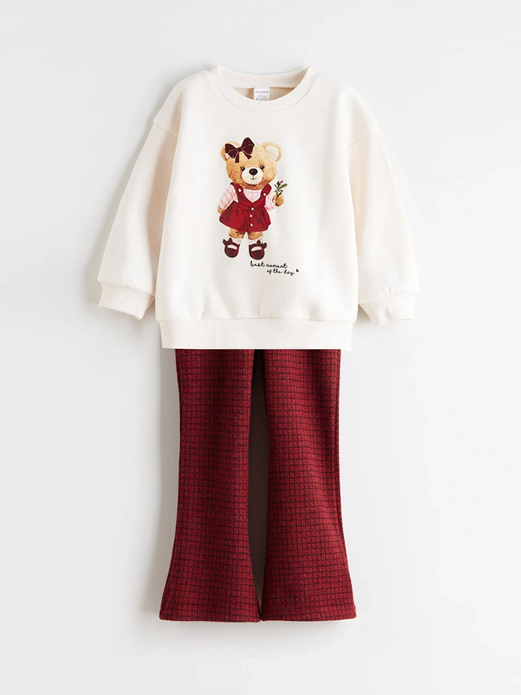 Kız çocuk takım, 3 iplik şardonlu kumaştan üretilmiş bisiklet yaka, uzun kollu, baskılı sweatshirt ve desenli, İspanyol paça pantolondan oluşur.