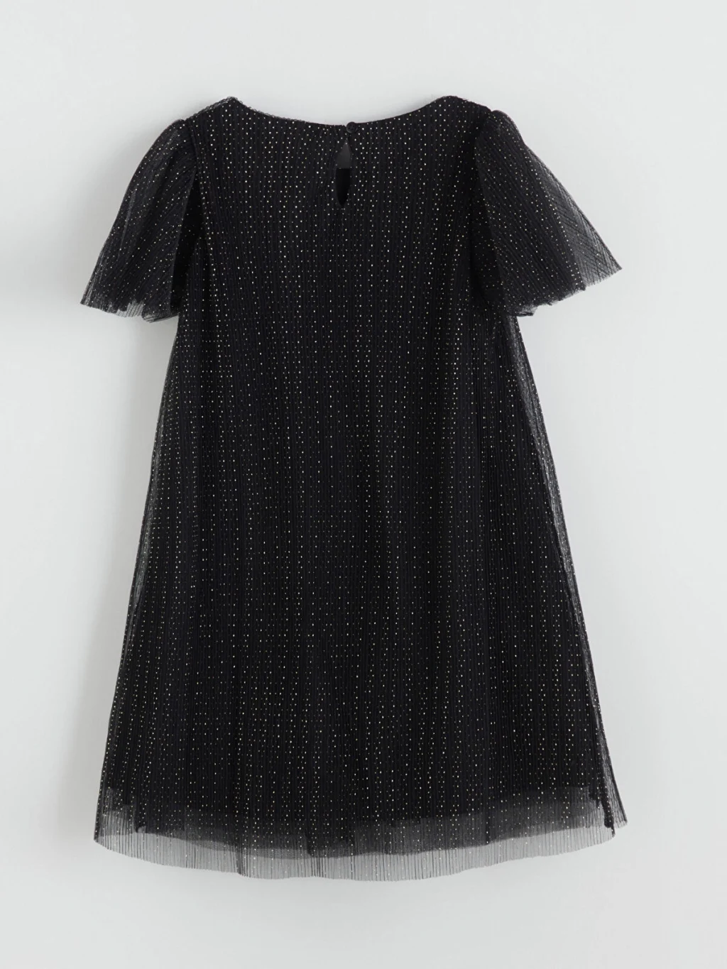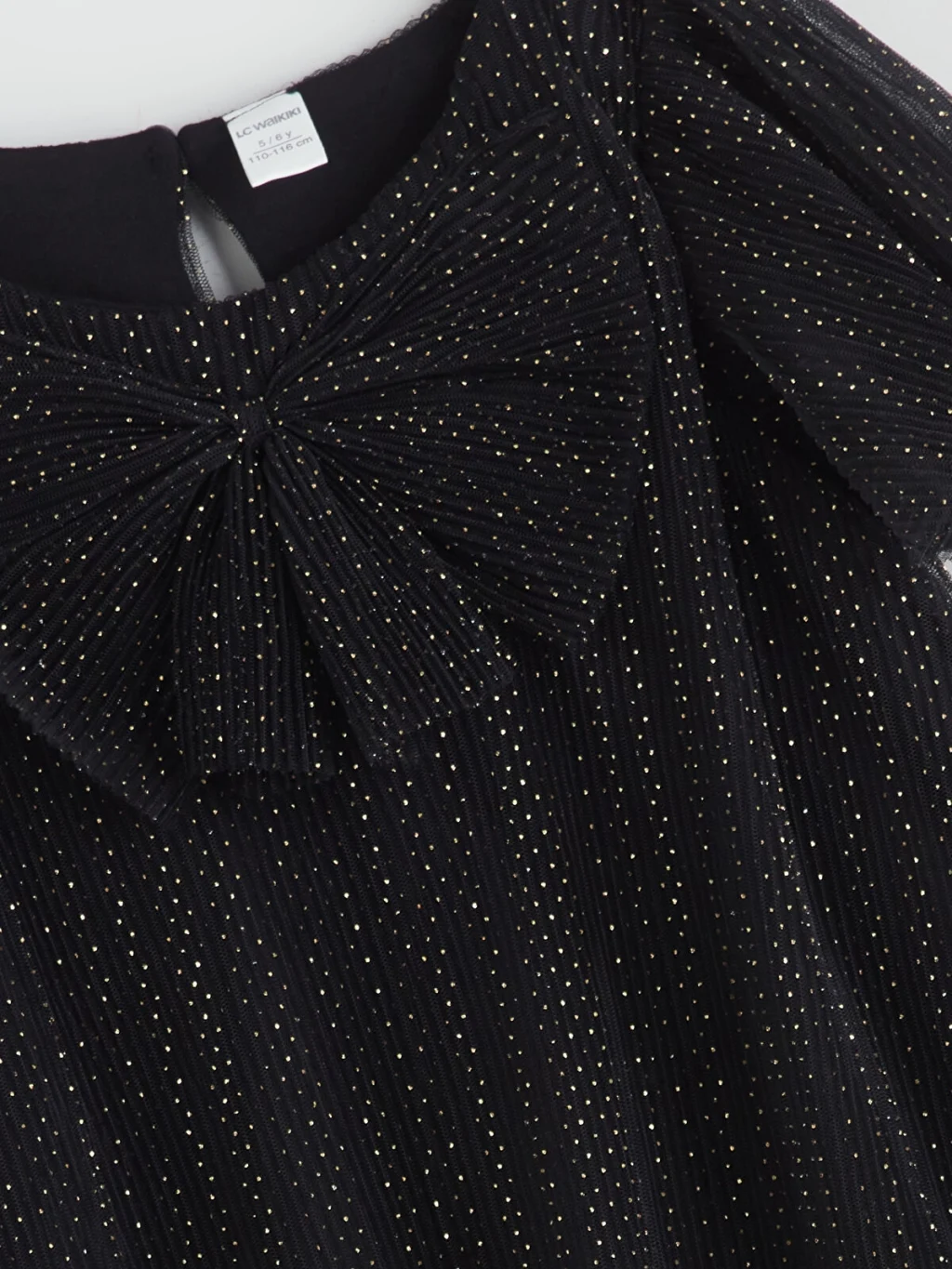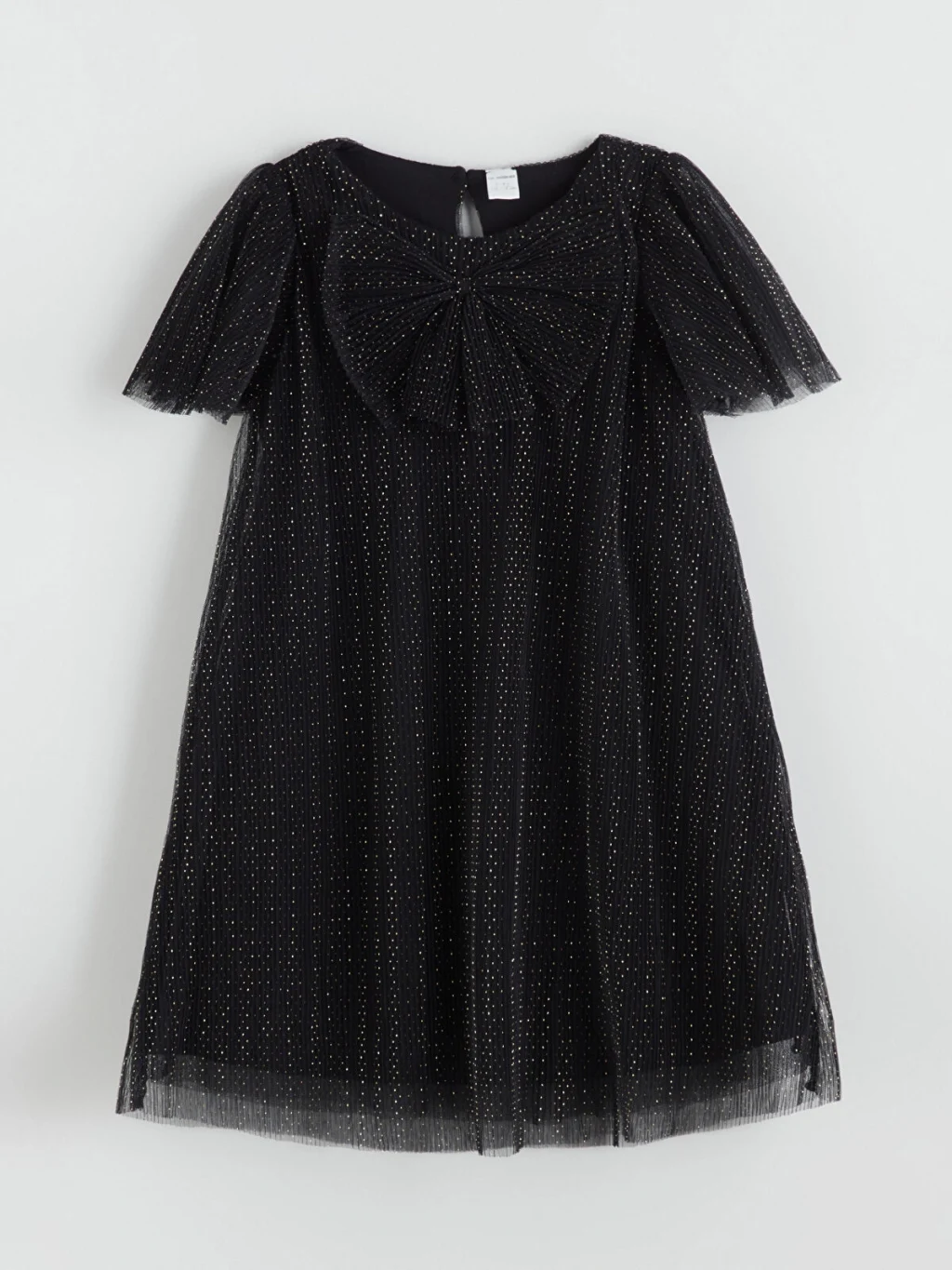 Bisiklet yaka, kısa kollu kız bebek elbise, önü fiyonk detaylıdır. Puantiye desenli dantel kumaştan üretilmiştir ve ensede düğme kapamalıdır.