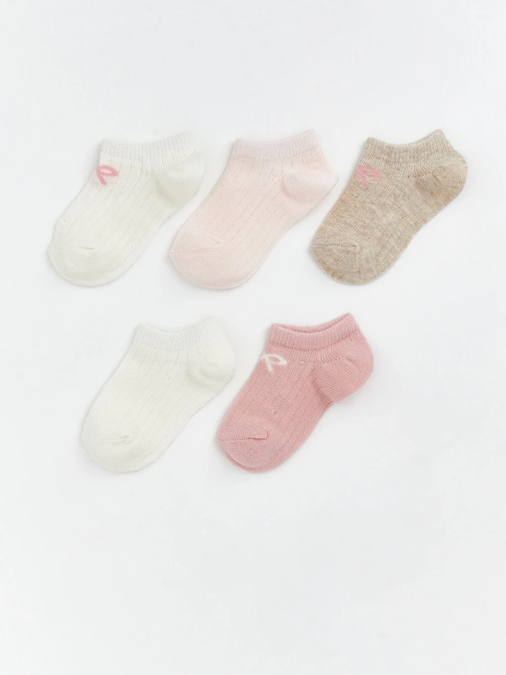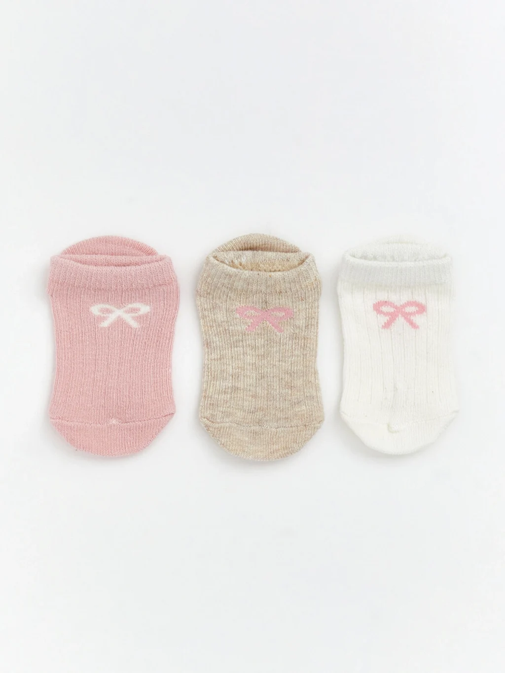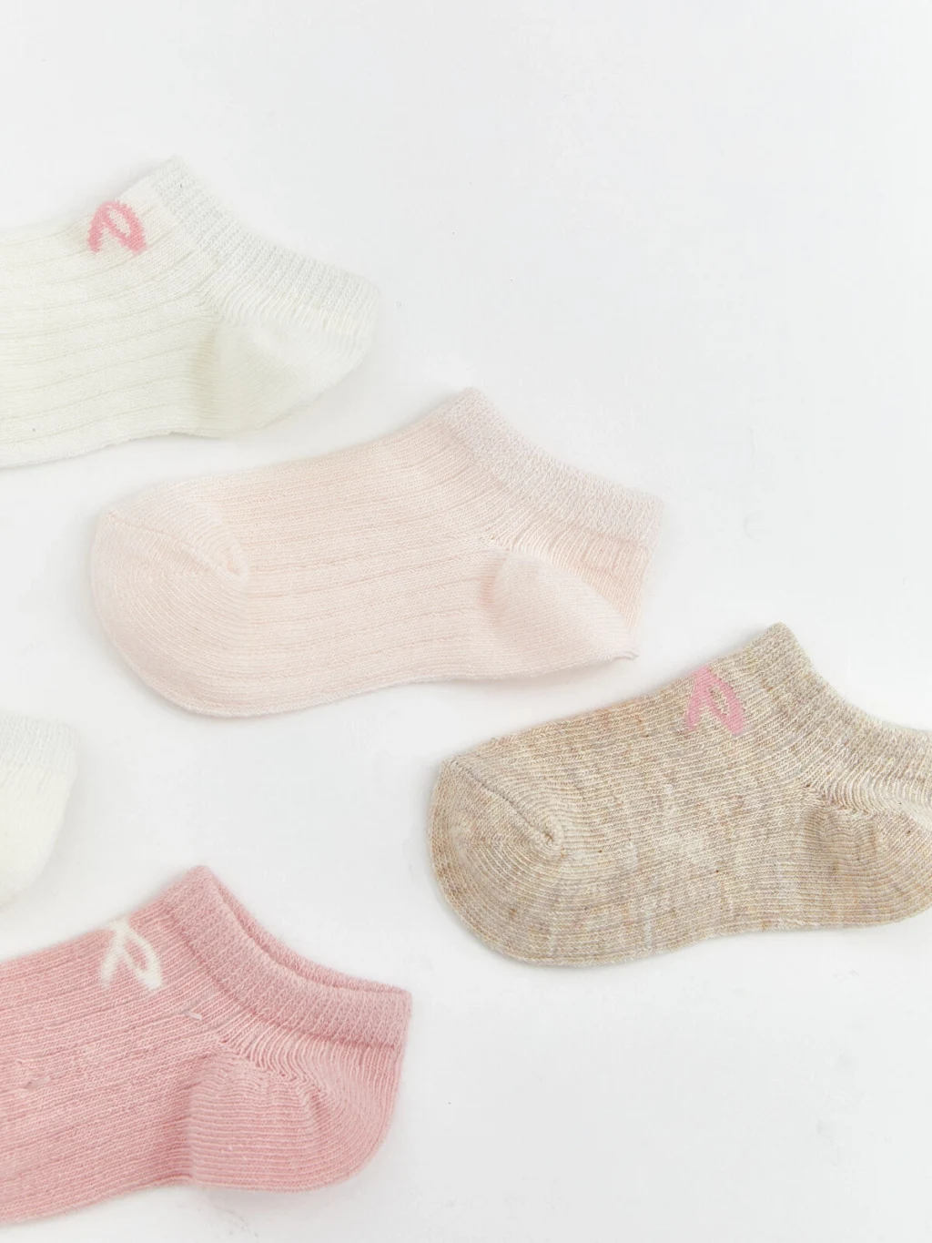 Ribana dokulu kumaştan üretilen kız bebek patik çorap seti, bazıları harf ve desen baskılı tasarıma sahiptir.