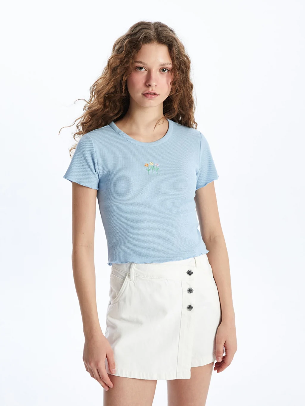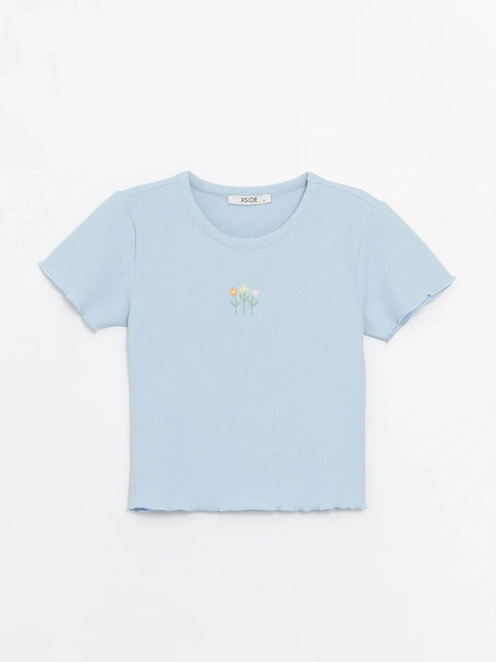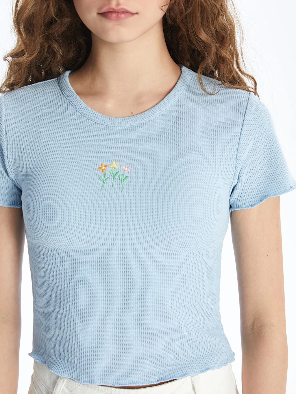 Bisiklet yaka nakışlı kısa kollu kadın tişört, günlük tarzınız için ideal bir seçim. Yumuşak dokusu ve dar kalıbıyla konforu ön planda tutarken, zarif nakış detayları ile stilinizi vurgular.