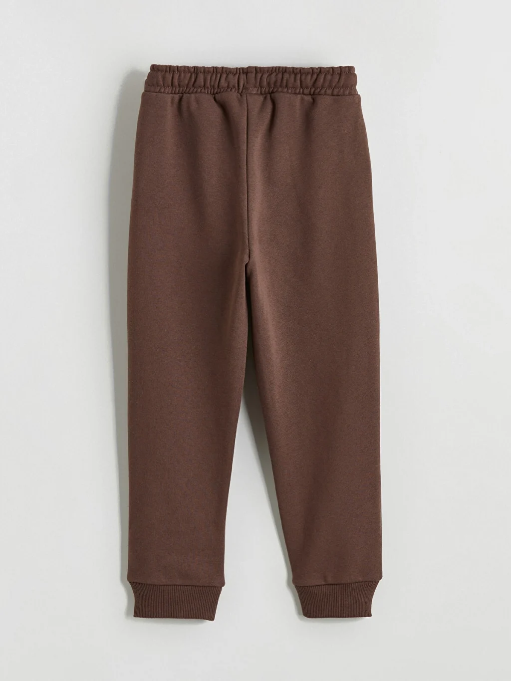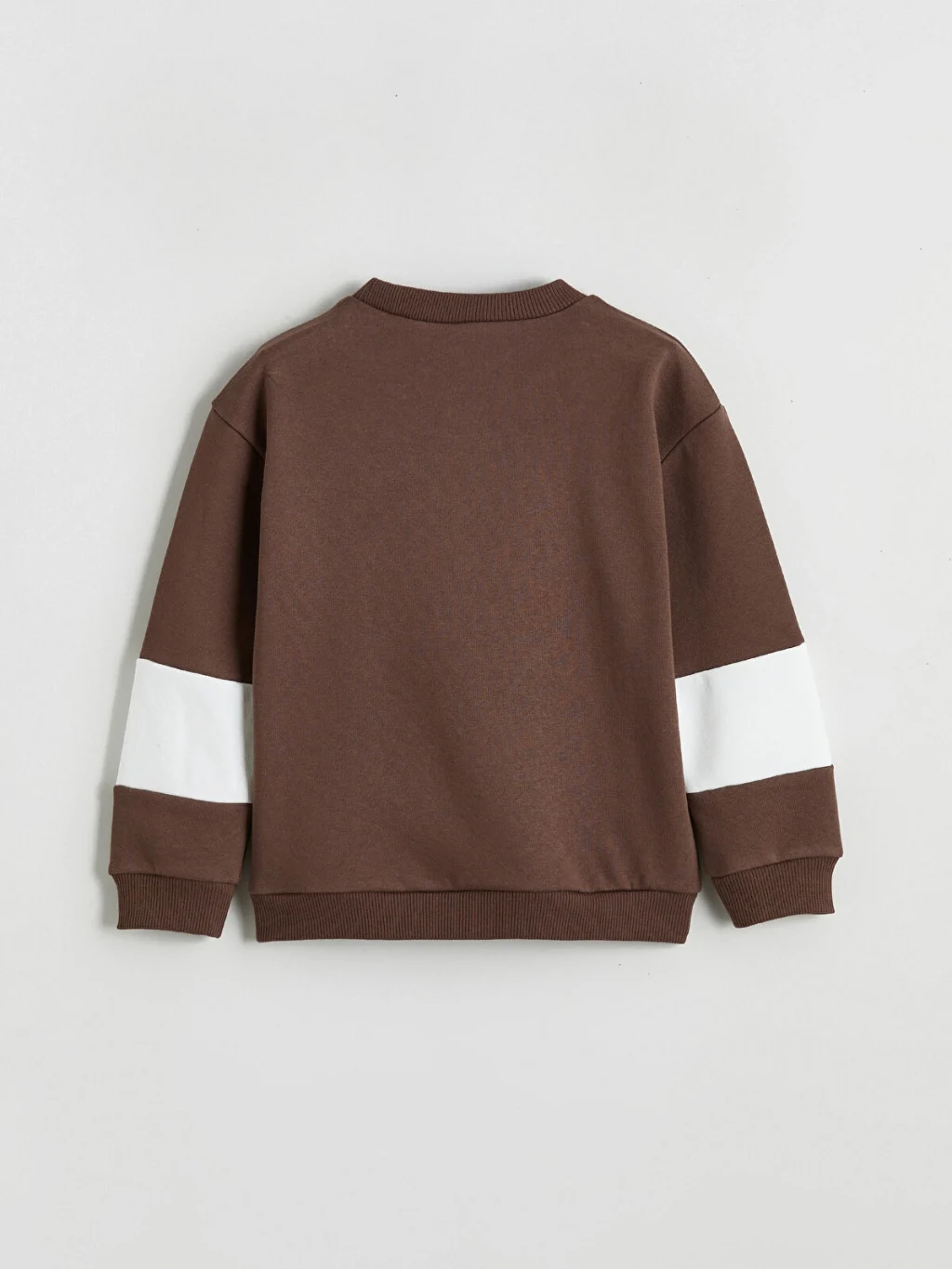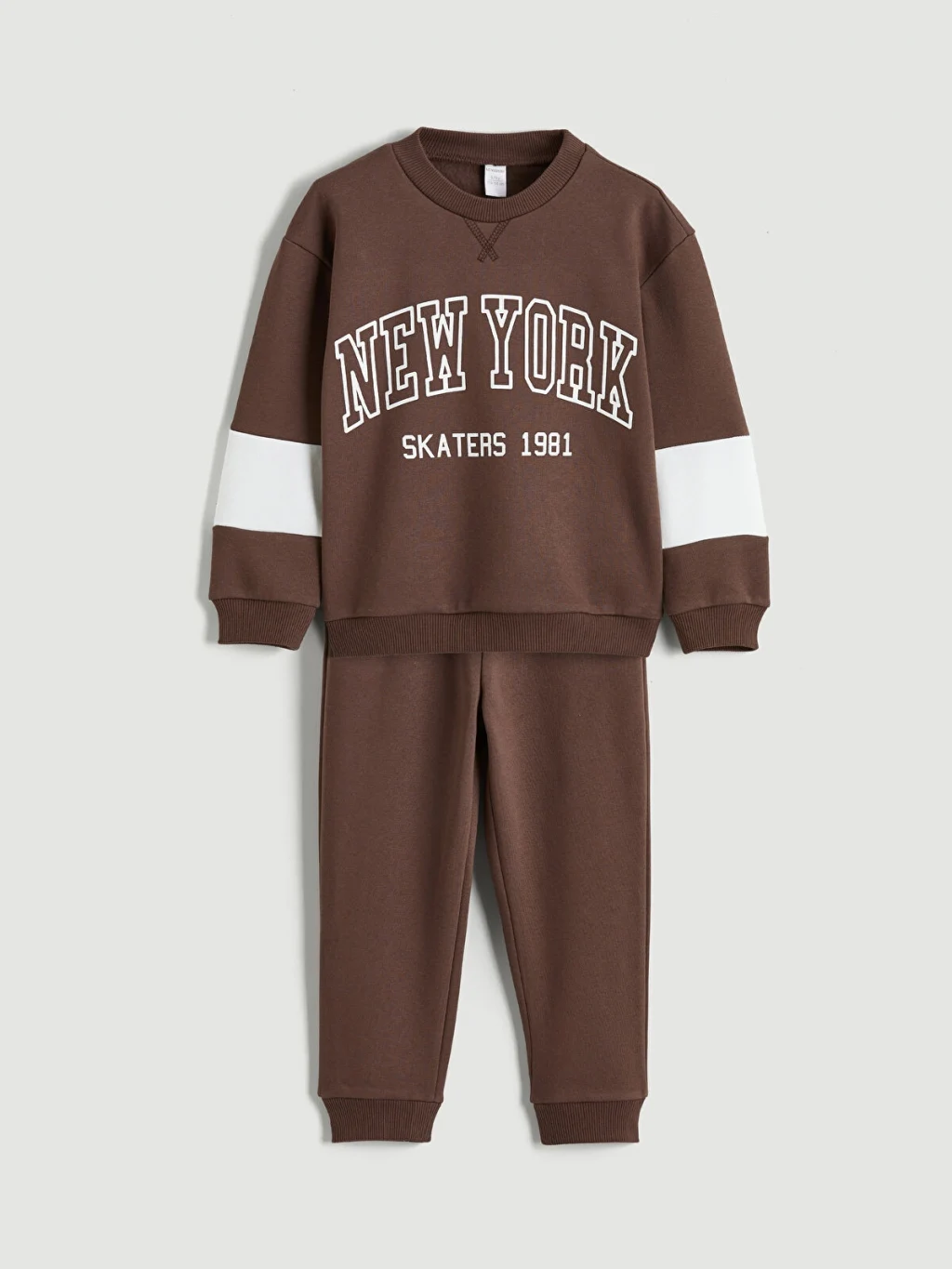 Üç iplik şardonlu kumaştan üretilen erkek çocuk takım, bisiklet yaka, uzun kollu, önü baskılı sweatshirt ve paçaları ribanalı eşofman altından oluşur.