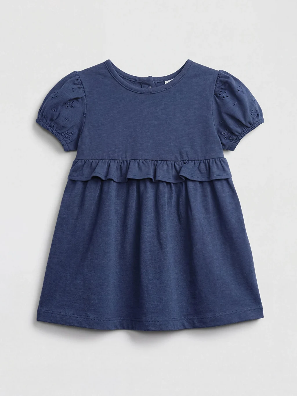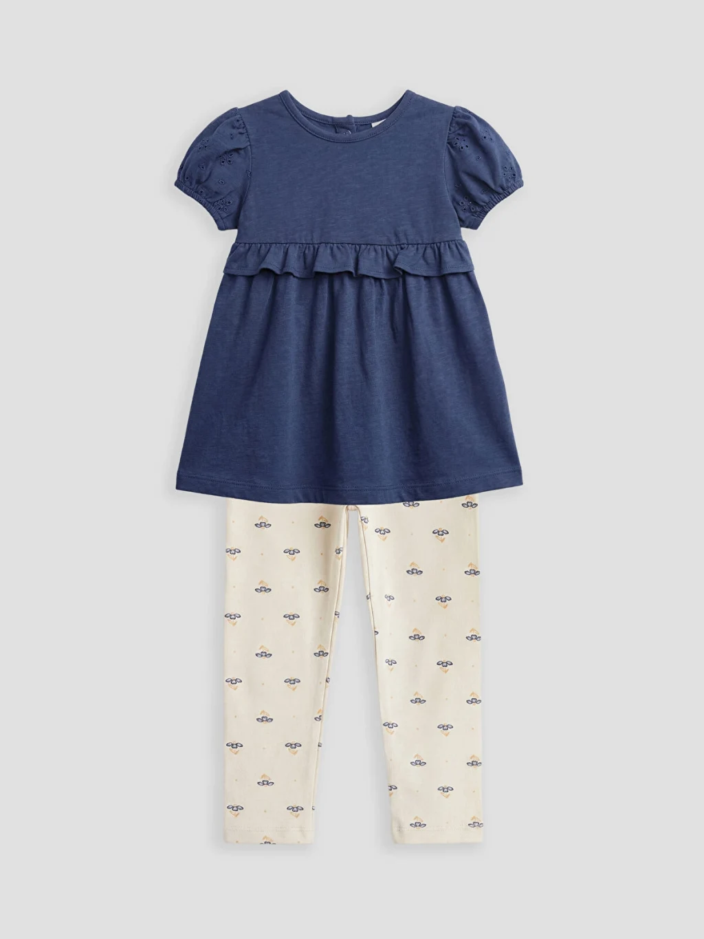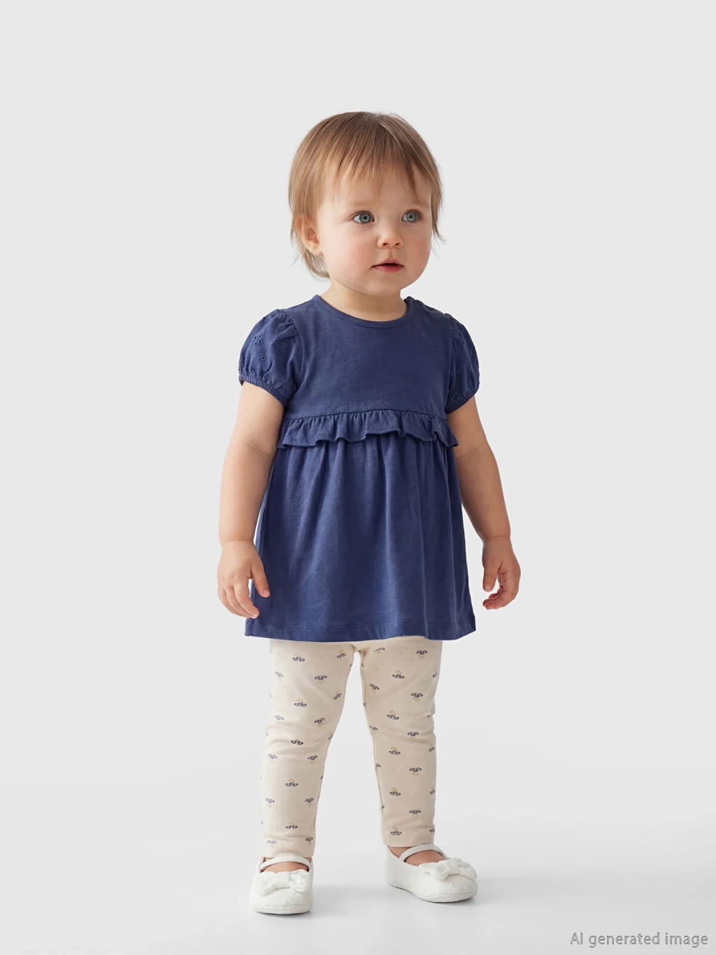 Bisiklet yaka, fisto detaylı kısa kollu, belde fırfırlı tişört ve desenli tayttan oluşan kız bebek takımı, %100 pamuk kumaşa sahiptir.