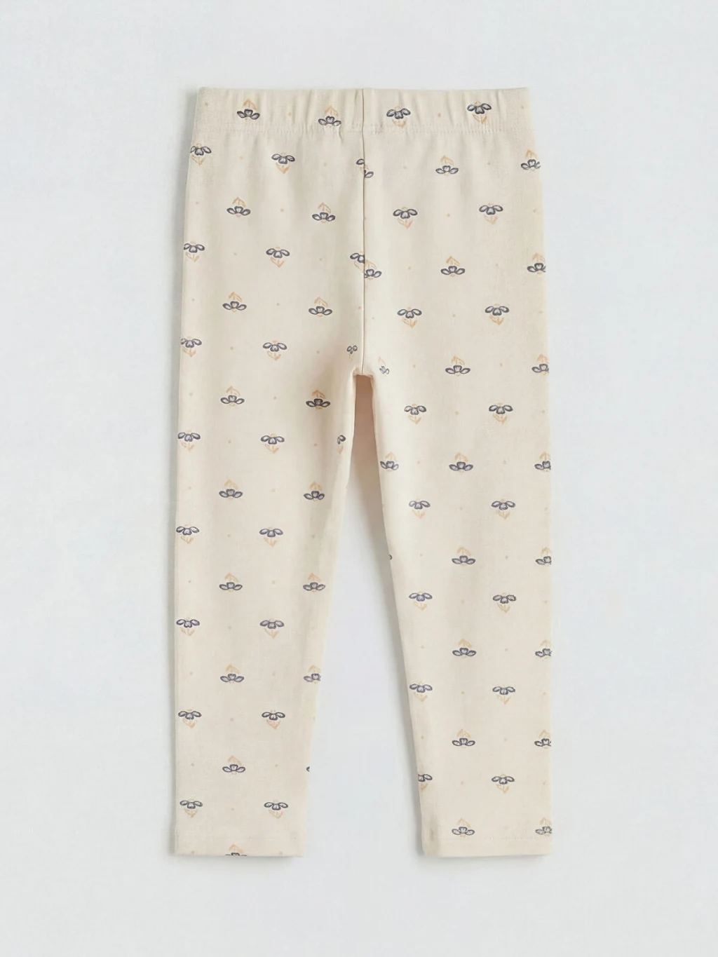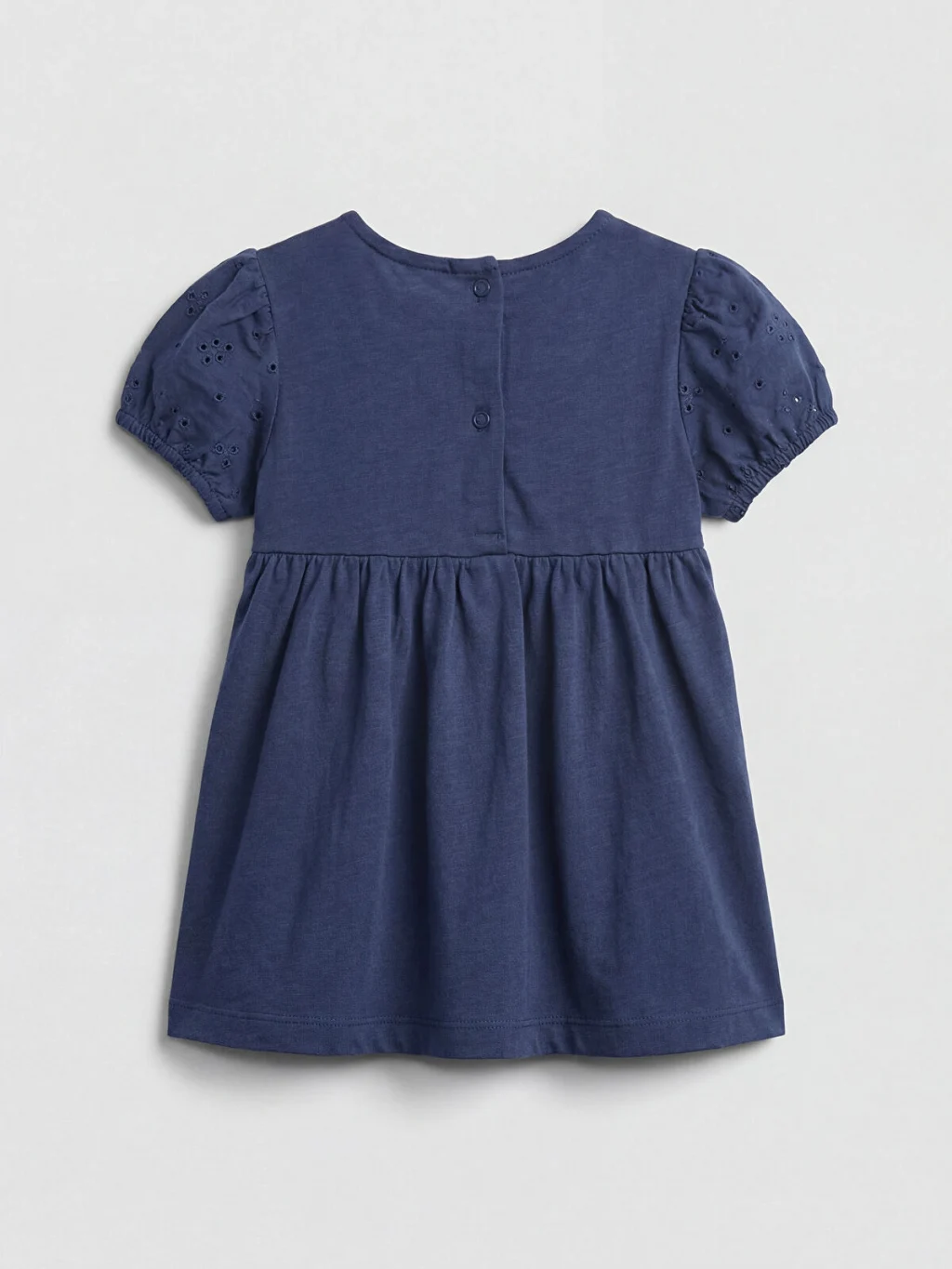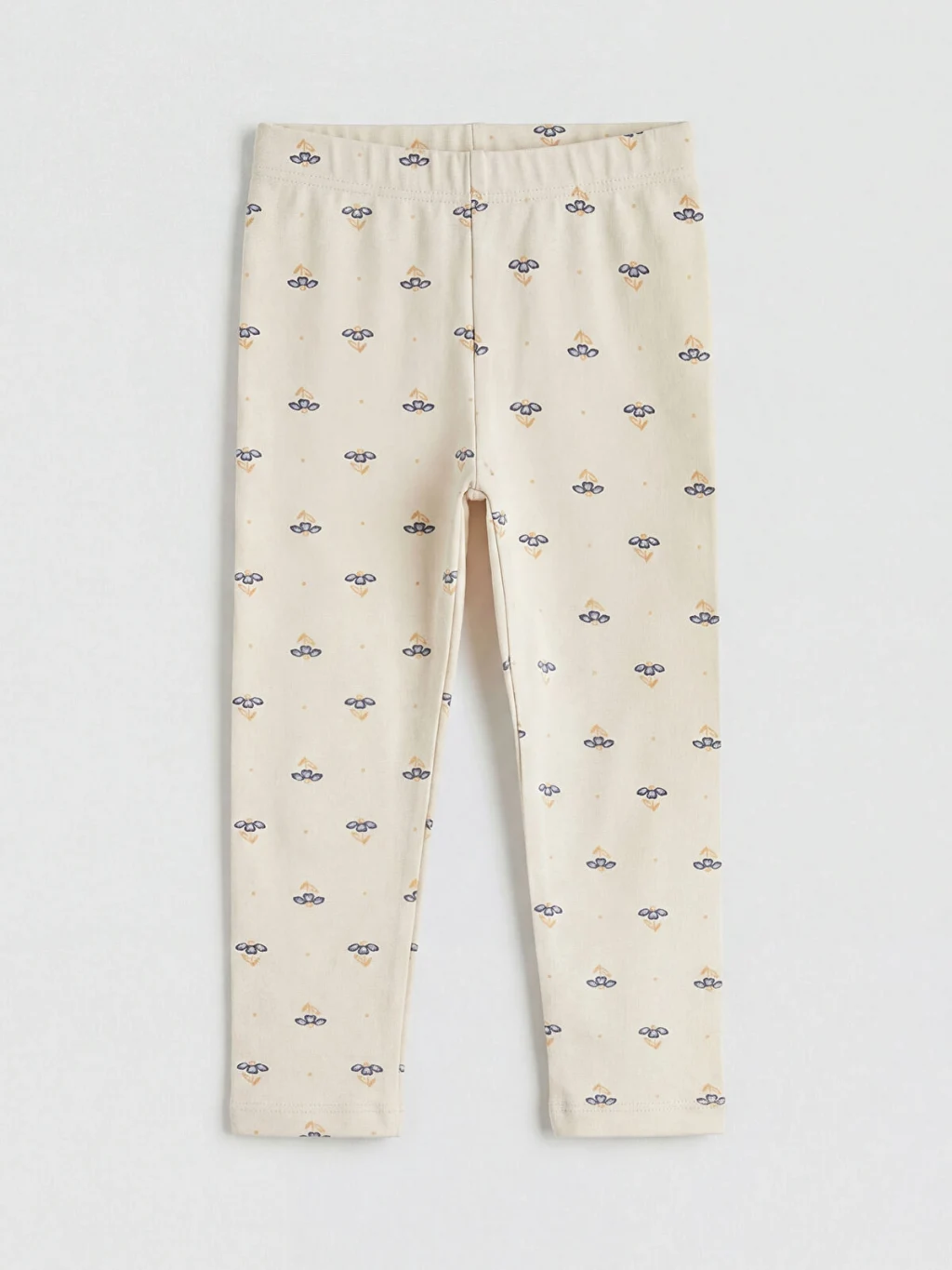 Bisiklet yaka, fisto detaylı kısa kollu, belde fırfırlı tişört ve desenli tayttan oluşan kız bebek takımı, %100 pamuk kumaşa sahiptir.