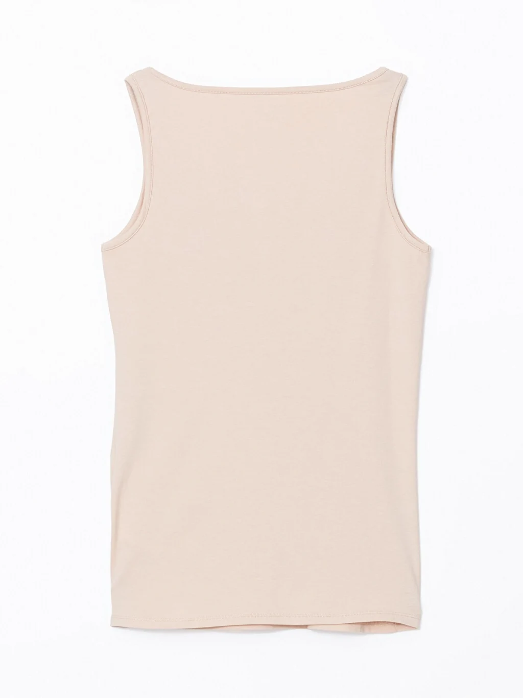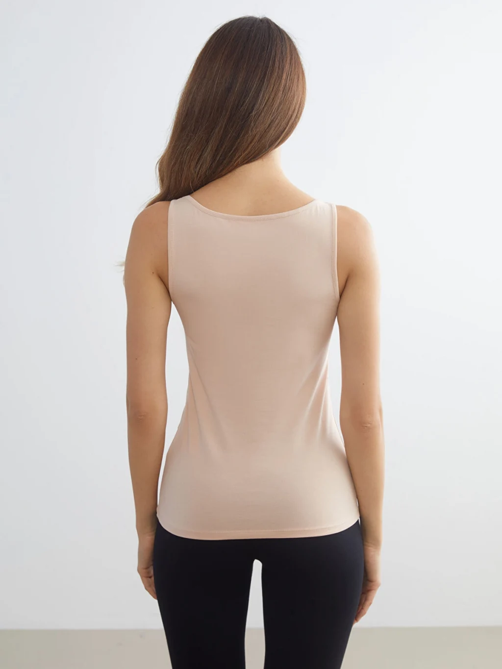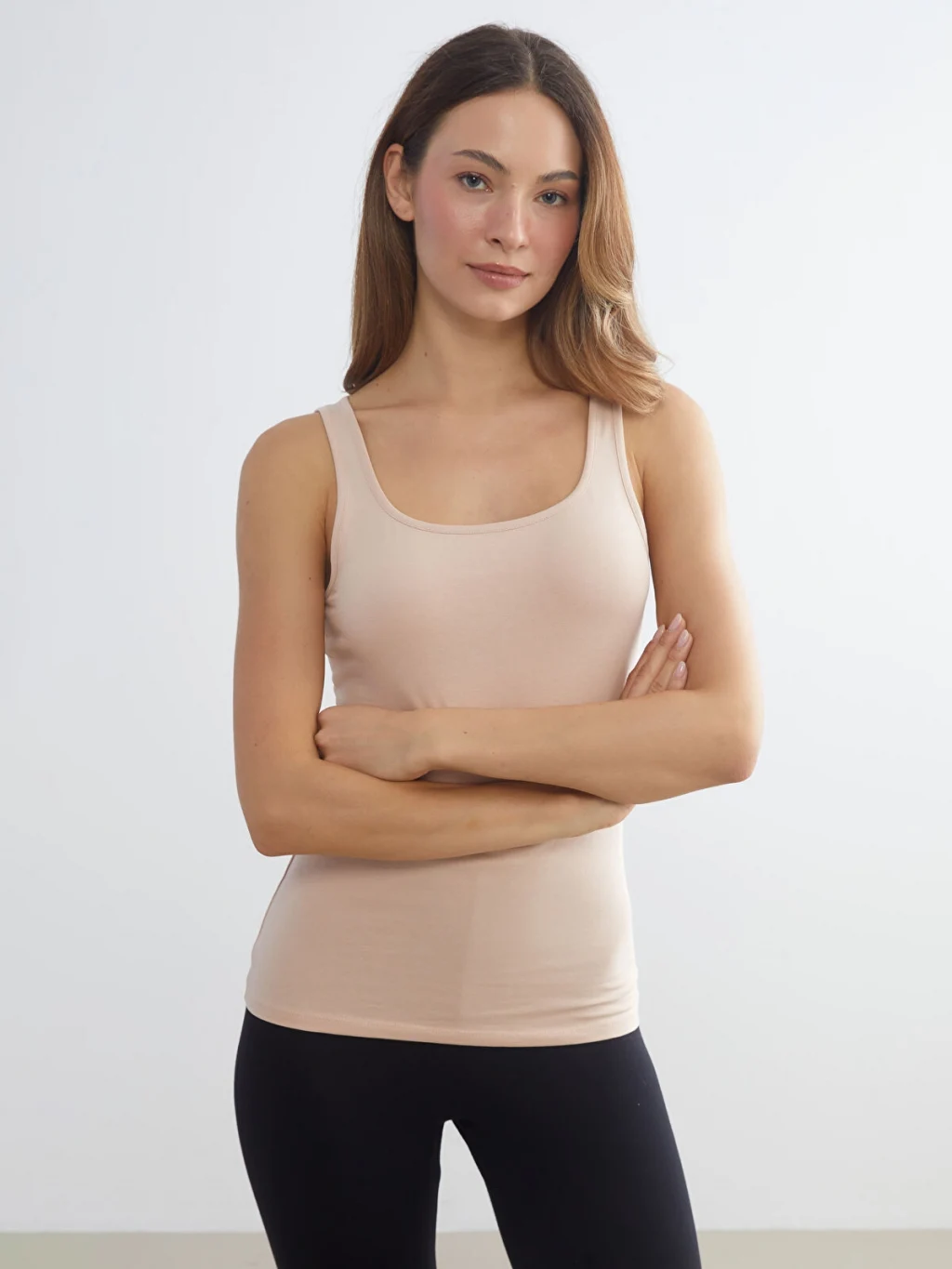 Yüksek pamuk içeren penye kumaştan üretilen kadın iç giyim atlet, U yakalı ve kalın askılı bir tasarıma sahiptir.
