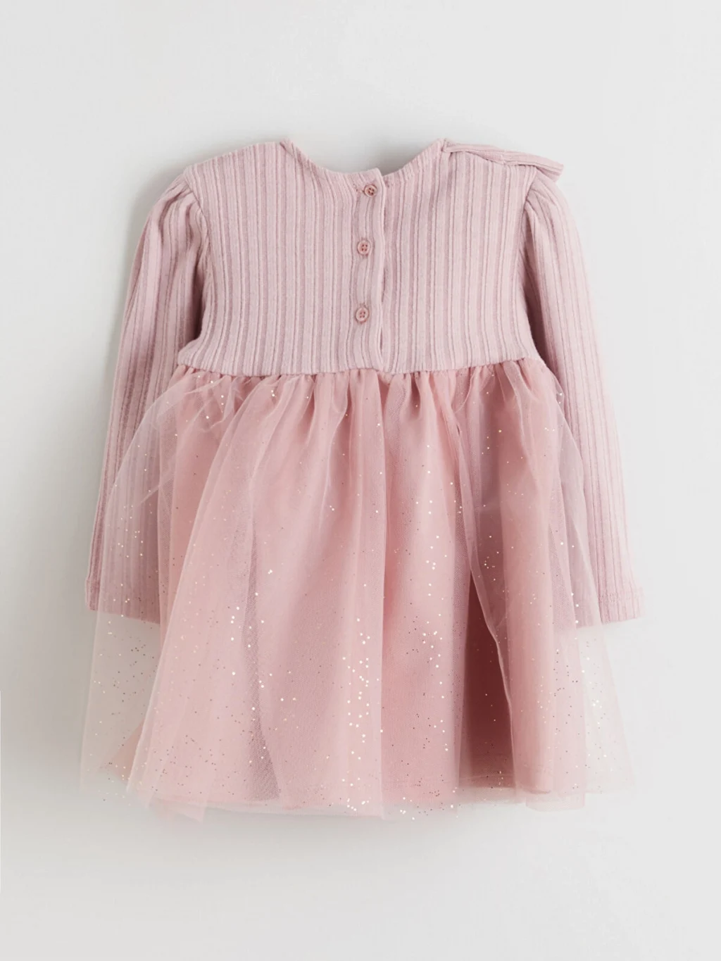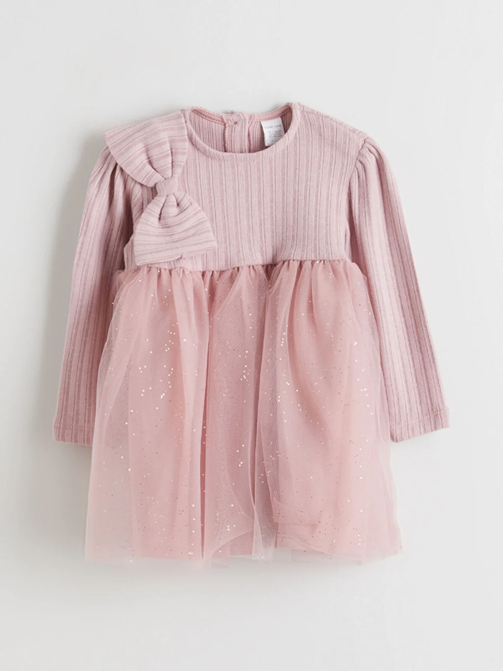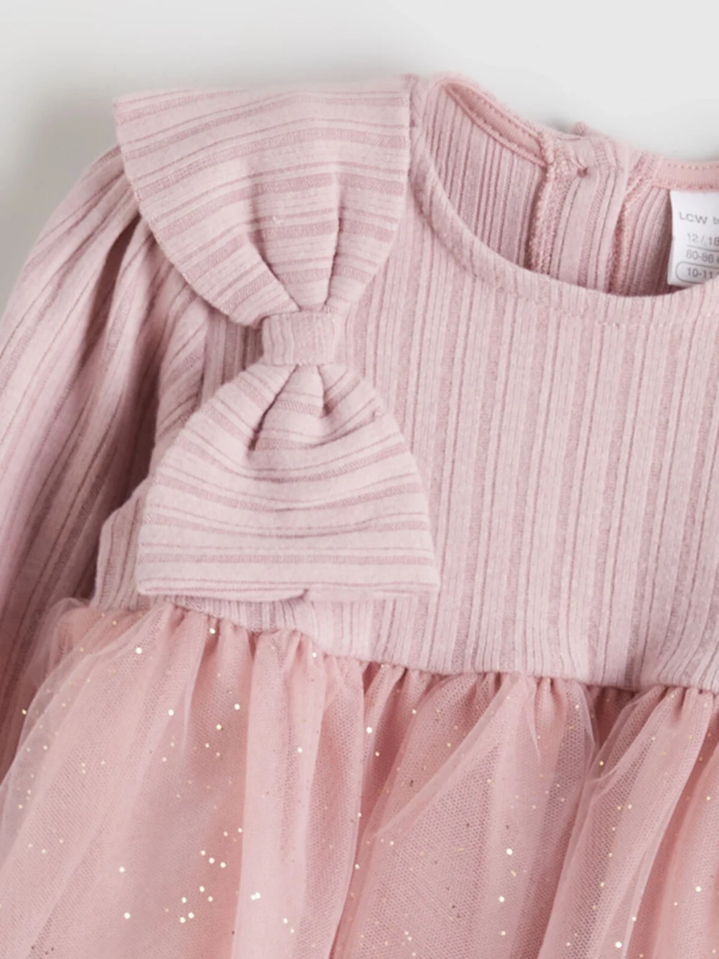 Bisiklet yaka ve uzun kollu kız bebek elbise, fitilli üst kısma, omuzda fiyonk detayına ve simli tül eteğe sahiptir. Arkadan düğme kapamalıdır.