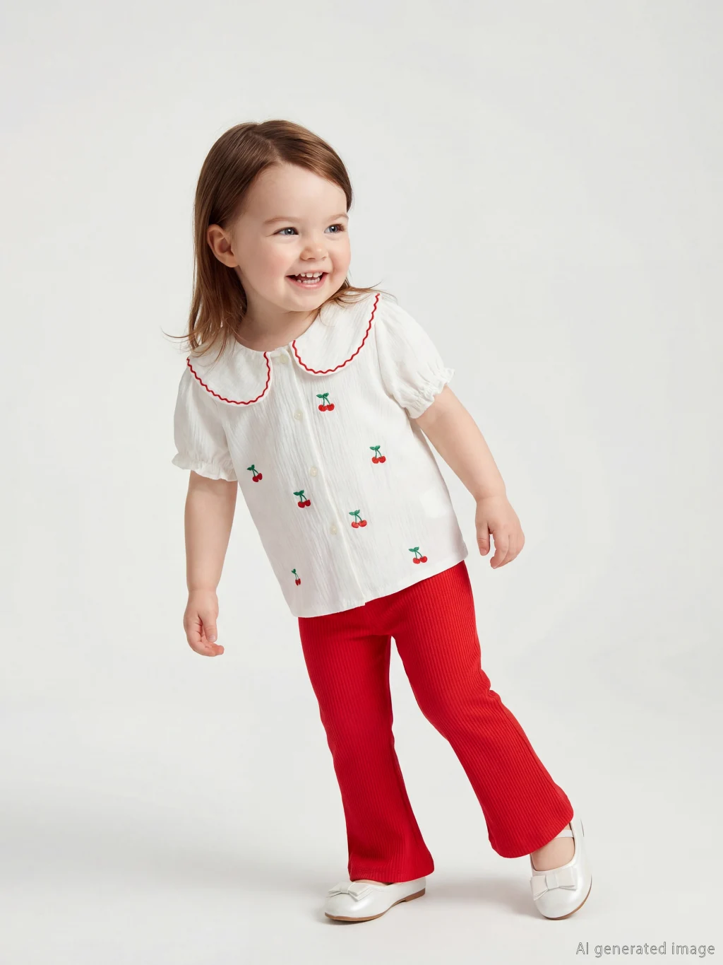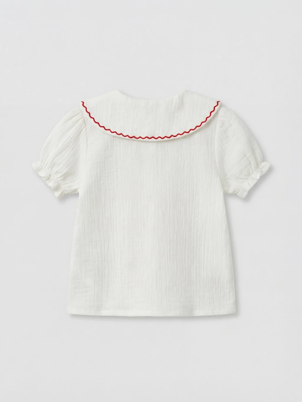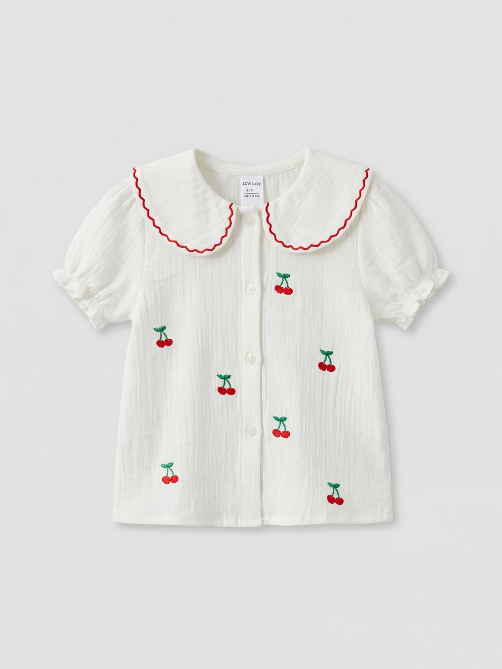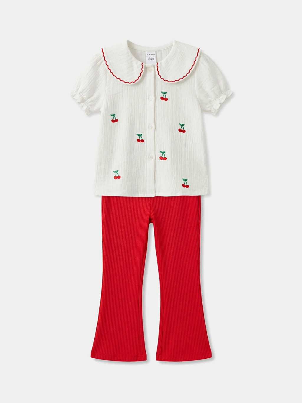 Kız bebek takım, bebe yaka, kısa kollu ve önden düğme kapamalı nakışlı müslin bluz ile ribanalı ispanyol paça pantolondan oluşur.